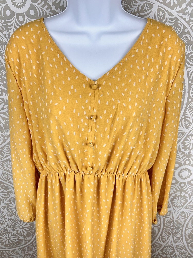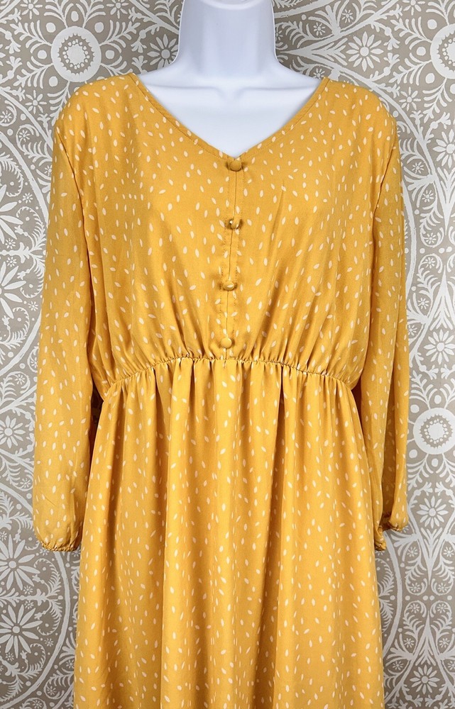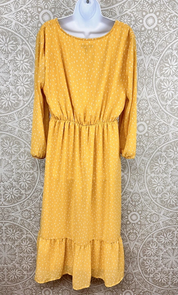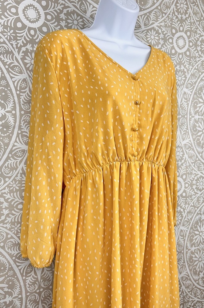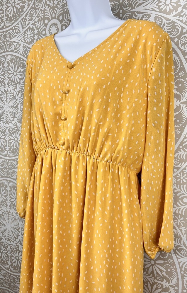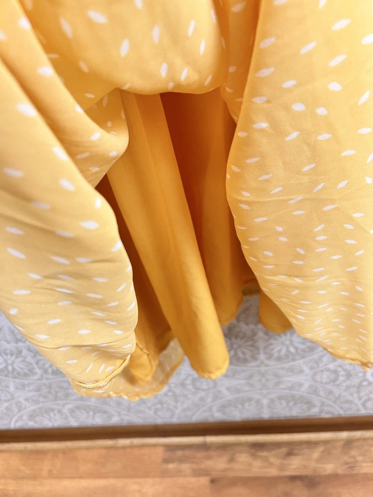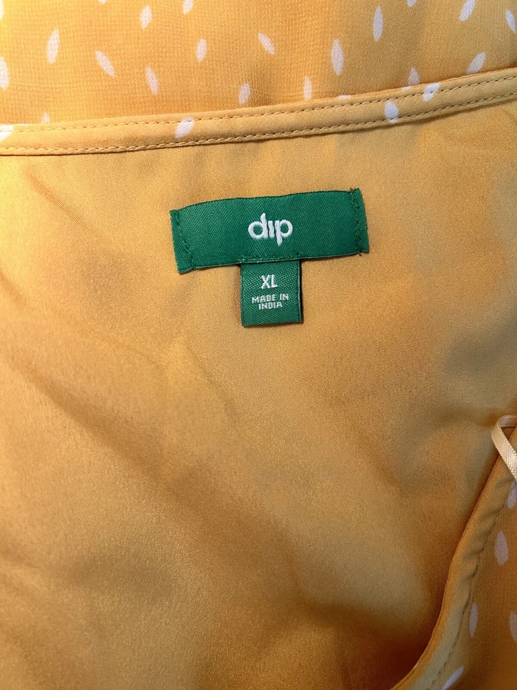 P Ships FAST!!! Chiffon Overlay Yellow Polka Dot Maxi Dress Sheer Puff Sleeve Lined Pull Over DIP Brand Made in India Size XL Length 48" Bust 46" Shoulder to shoulder 18" Sleeve 21" Preowned and Great Condition. See pictures for condition. Comes from Smoke Free Home. Please Contact with any questions! Thanks for looking at my store listings. Please take a look at what else I have for sale! I’m always happy to provide combined shipping discounts on multiple orders.