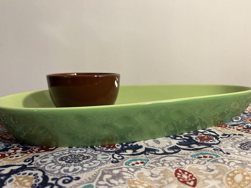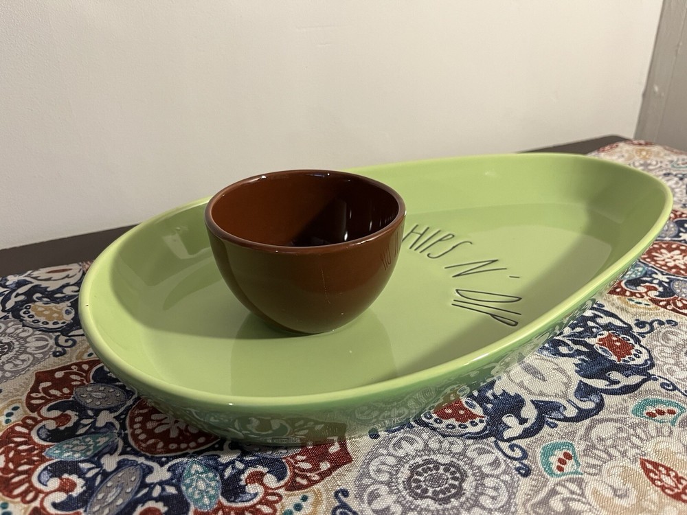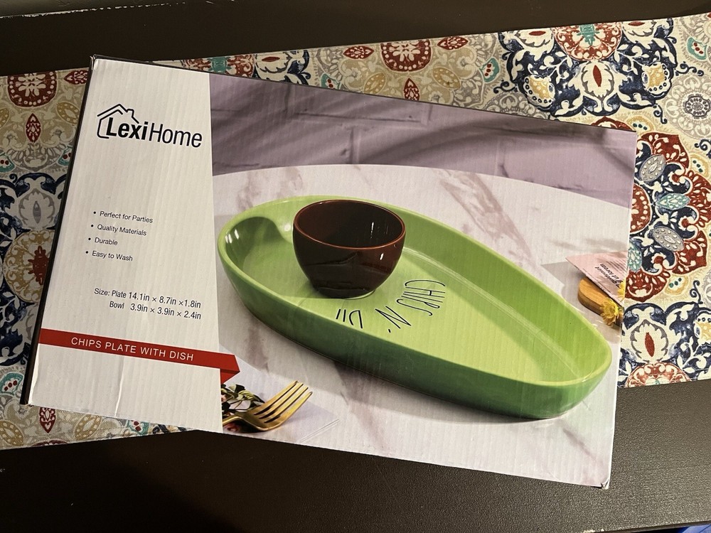 Chip And Dip Dish Avacado By LexiHome Party Tray In the style of Rae Dunn, new in box, packaging has been taped to reinforce, now damage to item. • Perfect for Parties • Quality Materials • Durable • Easy to Wash Size: Plate 14.1 in x 8.7in x1.8in Bowl 3.9in x 3.9in x 2.4in