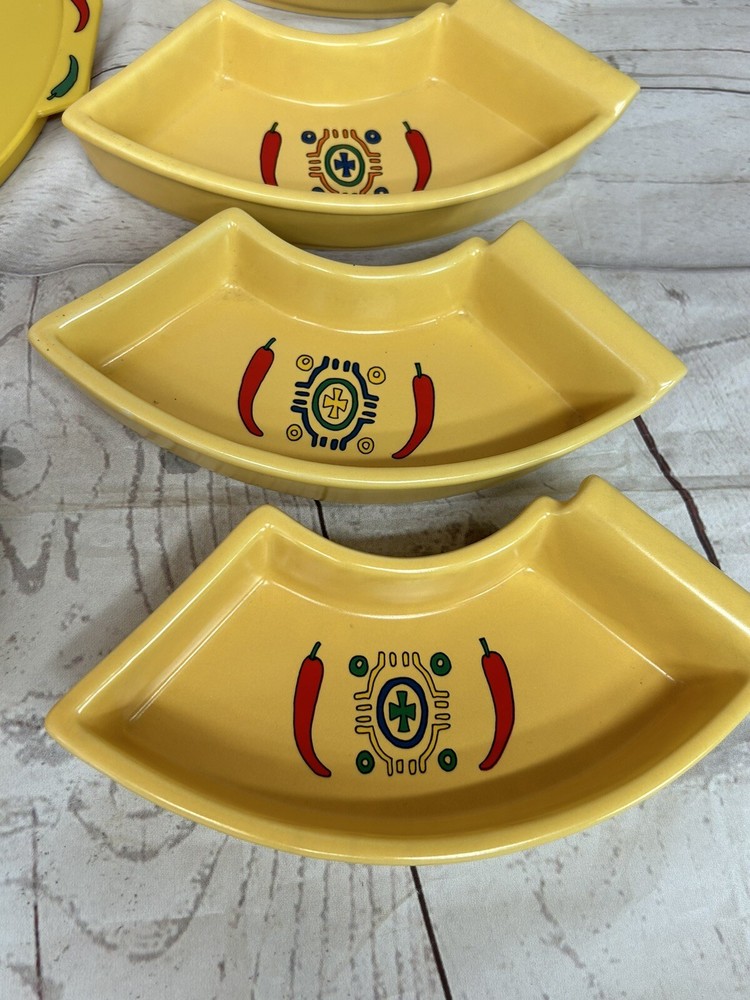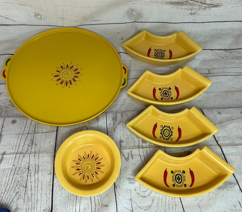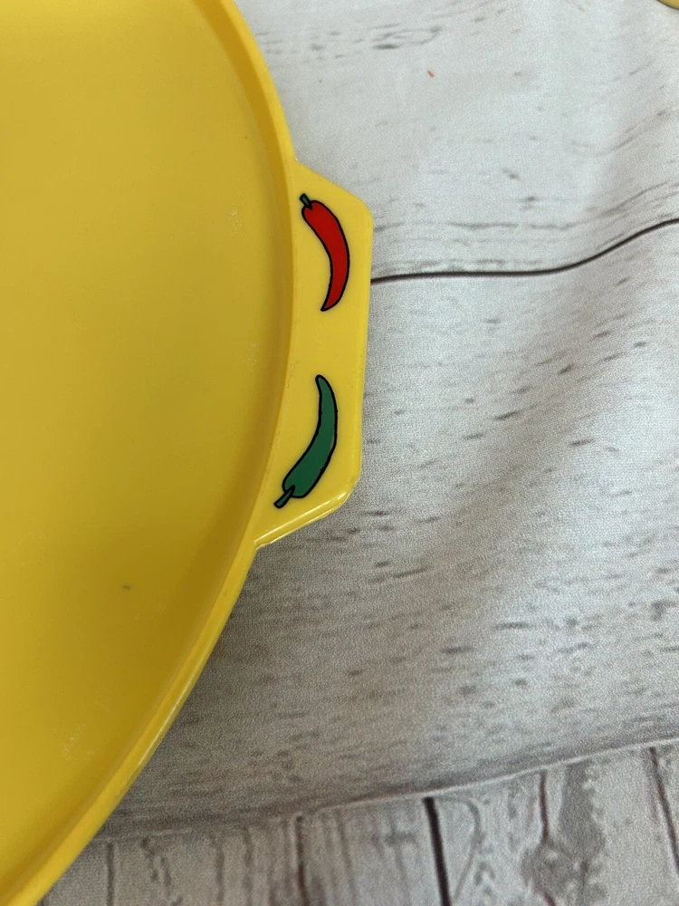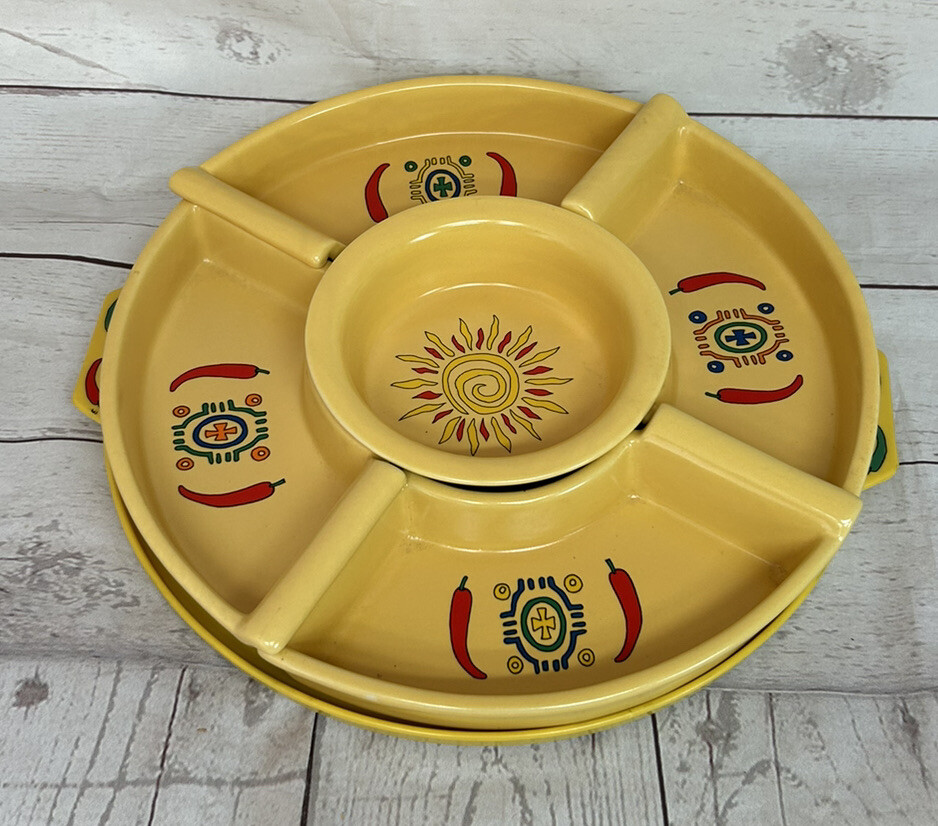 Sagaform 2005 Yellow Chili Sun Chip and Dip Tray Plastic tray will hold 5 bowls for chips and dips Perfect for taco Tuesday, Cinco De Mayo, parties, showers etc. . . Yellow with red chili peppers Blue and orange designs Sun design No chips or cracks Tray measures 12" in diameter bowls are 1 1/2" deep See all photos and ask any questions prior to purchasing