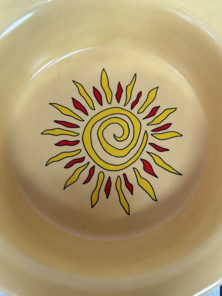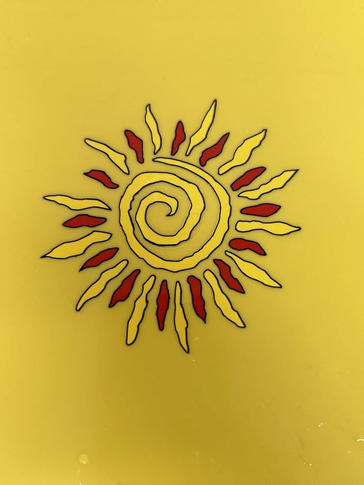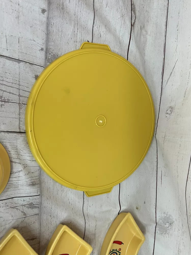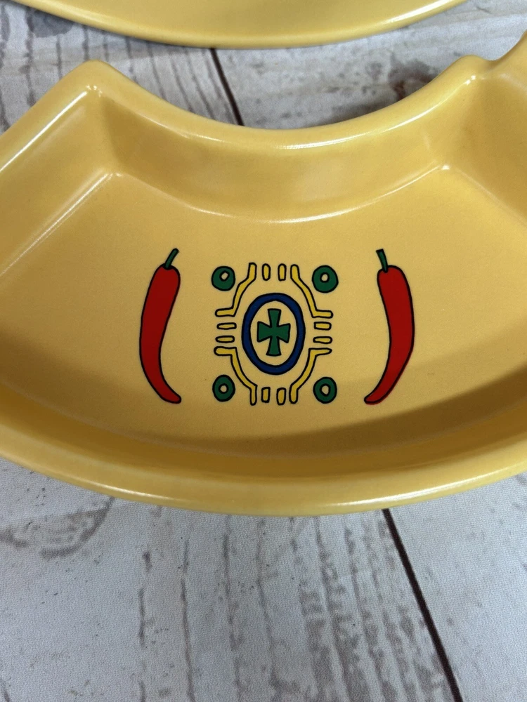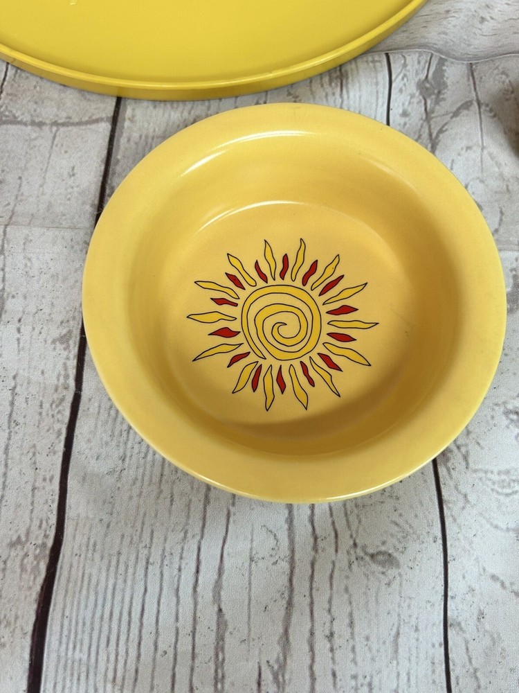 Sagaform 2005 Yellow Chili Sun Chip and Dip Tray Plastic tray will hold 5 bowls for chips and dips Perfect for taco Tuesday, Cinco De Mayo, parties, showers etc. . . Yellow with red chili peppers Blue and orange designs Sun design No chips or cracks Tray measures 12" in diameter bowls are 1 1/2" deep See all photos and ask any questions prior to purchasing