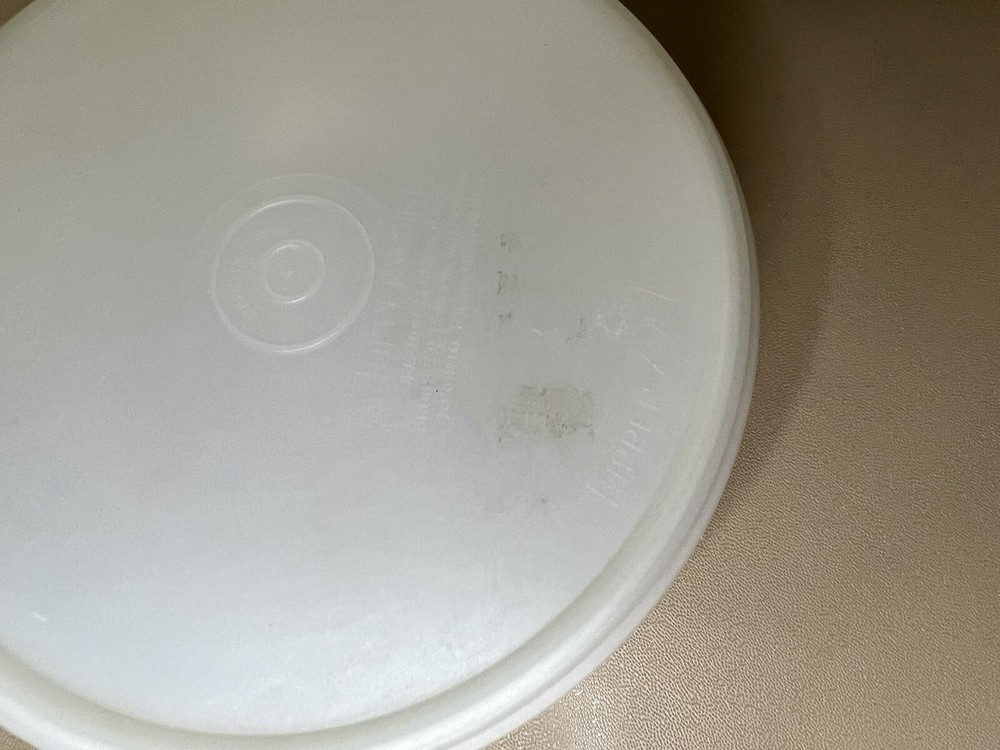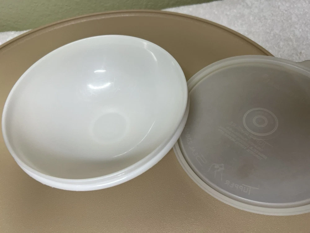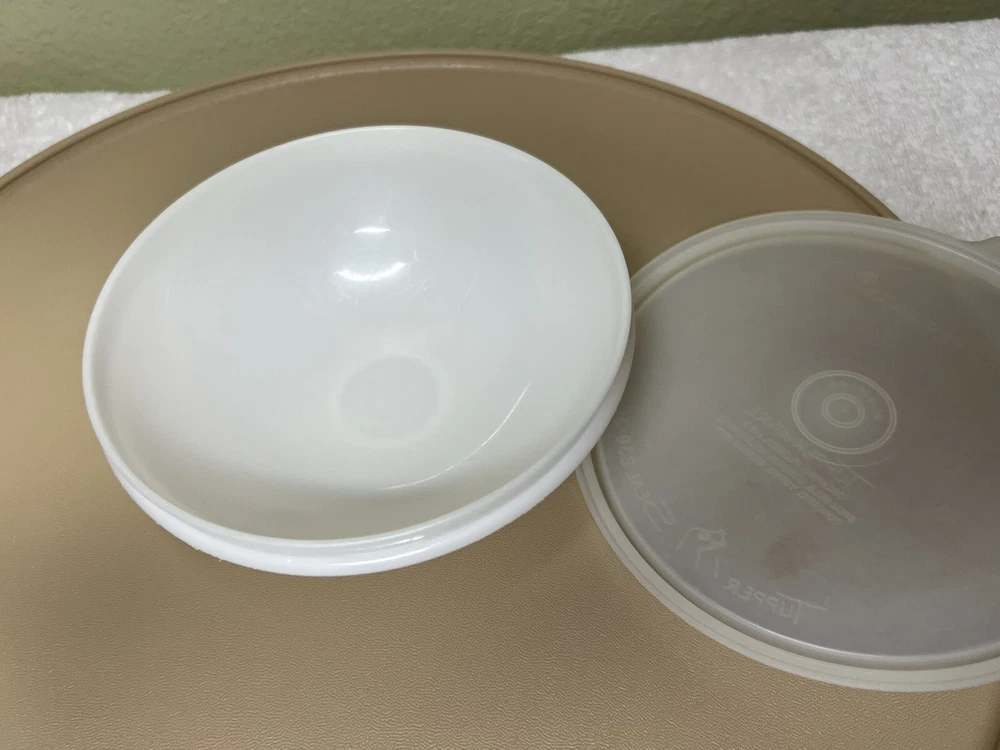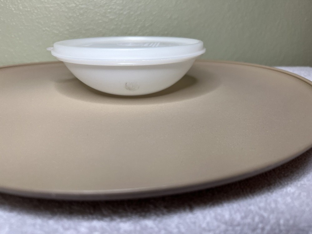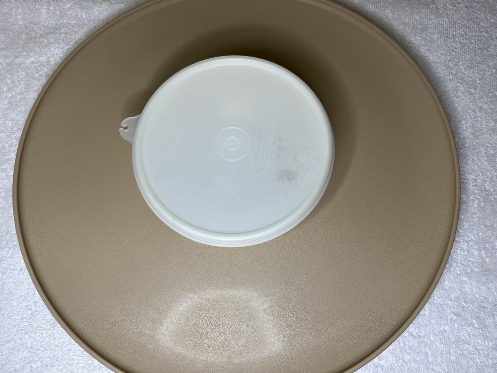 This vintage Tupperware chip and dip set includes a 14-inch round tray, a lid, and a 6-inch diameter, 2.5-inch deep dip white bowl. The beige color tray and round shape add a touch of classic elegance to any party or gathering. The tray is designed to hold the dip bowl securely and has a height of 7 inches including tray, bowl and lid. The set is from the 1970s and is in good working order. Use this Tupperware chip and dip set to serve your favorite appetizers and snacks.