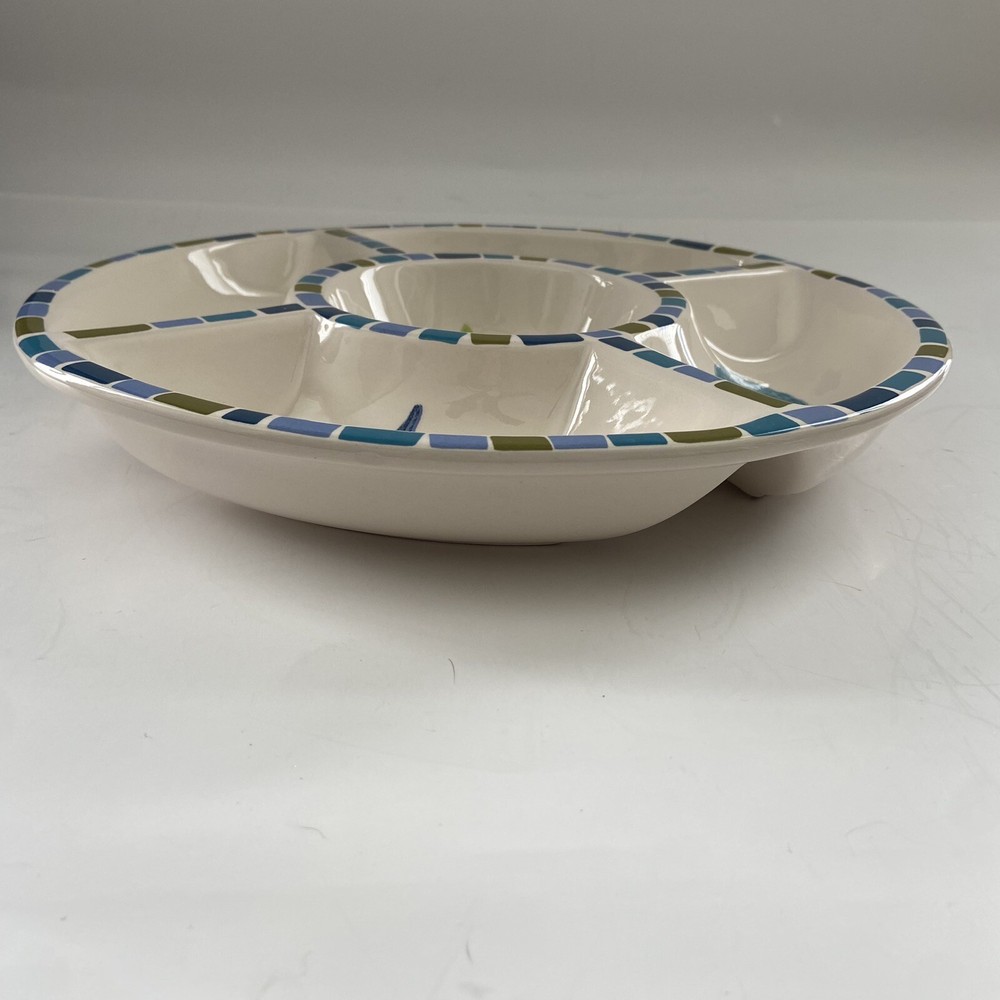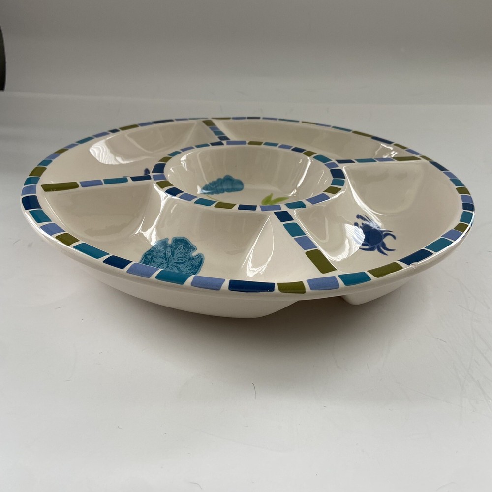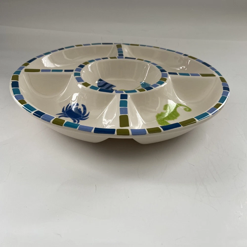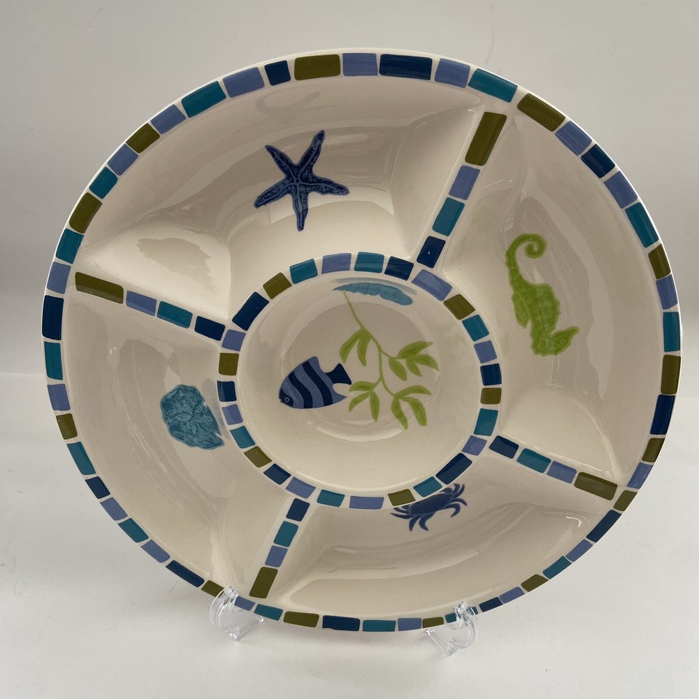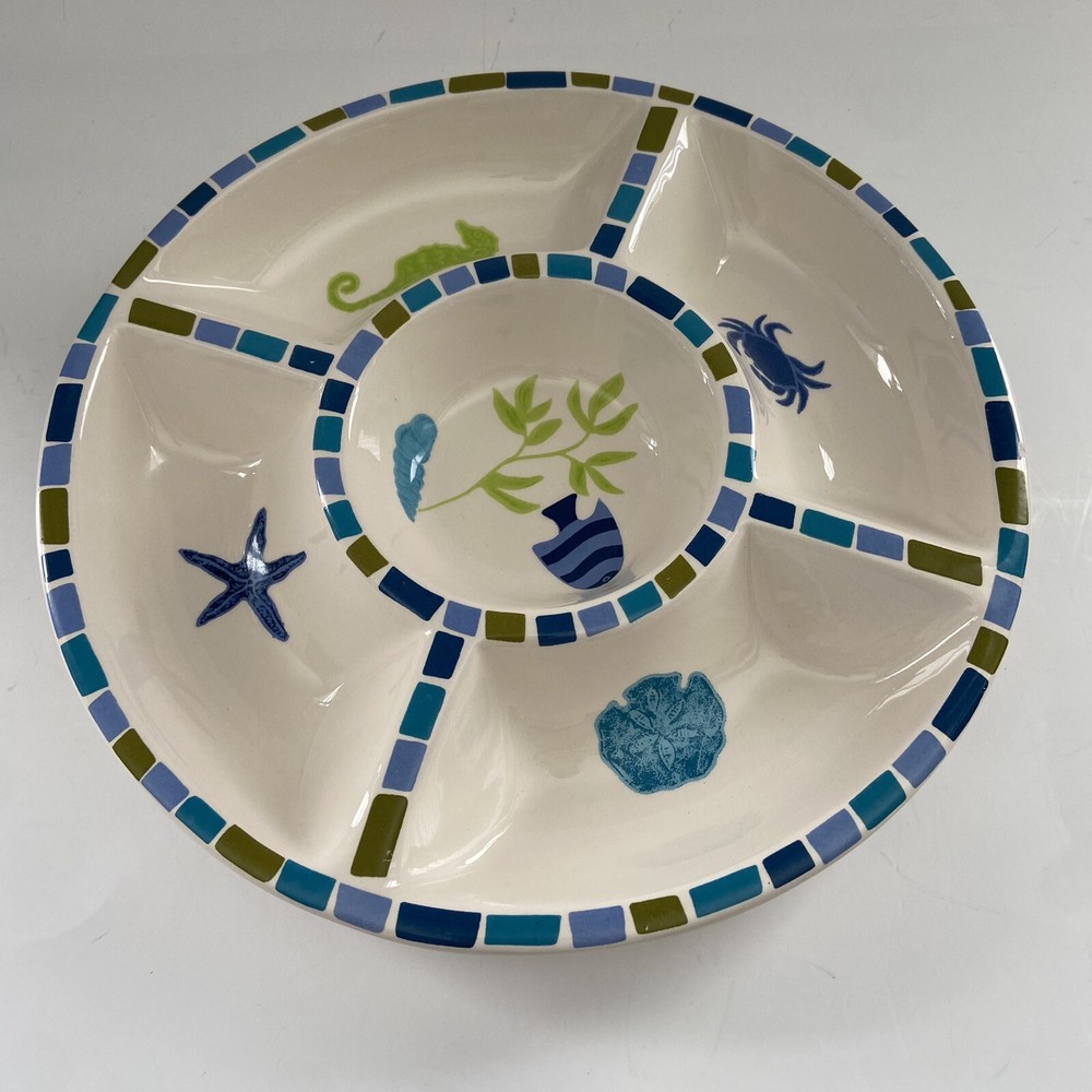 Vintage Sea Life Beqchy Chip n Dip 5 Compartment Serving Platter perfect for a summer beach pool party. Features Seahorse, Crab, Starfish, Sand Dollar and Sea weed with blue and green accent colors. Great preowned condition except for one small flea bite chip( see photo) and some wear on bottom due to storage/ shelve sitting. Approximately 12.25 “ x 12.25” x 2” Ships quickly and packaged with care. Thank you for looking. We strive to provide excellent customer service and quality unique items. If you have any questions or need additional photos just let us know. Have a great day.