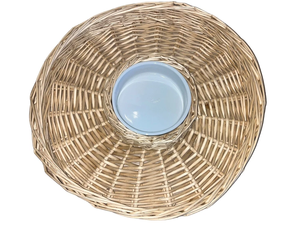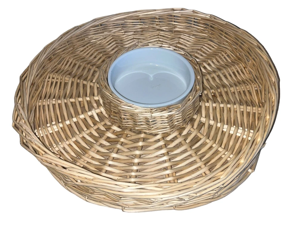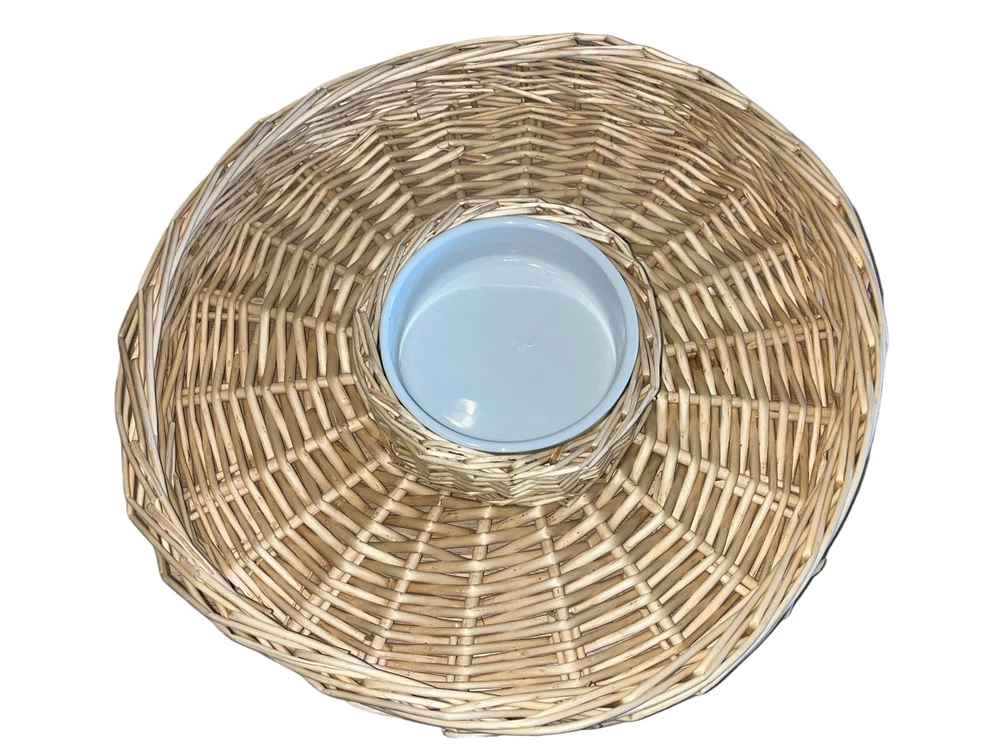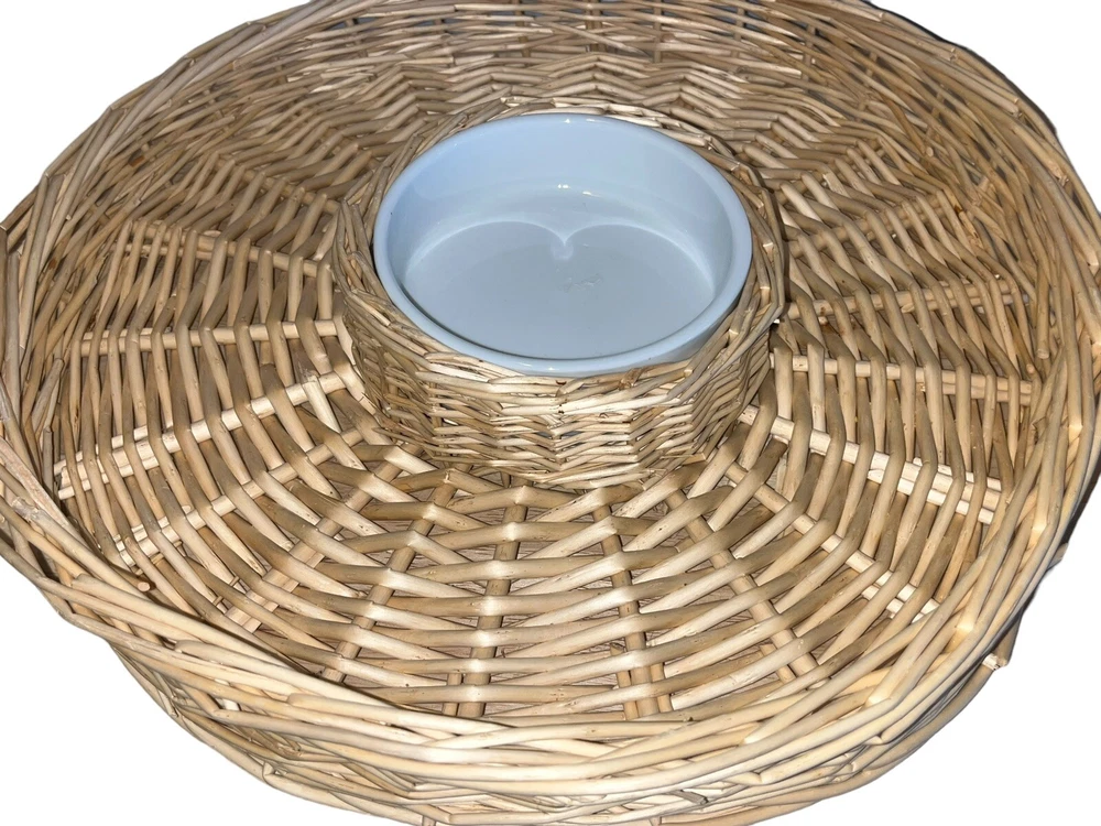 This wicker woven chip and dip platter is perfect for all occasions. The platter has a rustic finish and features a round shape with two compartments. The platter is made of high-quality rattan that adds to its durability and style. The platter also comes with a large white ceramic bowl that is perfect for serving dips or sauces. The platter is 16 inches long and is light brown in color.