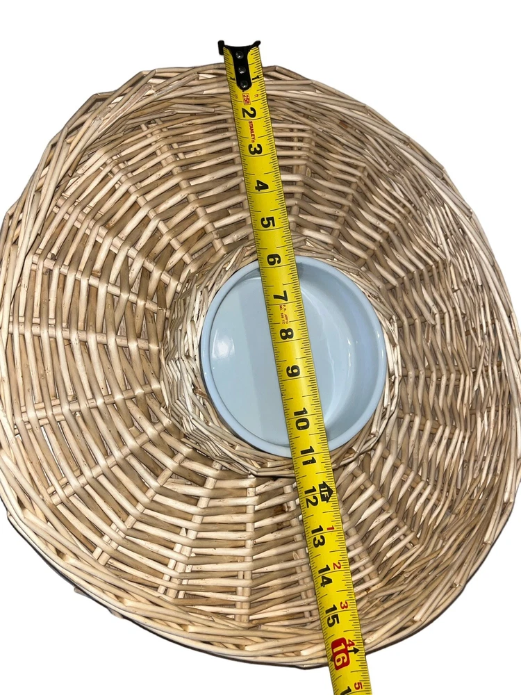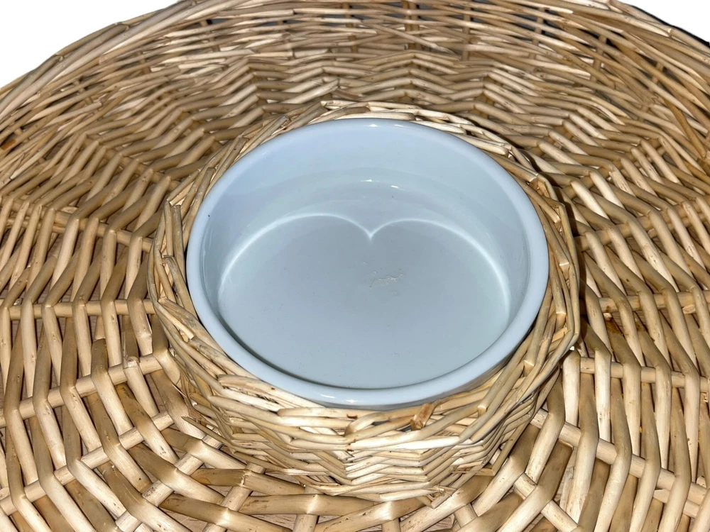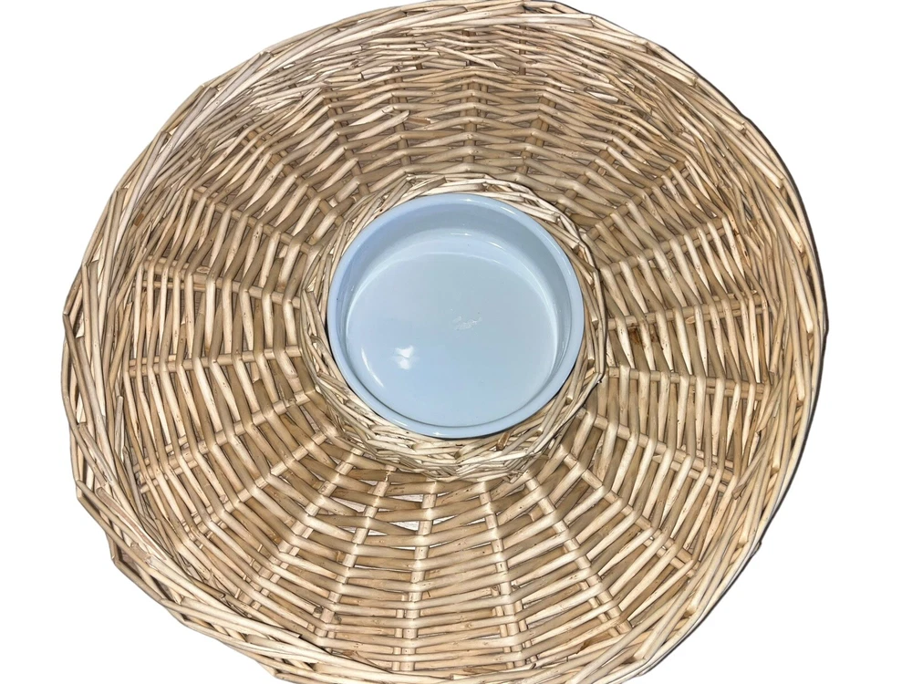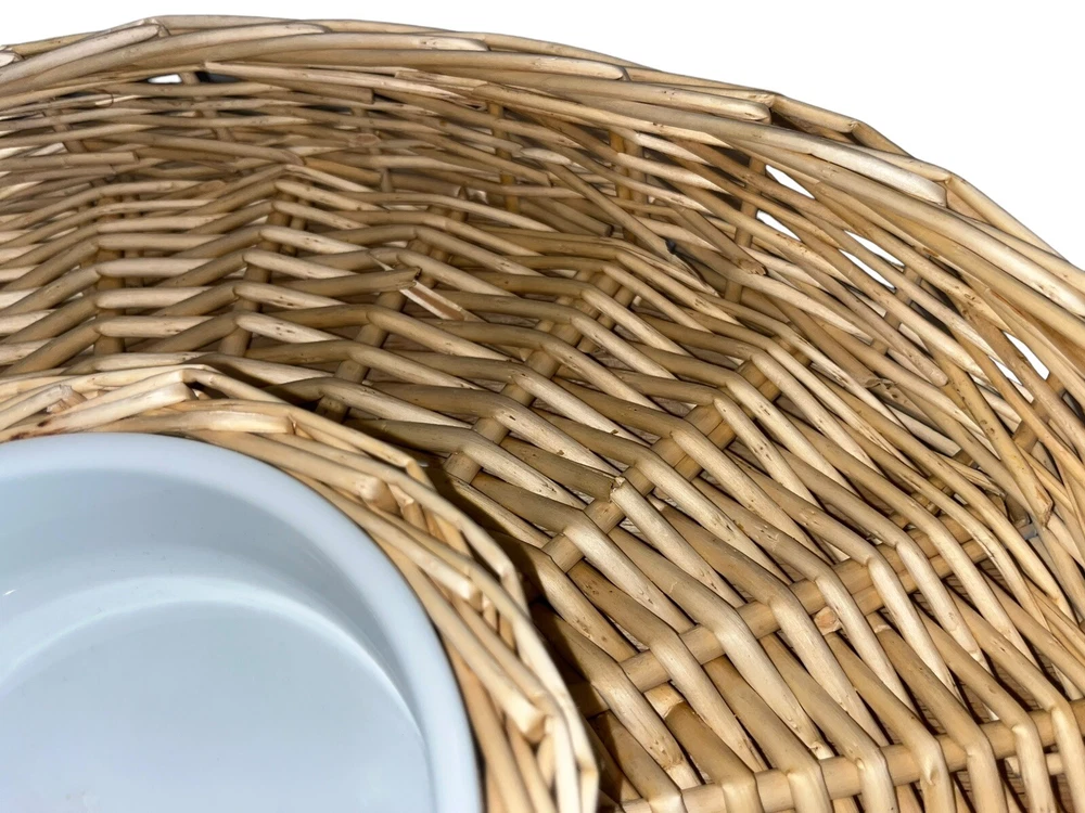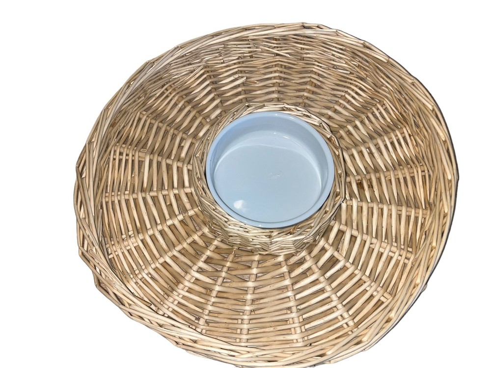 This wicker woven chip and dip platter is perfect for all occasions. The platter has a rustic finish and features a round shape with two compartments. The platter is made of high-quality rattan that adds to its durability and style. The platter also comes with a large white ceramic bowl that is perfect for serving dips or sauces. The platter is 16 inches long and is light brown in color.