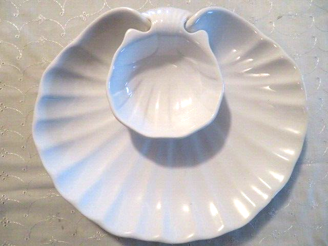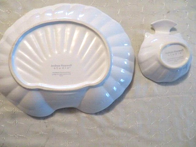 Joshua Maxwell Studio- 2 Piece Chip 'n dip set- White Ceramic-Both are Shell Shaped Plate roughly 12" x 9" x 2" Hanging Dip bowl roughly 6" x 5"x 2" weight 3.5lbs Preowned-Clean with No issues. The Joshua Maxwell Studio 2 Piece Chip 'n dip set in White Ceramic is a stylish addition to any kitchen or dining table. This set includes an oval-shaped medium-sized chip plate and dip bowl, perfect for serving snacks and appetizers. The solid white color and ceramic material give a modern and elegant touch to the set, making it ideal for entertaining guests or enjoying a casual meal at home. With a total weight of 3 lb, this chip 'n dip set is easy to handle and clean, making it a practical and versatile choice for any food and wine-themed occasion. Please see pics for further clarification Shipping includes tracking. Please take a moment to check out my other listings. Thanks. 781