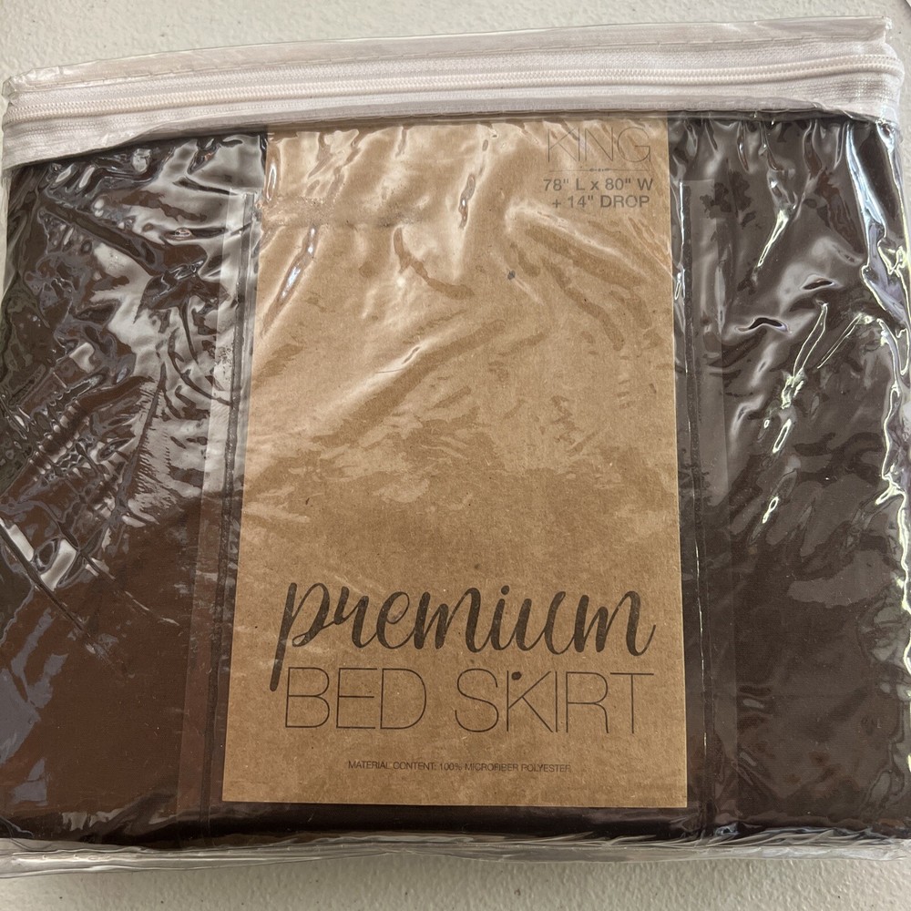Chocolate. Premium Bed Skirt Cal King Size. Microfiber. 14" Drop Skirts. Machine Washable. Simple easy fit design. Pleated corners. Hypoallergenic. New item, no tears, no stains, no rips.