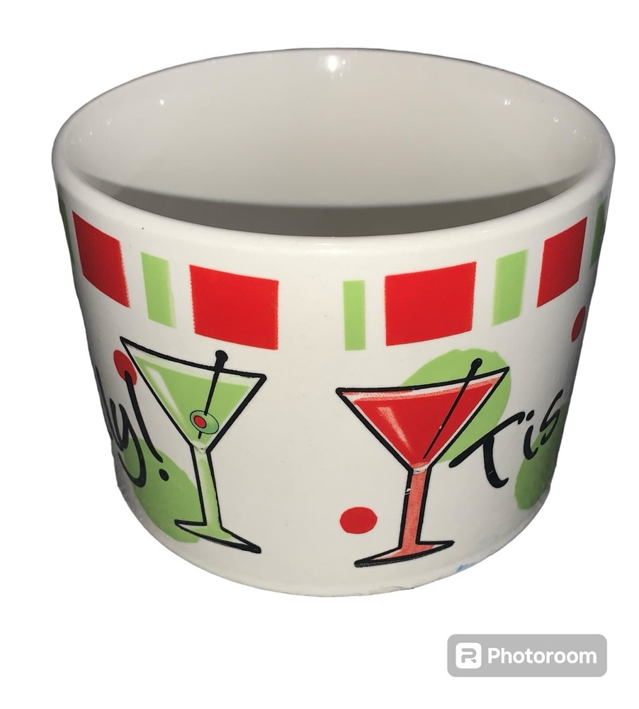 Christmas Stoneware Large Dip Chiller, "tis the season to be jolly" base measures 4.5" X 3.75" tall, dish measures 5.75" X 1.5" deep. Great Holiday Dinnerware Excellent pre owned condition