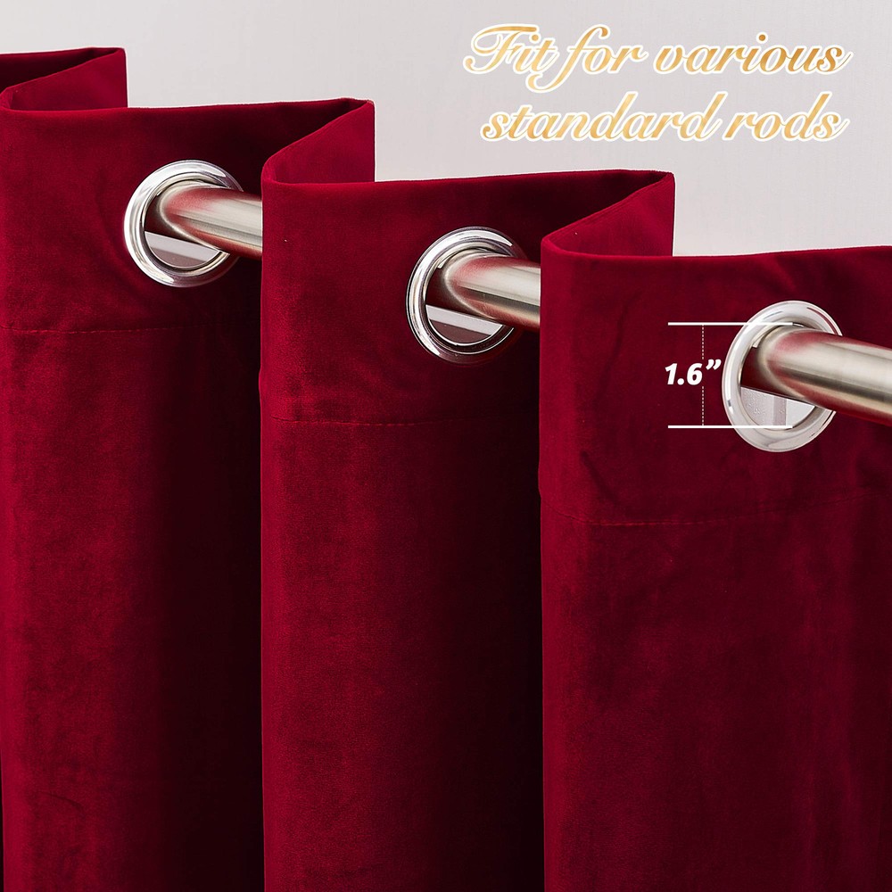Ready Made: Package includes a pair of panels of W52"x L108"(132cm x274cm) each | W104"x L108"(264cm x 274cm) in total. The design of silver grommet (1.6 inch inner diameter) creates casual elegance for your house, which makes the curtains easy to install and slide. Length Adjustable: Don't worry if these velvet curtains are few shorter than your windows. You can hang these curtain panels with rings and hooks. That could be adjustable for height max 3 inches. Hooks space distance around 4-6 inches. Light Dimming: The curtains with dense fabric are capable of blocking 65% to 90% of natural light, effectively shielding the room from harmful UV rays. The darker color has better blackout effect. For 100% blackout shading, add the curtain liners(: B01KX4LVRC). More Advantages: Velvet curtains offer noise reduction, thermal insulated, and privacy protection. The dense fabric help to reduce external noise and regulate indoor temperature, creating a peaceful and cosy environment. They provide maximum privacy, protecting your personal space. Easy Care: Good quality finishing will withstand years of use. Machine washable and Wash the water temperature below 90℉. Mild detergent no bleaching. Quick ironing when needed. Please be free to us if you have any question with our products.
