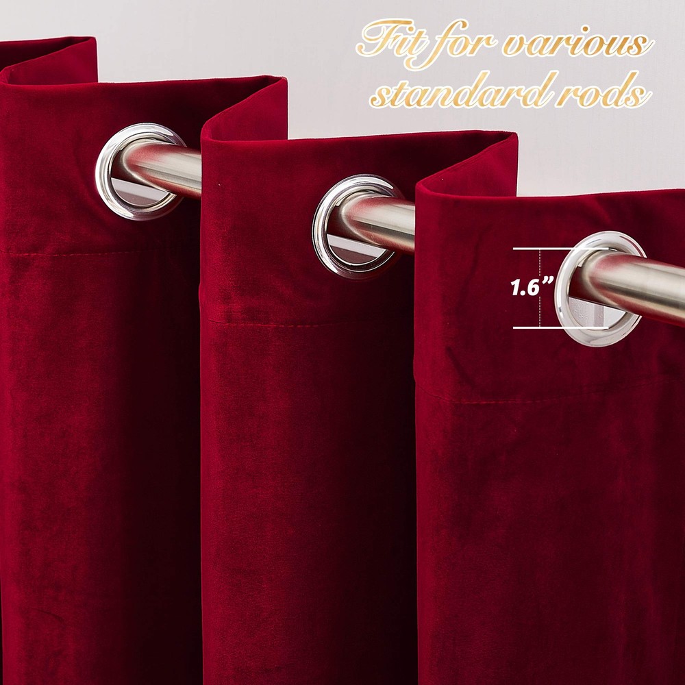 Curtains are so much more than just bits and pieces of fabric that are sewn together to prevent sunlight from entering your home, they go beyond that mundane function and provide additional benefits that do not meet the eye instantly. Light Blocking Energy Savers. Having the heavy, multi-layered microfiber blackout window curtains or drapes can make a world of a difference in reducing the amount of light that comes in from outside, which has green-conscious consumers excited about investing them as energy-efficient window treatments. A home insulated and remains warmer in wintertime relieves the strain on home heating and adds up to budget-noticeable energy saving of up to 25 percent. Sleep Soother n Noise Buffer. it's hard to get babies to take a rest during the day when the sun is streaming brightly through a bedroom window. Blackout curtains encourage the best possible sleep and most comfortable setting for day sleepers and the ones who have trouble falling asleep, by automatically darkening and lowering noise levels. Absolute Privacy n Relax. Not only that, but also make your resting zone truly blissful. They would be perfect for any home theater because there's nothing like watching your favorite movie in real darkness. Let Show Off Selection take you into full prep-for-the-holidays mode. Frame your windows with the soft elegance of jewel-toned velvet. Our Velvet Textured Panel is hand finished in luxurious microfiber a sumptuous drape, privacy and sun protection. This Velvet Curtain can be used for Stages, Dividers, Wall Covers, Windows, Home Theaters, Weddings, Churches, Photography, Studios, Shows, Room Restaurants, Business, Clubs, Bars, Convention, Special events or any place. Have you decided which color to pick? Ready Made: Package includes a pair of panels of W52"x L108"(132cm x274cm) each | W104"x L108"(264cm x 274cm) in total. The design of silver grommet (1.6 inch inner diameter) creates casual elegance for your house, which makes the curtains easy to install and slide. Length Adjustable: Don't worry if these velvet curtains are few shorter than your windows. You can hang these curtain panels with rings and hooks. That could be adjustable for height max 3 inches. Hooks space distance around 4-6 inches. Light Dimming: The curtains with dense fabric are capable of blocking 65% to 90% of natural light, effectively shielding the room from harmful UV rays. The darker color has better blackout effect. For 100% blackout shading, add the curtain liners(ASIN: B01KX4LVRC). More Advantages: Velvet curtains offer noise reduction, thermal insulated, and privacy protection. The dense fabric help to reduce external noise and regulate indoor temperature, creating a peaceful and cosy environment. They provide maximum privacy, protecting your personal space. Easy Care: Good quality finishing will withstand years of use. Machine washable and Wash the water temperature below 90β. Mild detergent no bleaching. Quick ironing when needed. Please be free to contact us if you have any question with our products.