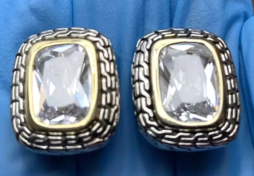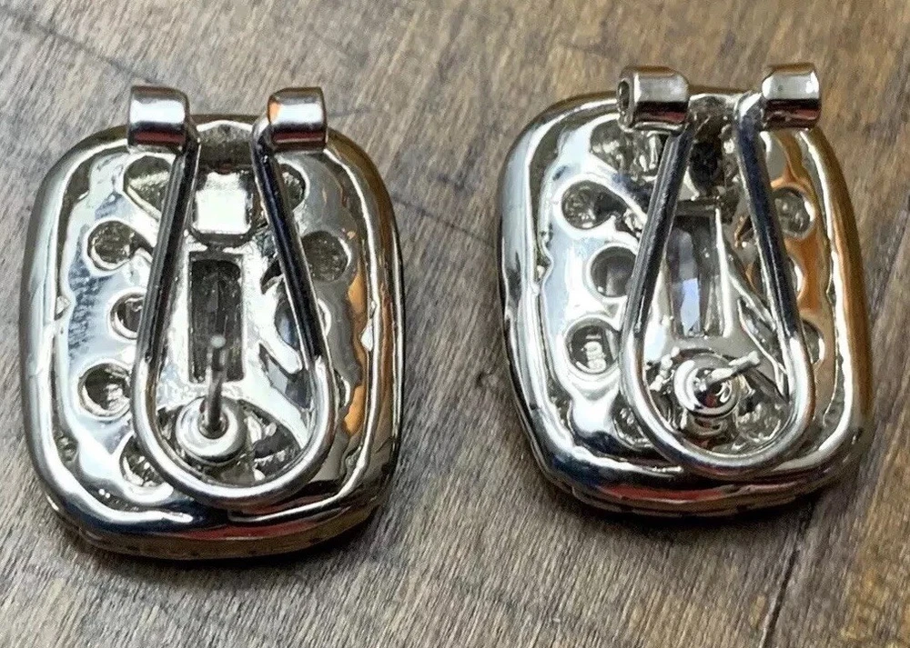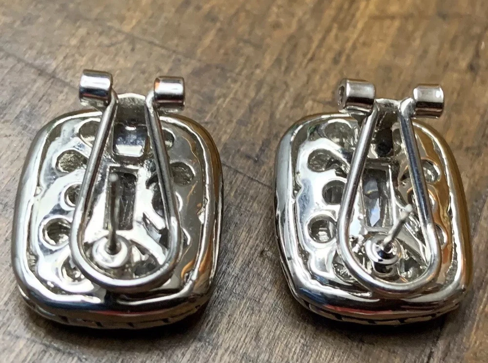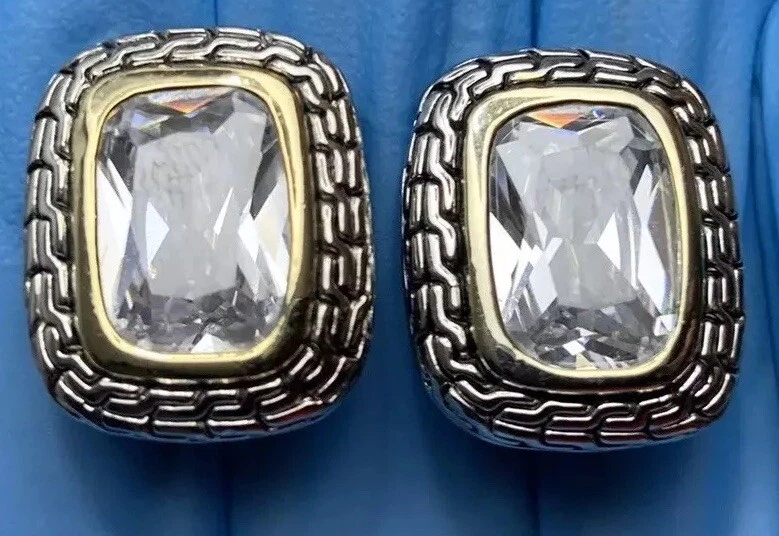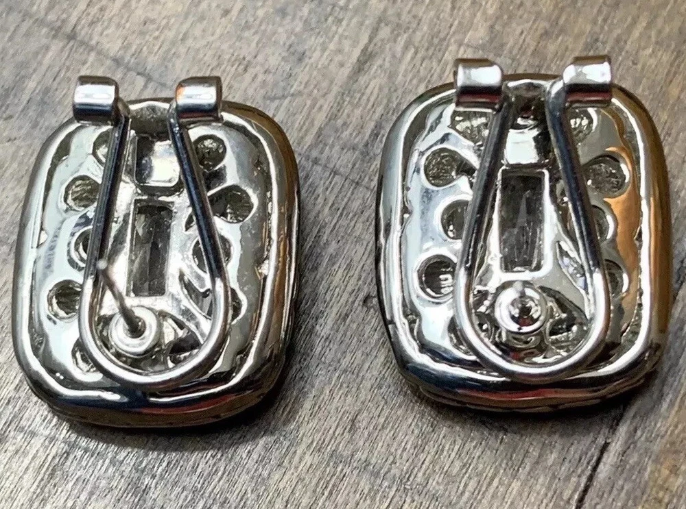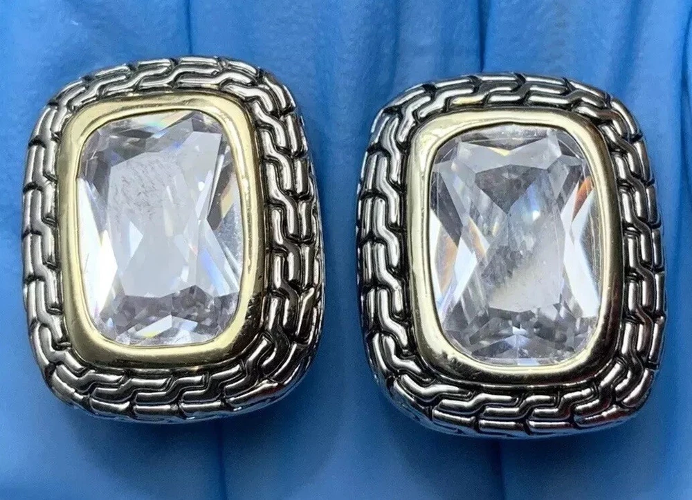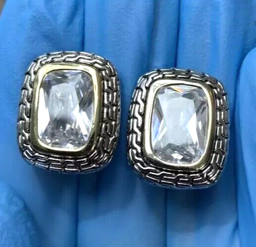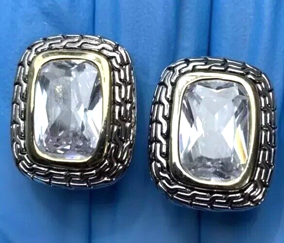 ~Chunky Braided Silver Tone & Gold Tone CZ Stone Rounded Square Clip On Earrings 5/8" ~Measure 5/8”x 0.875” ~Unsigned/unsure of the maker, they are beautiful earrings!...