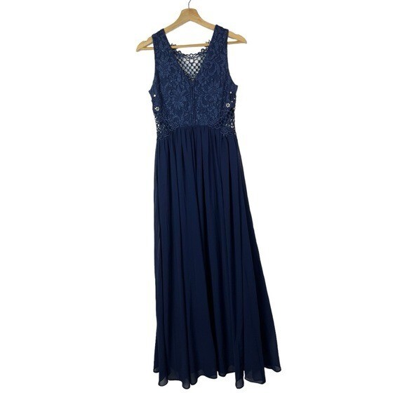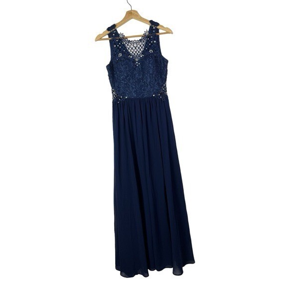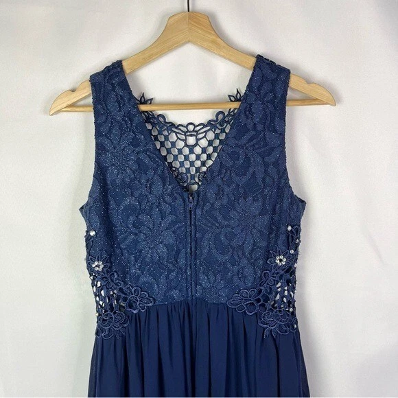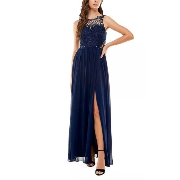City Studio Bright Navy Embellished Illusion Tulip Maxi Formal Gown Good used condition, minimal signs of wear. - Bright navy blue - Mesh lace detailing - Rhinestone details - Floral embellished - Side slit detail - Chiffon tulle skirt - Maxi, long length - Bridesmaid, formal, prom, homecoming - Cut out side detail - Back zip closure - Bra padded detailing - Scallop, scoop neckline Measurements available upon request. All items ship from a smoke & pet free environment. All orders ship same or next business day.