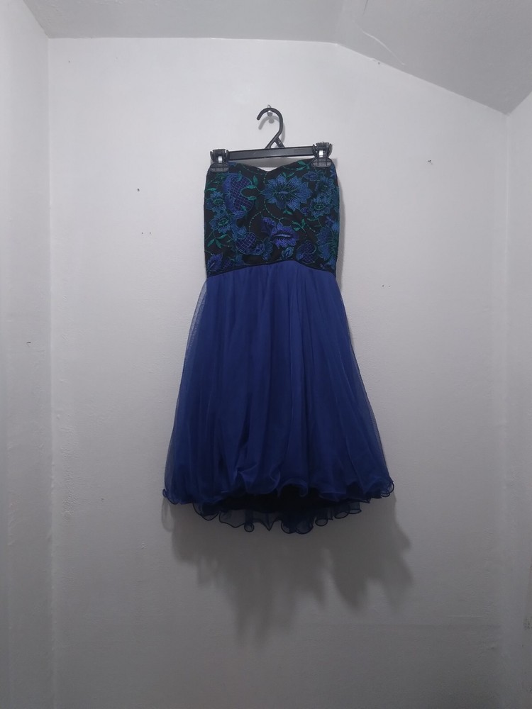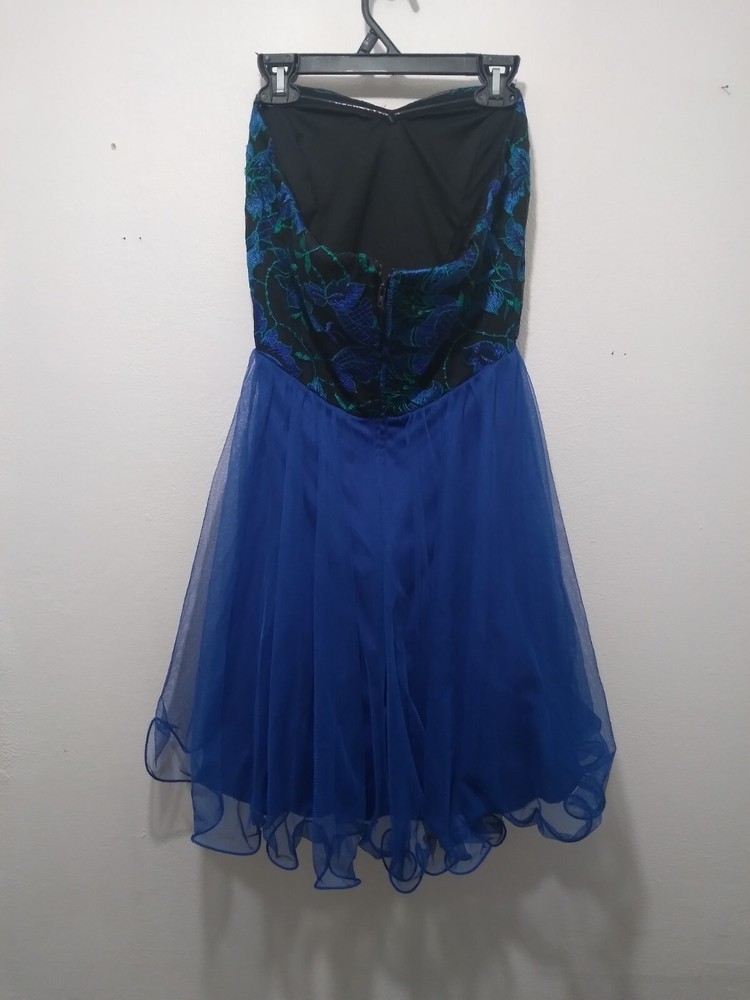 This beautiful City Studio dress is perfect for any formal occasion. The sleeveless, strapless design features a sweetheart neckline and a zip closure. The dress is a size 5 and has a floral pattern with embroidered accents. Made from a blend of polyester, spandex, and cotton, this dress is both comfortable and stylish. It has a fit and flare style with a short length and is lined for added comfort. The dress is perfect for spring and summer and is suitable for weddings, parties, and cocktail events.