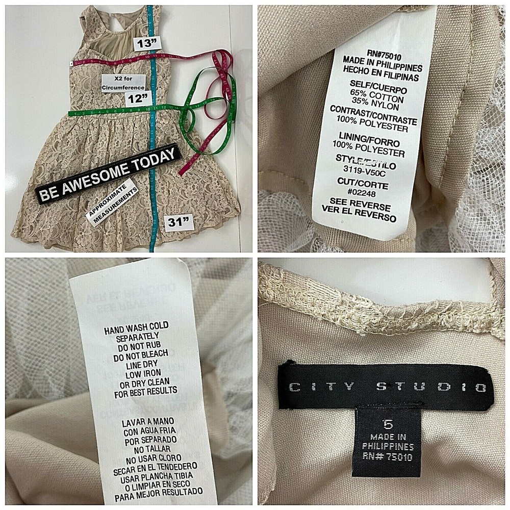 City Studio Dress Womens Size 5 Lace Tan Sweetheart Crew Peek a Boo Back FASHION 411: The Item Specifics Boxes are meant to give a broad idea of garment, read below for specifics relating to this specific garment. This is a pre-owned garment, and because it is not direct from manufacture, it is considered to be Imperfect. Dress By : City Studio Features : Rear Peek A Boo Accent / Rear Zip / Sleeveless / Knee Length / Lace Overlay Size : 5. All measurements are taken flat and are approximate; Refer to measurement photos for a good fit and complete visual tour/inspection of this item. Color : Shades of Tan. We are referring to "shades of" the color because monitor resolution and quality differs from one computer to another and we are trying to convey the general color. Material Composition : Refer to Fiber Content Tag Photos for specifics Care of Garment : Refer to washing instructions for proper care. We sanitize and steam all pre-owned garments before the item is packed and placed into inventory, however, we recommend washing/cleaning all garments upon receipt. This item has been prepared for shipping, folded, wrapped and packaged for handling via USPS and as such, may arrive wrinkled. INV B12-536 Shipping rates are set by the USPS based on weight, dimension, zip code. It is our practice to select the most cost effective, that provides safe transport. If you like this Dress, browse our store to find more items you may love! Thank You for supporting a Small Business We love hearing from our customers: Fast shipping! Looks exactly as pictured. Lightning fast shipping -Very cute shoes -As described -Thanks! Great Seller! Excellent Communication / Highly Recommend!! I will do business with you again. Great item, perfect packaging A+++ The seller was so good to work with. Item arrived in great time and exactly as described . A+A+ Adorable, in great condition, lovely seller! Thank you! Jersey arrived exactly as described, super quick ship! WDBWA! Many thanks! A+++ Pleased? ...Let us Know! Not Pleased? . ..Contact us directly before opening a case - so we can assist in resolution. Then, rate our customer service via feedback Thank You for Shopping with Us!