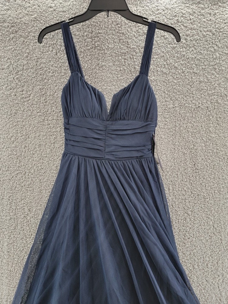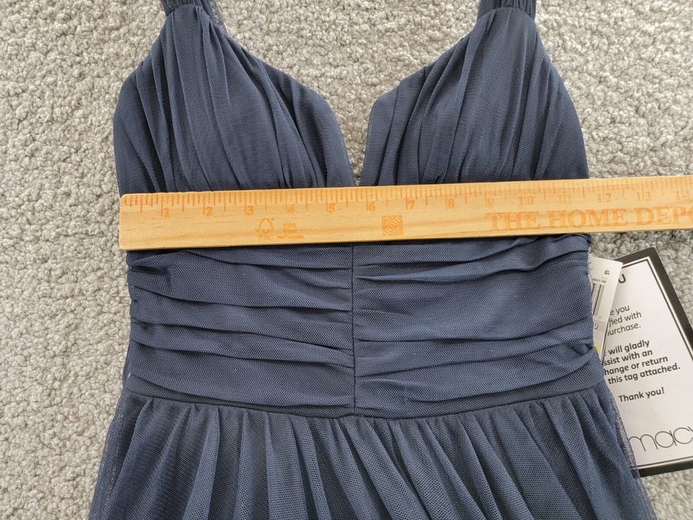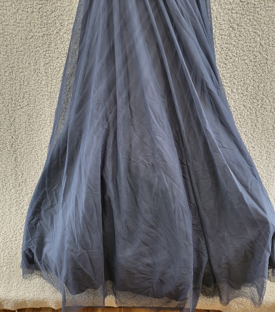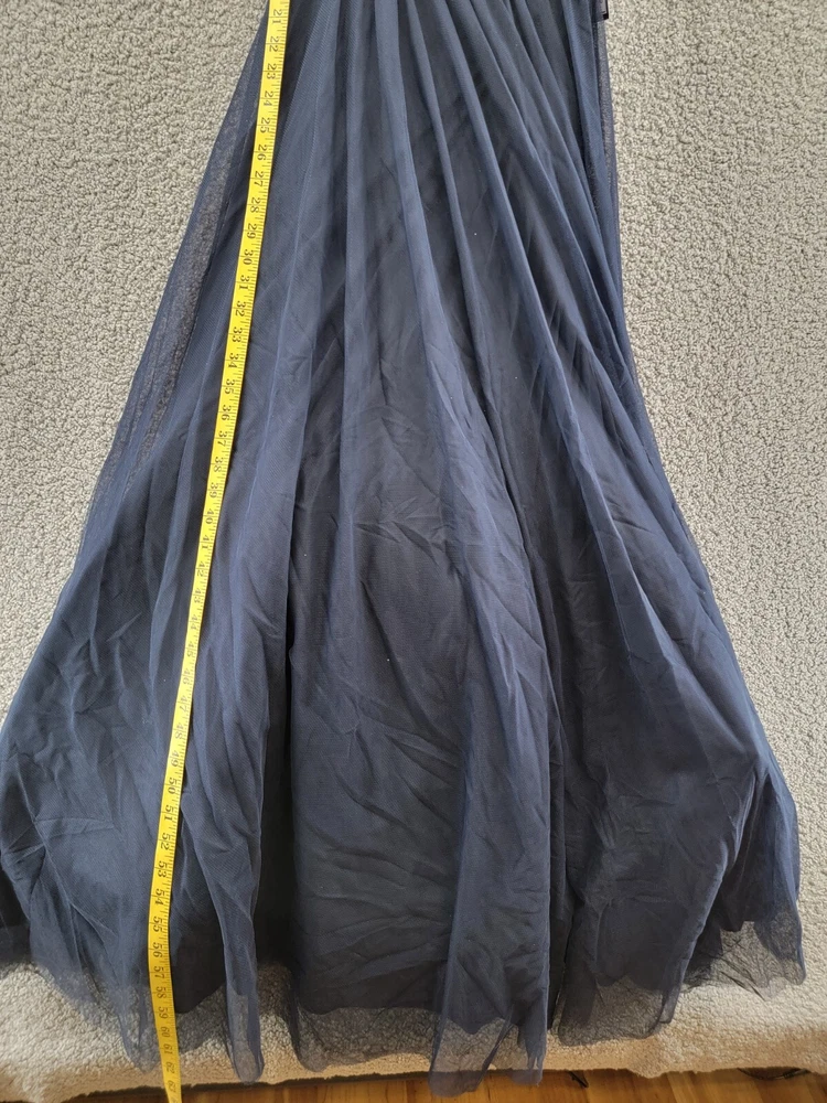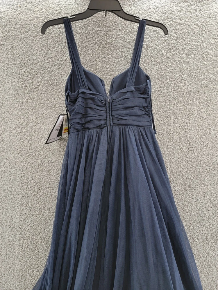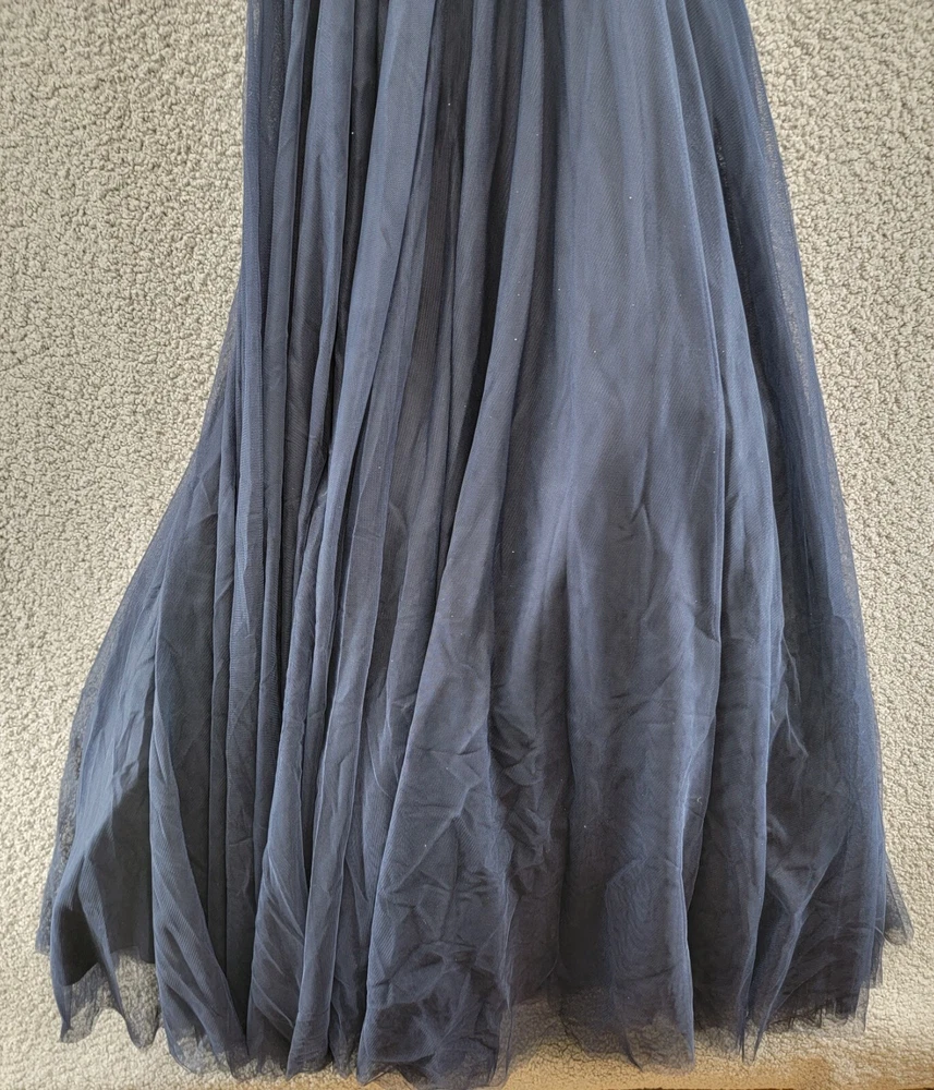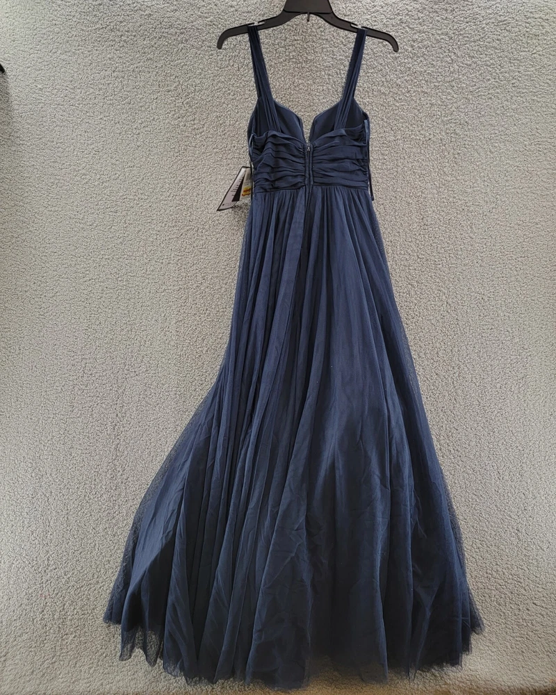 This gown is absolutely stunning—the pleated bodice and notched neckline give it such a chic, elegant look. The navy ink color is rich and sophisticated, perfect for special occasions. The mesh overlay adds a delicate touch without being too sheer. Fits true to size and feels lightweight yet luxurious. Definitely worth every penny for a standout formal look!