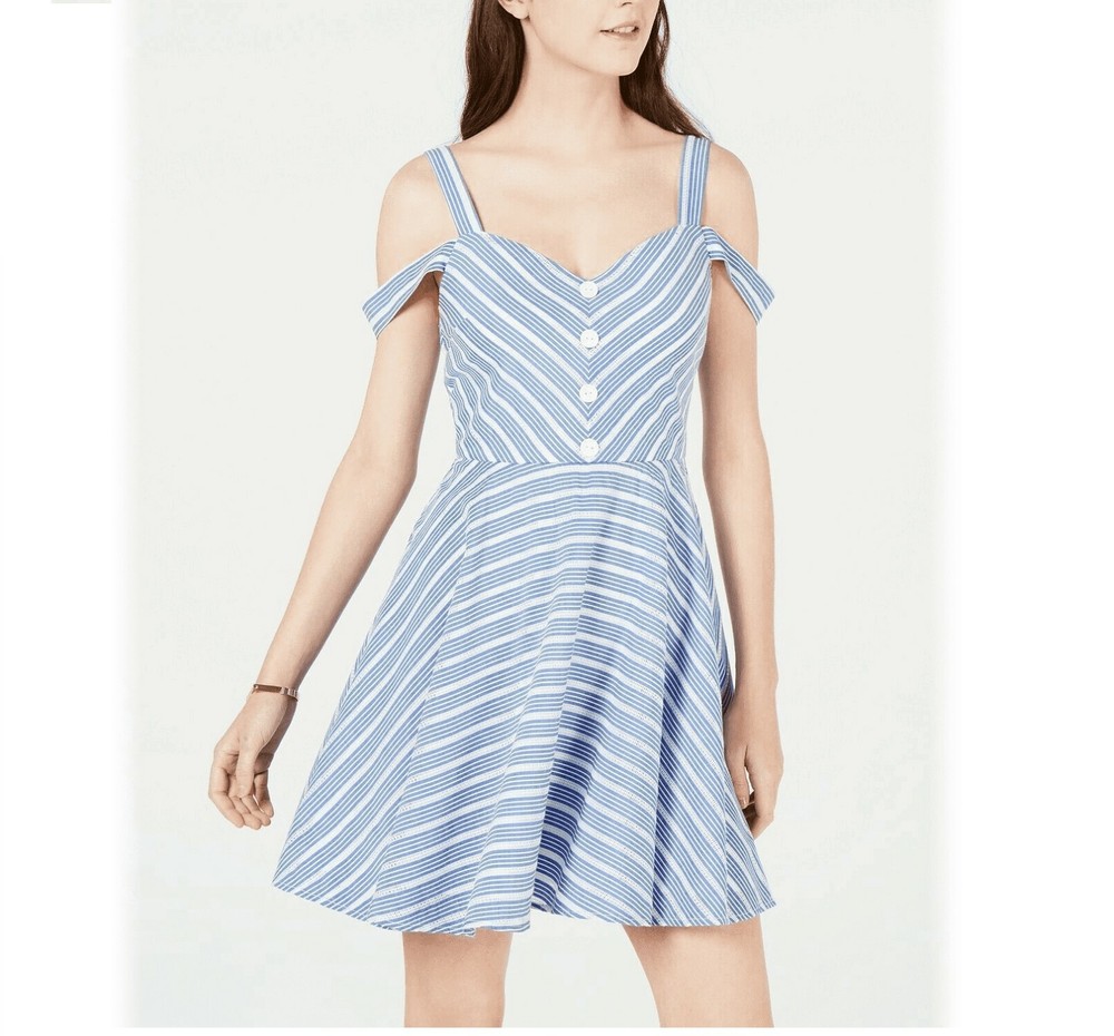 City Studio Junior Womens 11 Blue White Striped Cold Shoulder Daytime Dress NWT Brand: City Studio Size: 11 Color: Blue and White Closure: Zipper Fabric: 80% Polyester/20% Cotton Care Instructions: Hand Wash Cold Measurements taken by hand laying flat and are approximate. All measurements are in inches. Bust: 17 Length from Shoulder: 34 Please always reference the brand size chart for accurate measurements for the size listed.