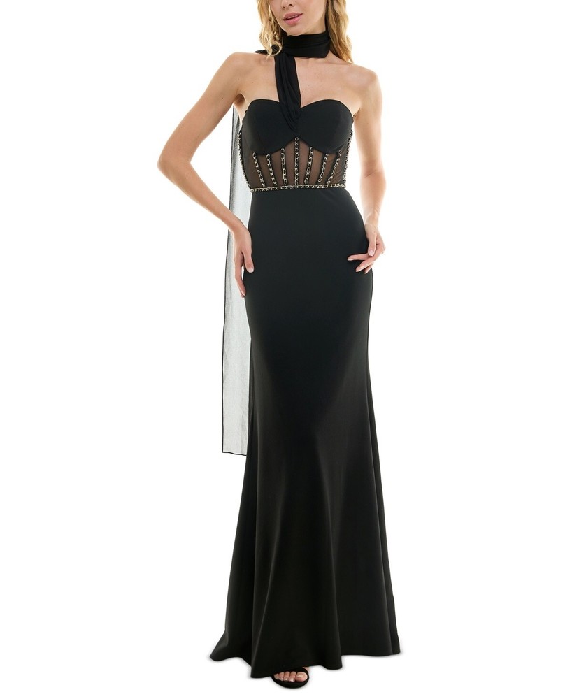 Make your formal event a chic fashion moment with this stunning gown from City Studios. The glamorous silhouette features a soft flyaway cape detail and chainlink-inspired embellishment at the sheer illusion bodice. Floor-length formal dress Scuba: Structured and supportive Sweetheart neckline; Gown silhouette Back zipper closure Bust padding; side flyaway cape detail from neckline; chainlink brass embellishment on strapping and front waist; illusion bodice; ruched at back Polyester, spandex; front waistband & back bodice: polyester, spandex; cape: polyester; lining: polyester Manufacturer's size: 15/16