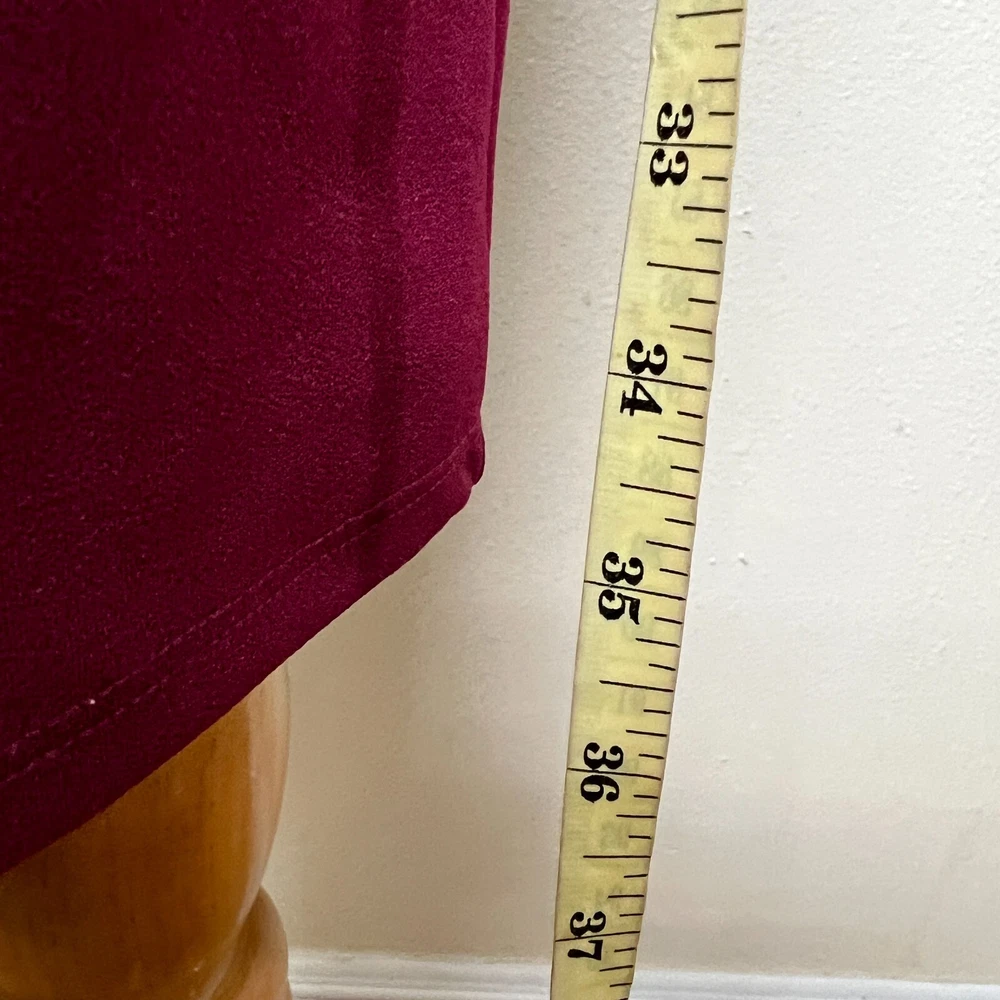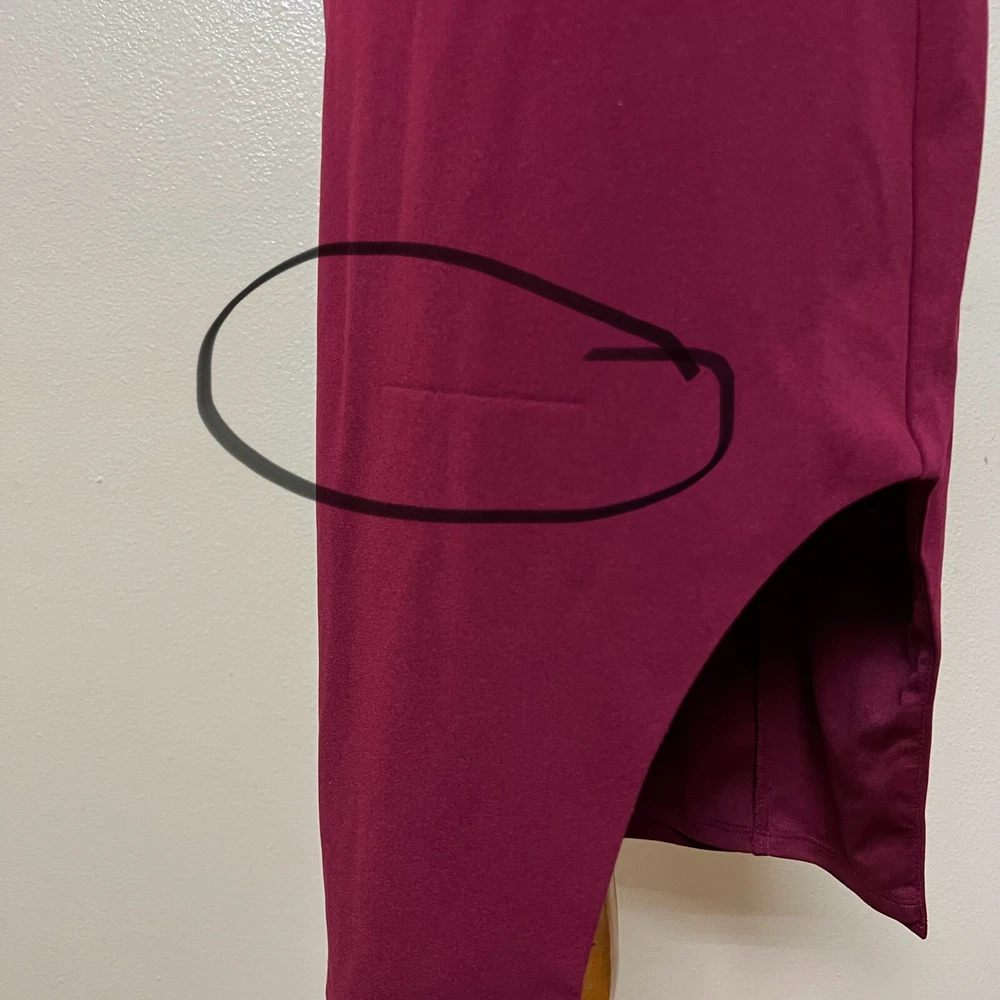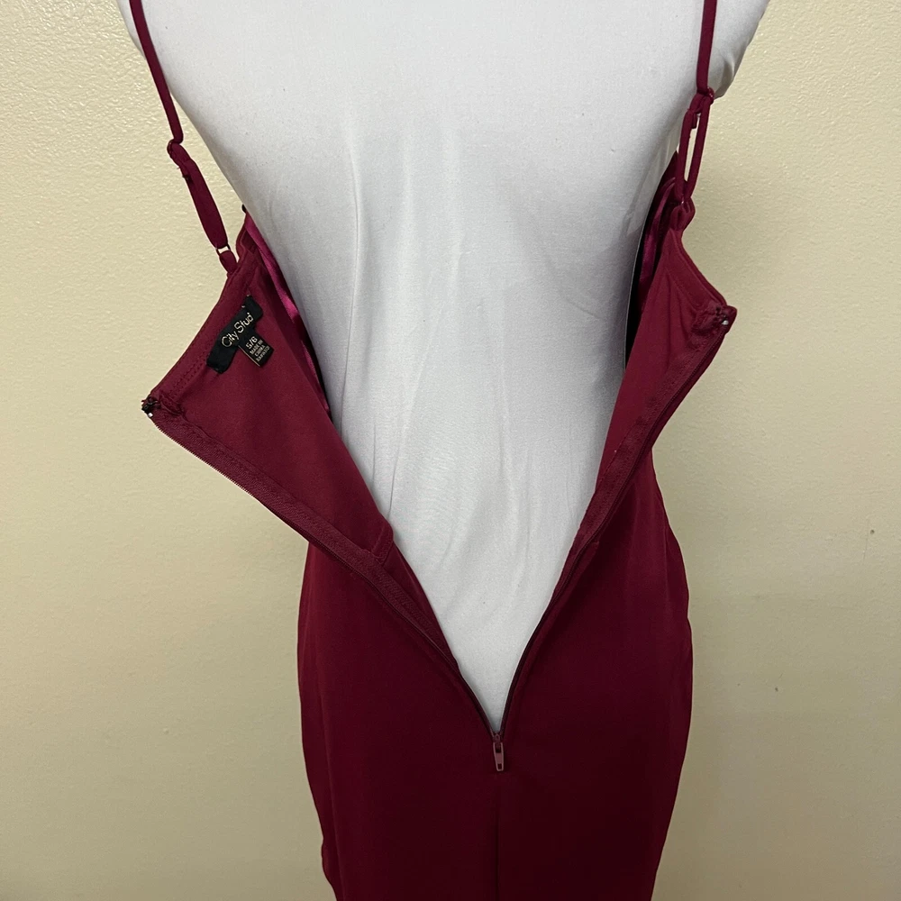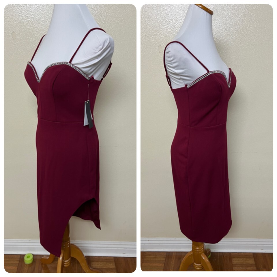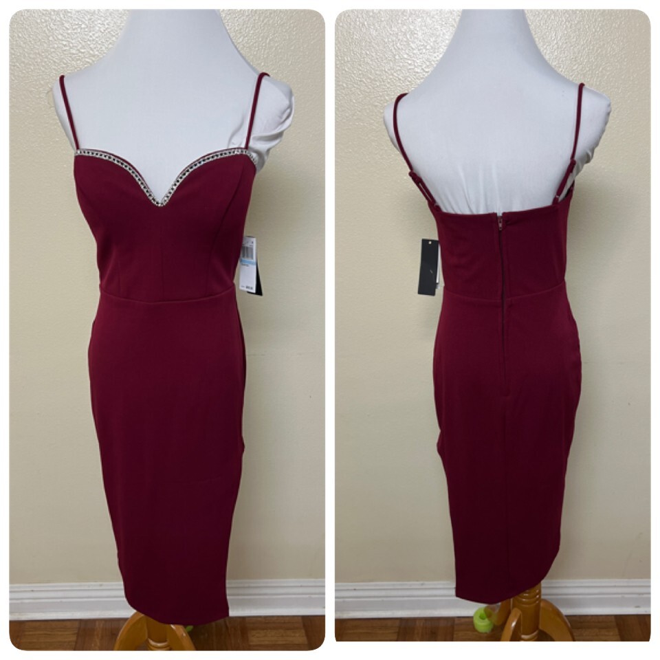 City Studio Junior's Rhinestone-Trim Bodycon Dress Sz 5/6 in Red Burgundy Approx. model height is 5'10" Fitted through the chest, waist, and hips Plunge neckline with rhinestone trim; Bodycon silhouette Zipper closure at center back Adjustable shoulder straps; slit cutout at side S=3/4-5/6 Lined Polyester, spandex; lining: polyester Dry clean **Mannequin's measurement used to display the dress is posted in the picture** **FLAW ALERT: Snag on the front area. See picture** B25