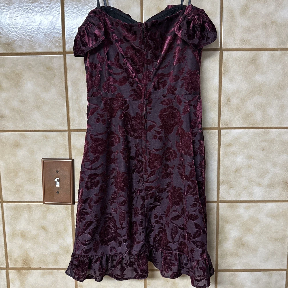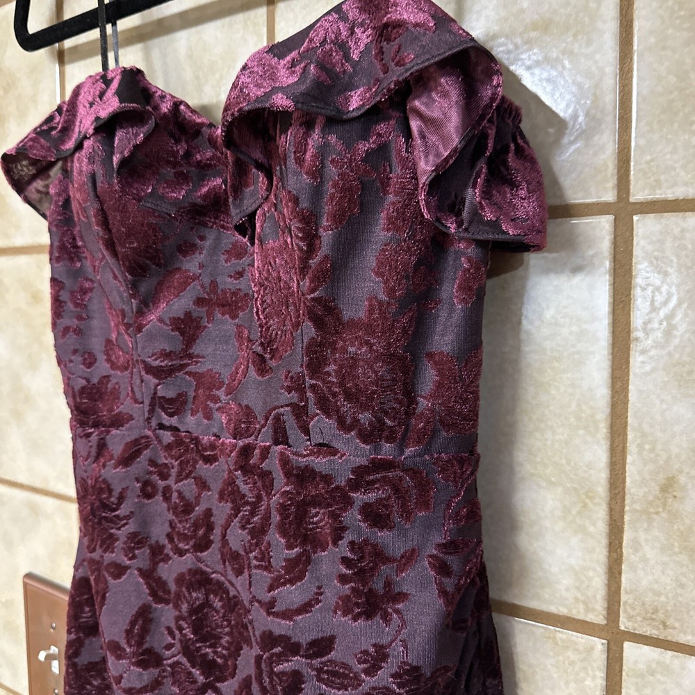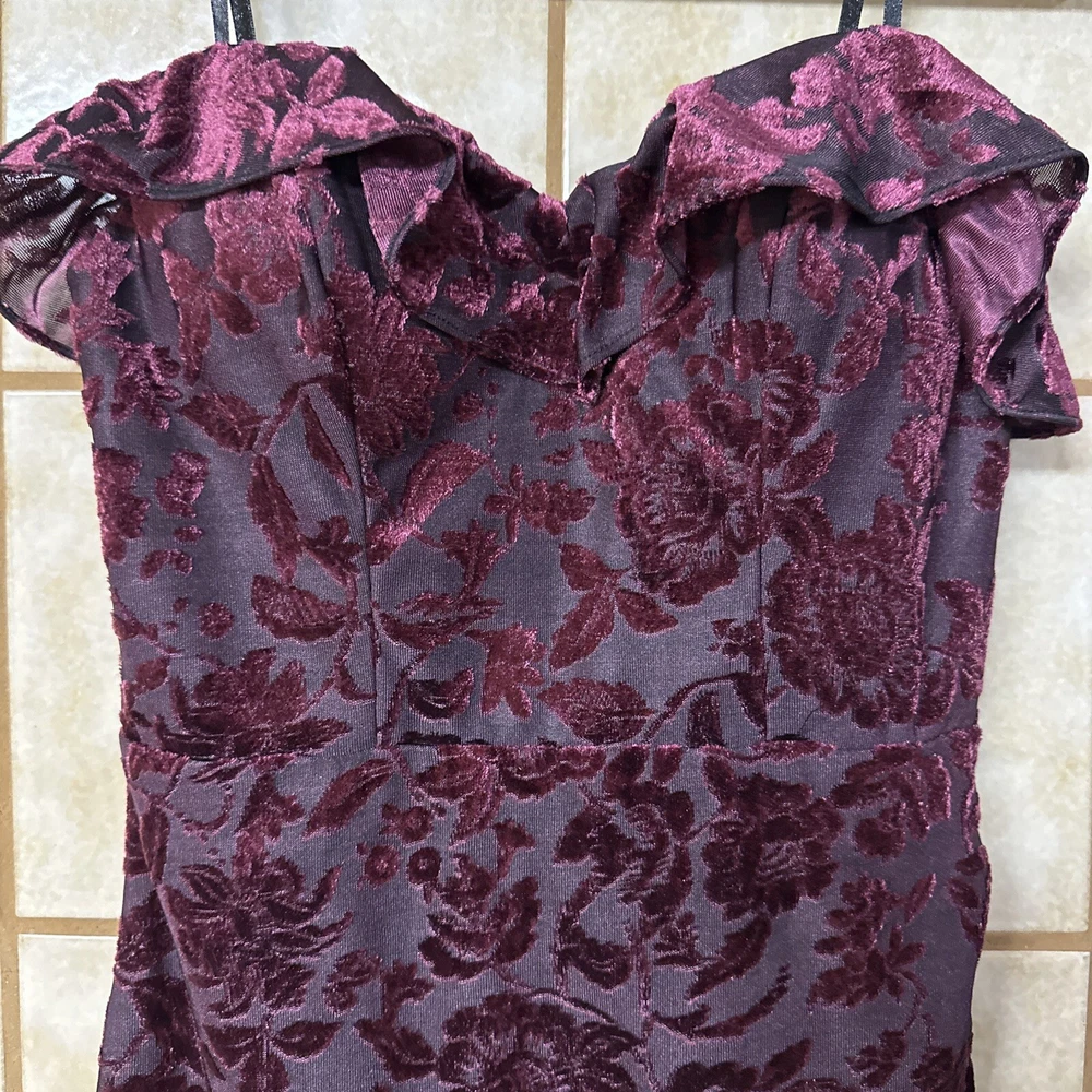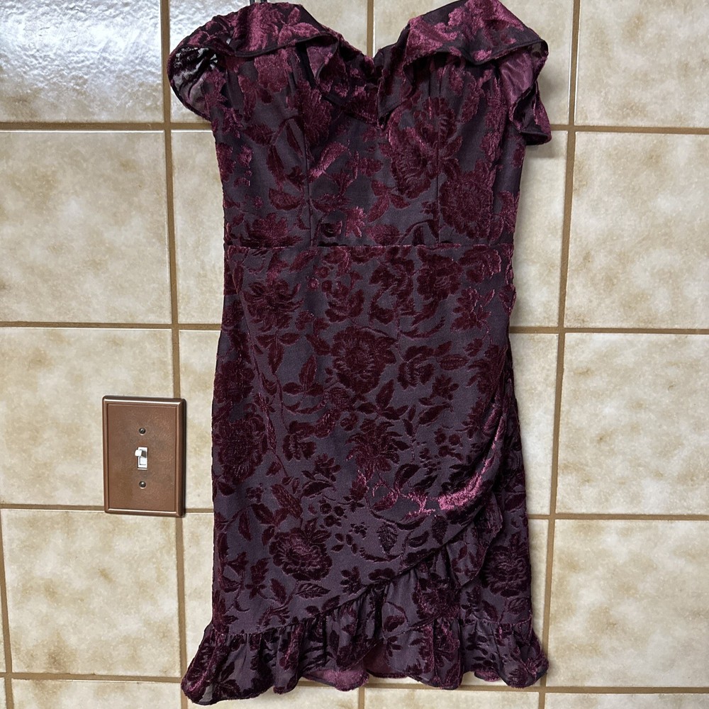 Get ready to turn heads with this stunning City Studio bodycon dress in a beautiful burgundy color. The dress features a floral pattern with a sweetheart neckline and sleeveless design, perfect for a formal occasion or a night out on the town. The zip closure adds a touch of convenience, while the ruffle accents give the dress a playful and whimsical touch. Made with a blend of polyester and spandex, this dress provides a comfortable and stretchy fit. The dress is dry clean only and is available in size S and is freshly cleaned and ready to wear. With its versatile design, this dress is perfect for many fun occasions and is sure to make you stand out from the crowd. Bust measures 30” and length is 23” at front center.