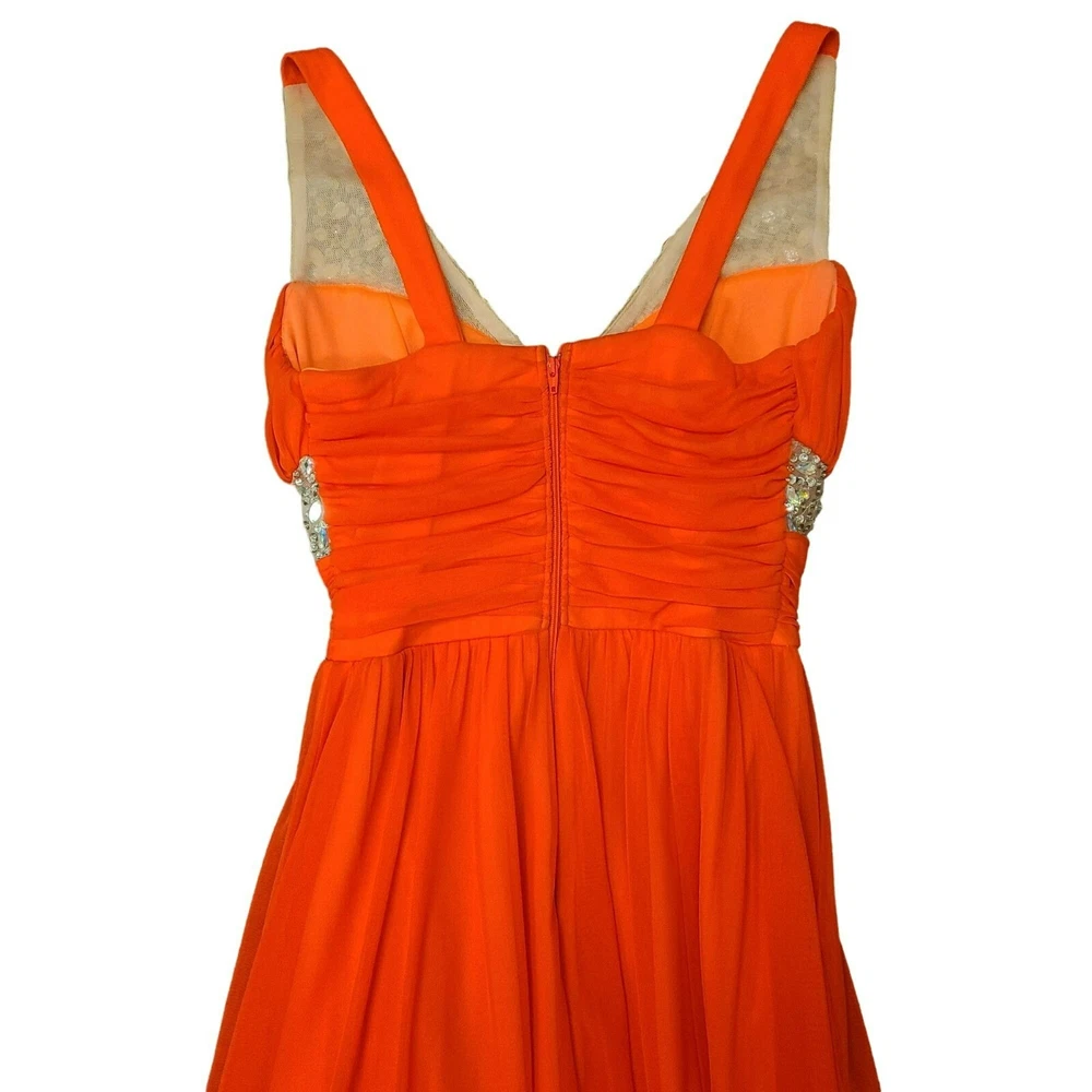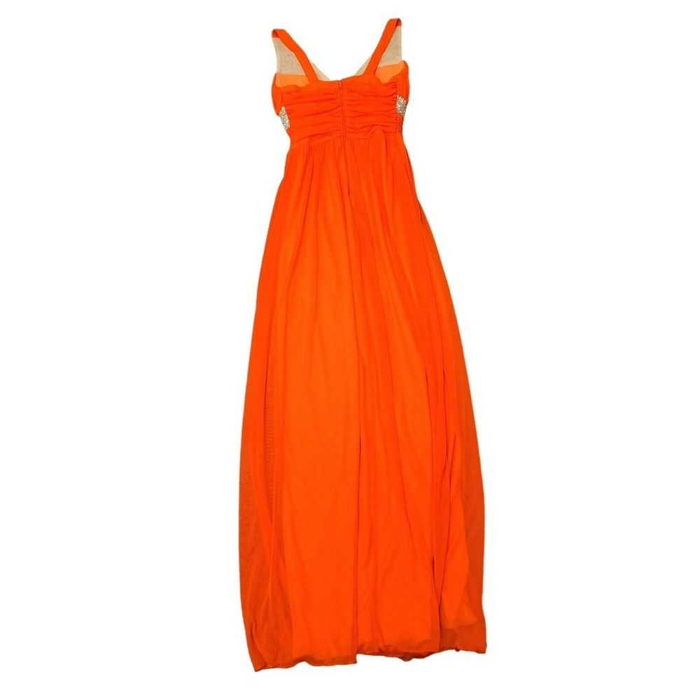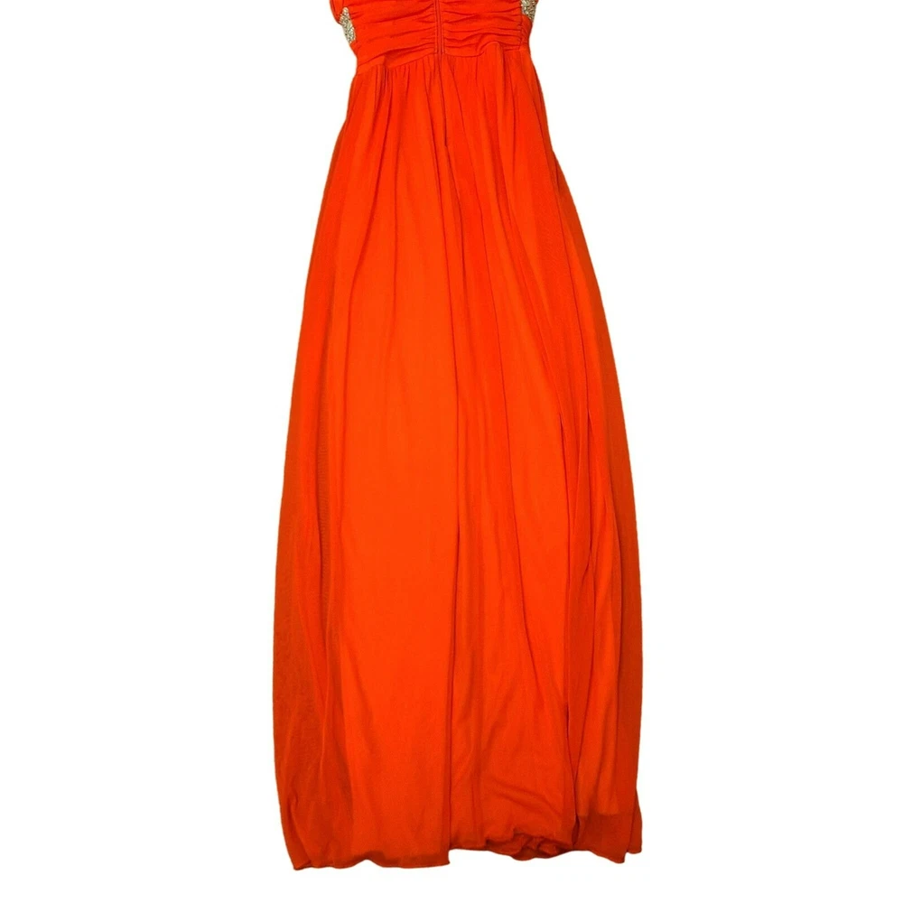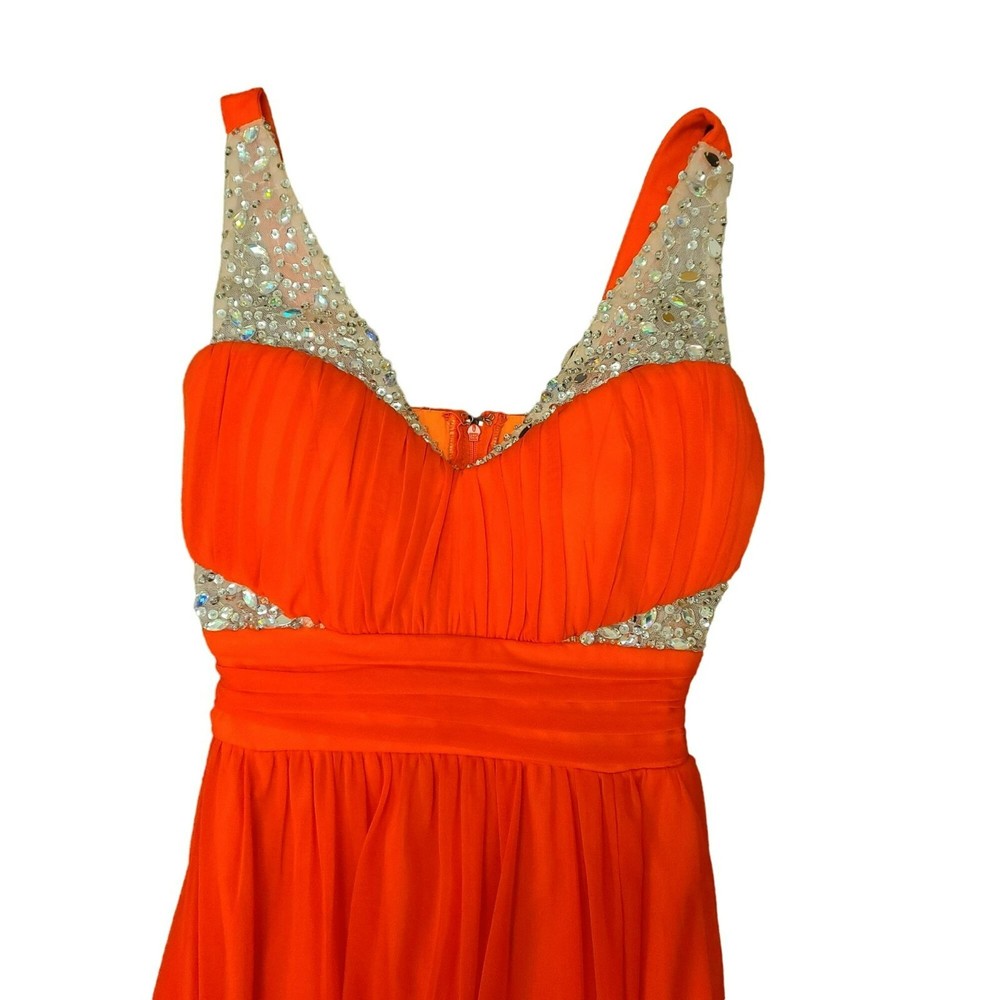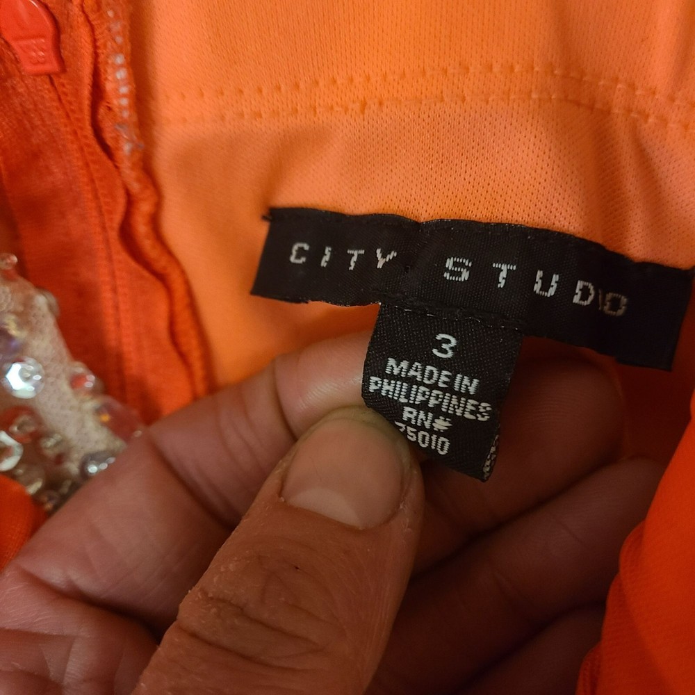 City Studio Maxi Party Formal Prom Dress Gems & Sequins Orange Juniors 3 Size Juniors 3 Color bright orange, fluorescent orange Condition in excellent pre-owned condition Features maxi length, flowy full length, fully line, wide tank straps, sweetheart neckline, with ruching at the bust, waist and top of skirt, top and below chest embellished with gems and sequins, slit up the bottom to reveal lighter orange lining, 100% polyester, made in the Philippines, professional spot clean only dance, prom, homecoming, Hoco, formal, wedding, cocktail party, dress, maxi, embellished, gems, sequin, sparkle, sexy, club, Vegas, fluorescent, bright orange Approx. Measurements 11" across the waistband and 56" long from the shoulder to the hem R-34