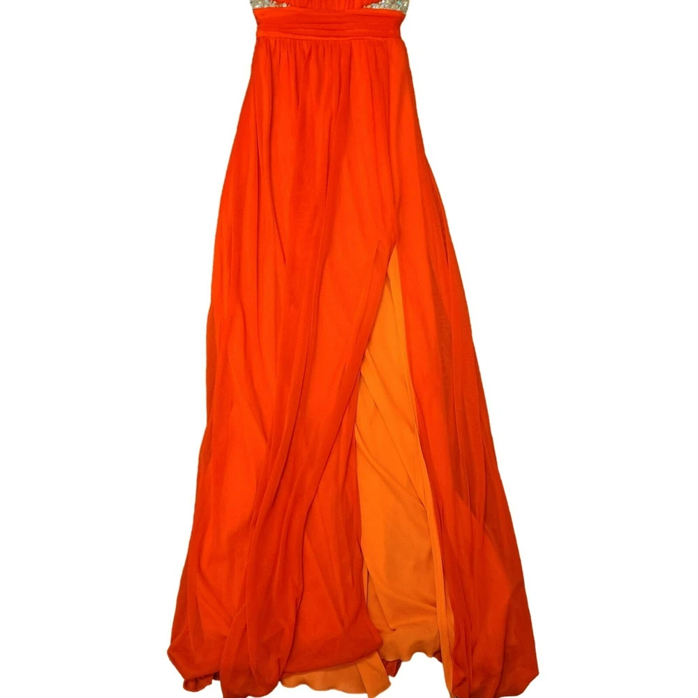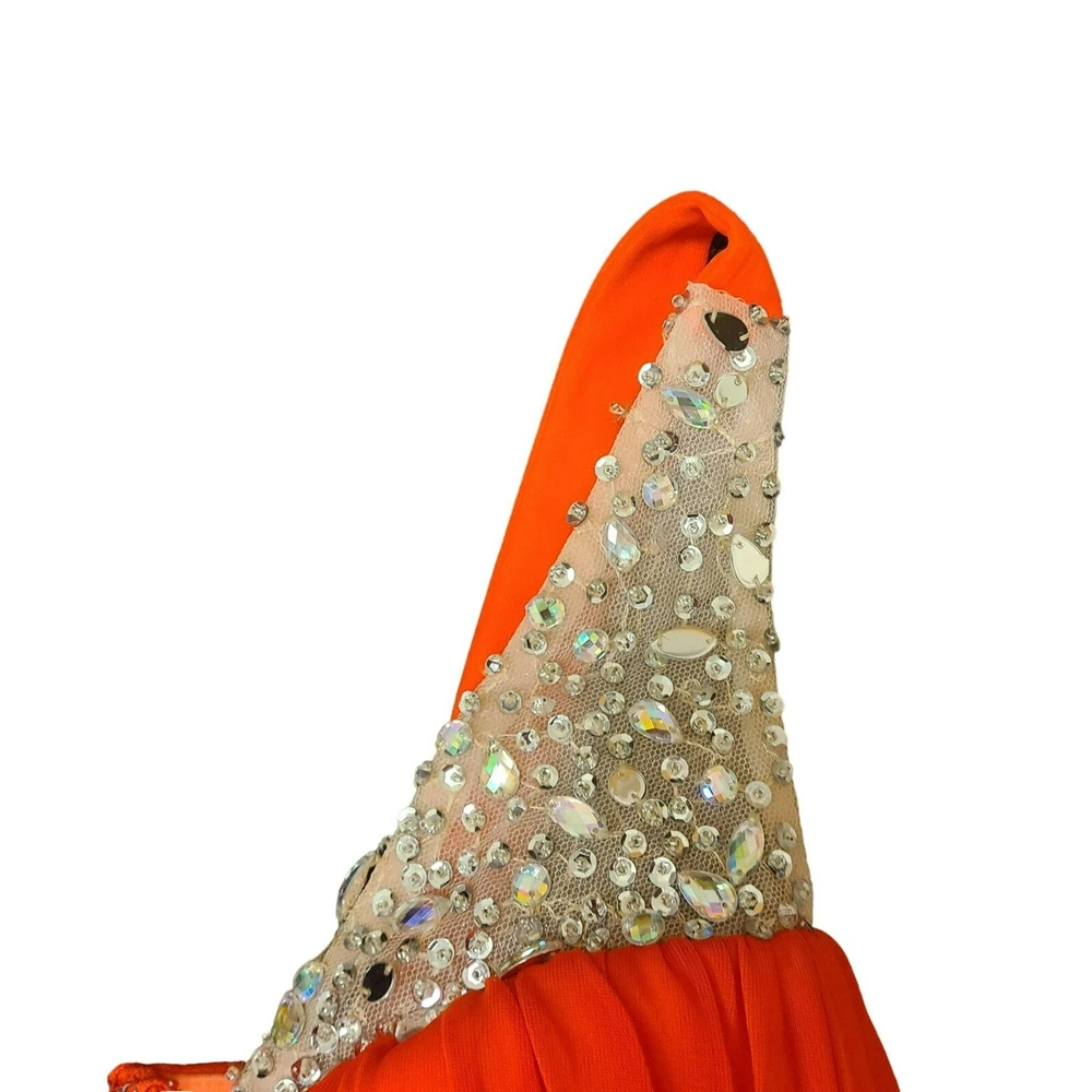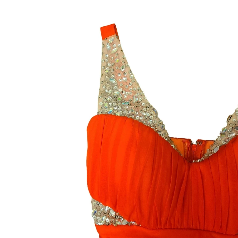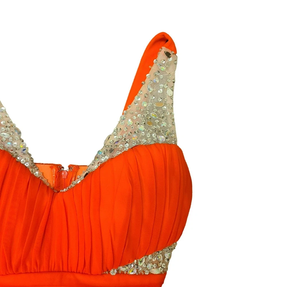 This dress is absolutely stunning! The bright orange color makes such a bold statement, and the gems and sequins catch the light beautifully when you move. It fits like a dream with the ruching details, and the slit adds a fun pop of the lighter lining. Perfect for making a grand entrance at any formal event!