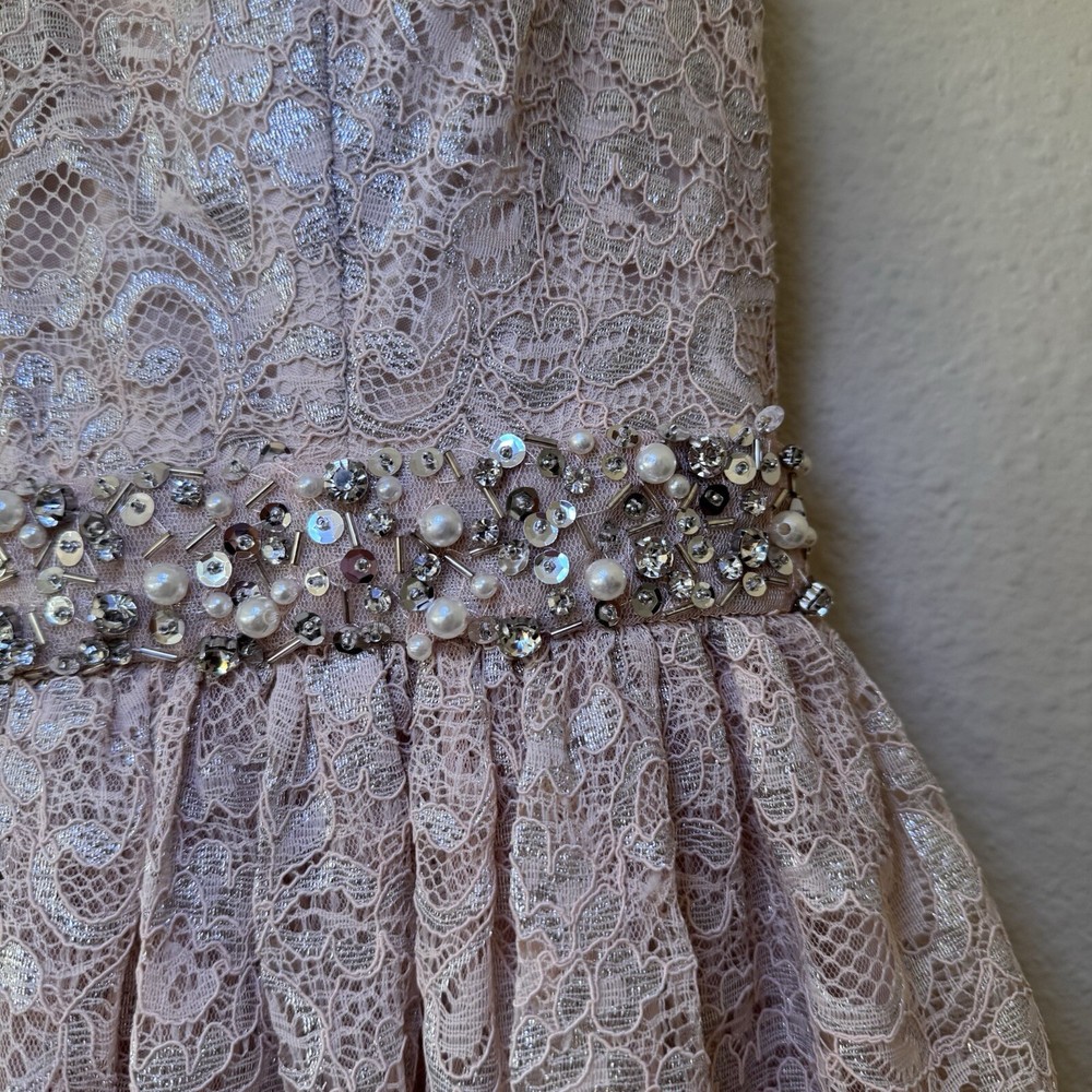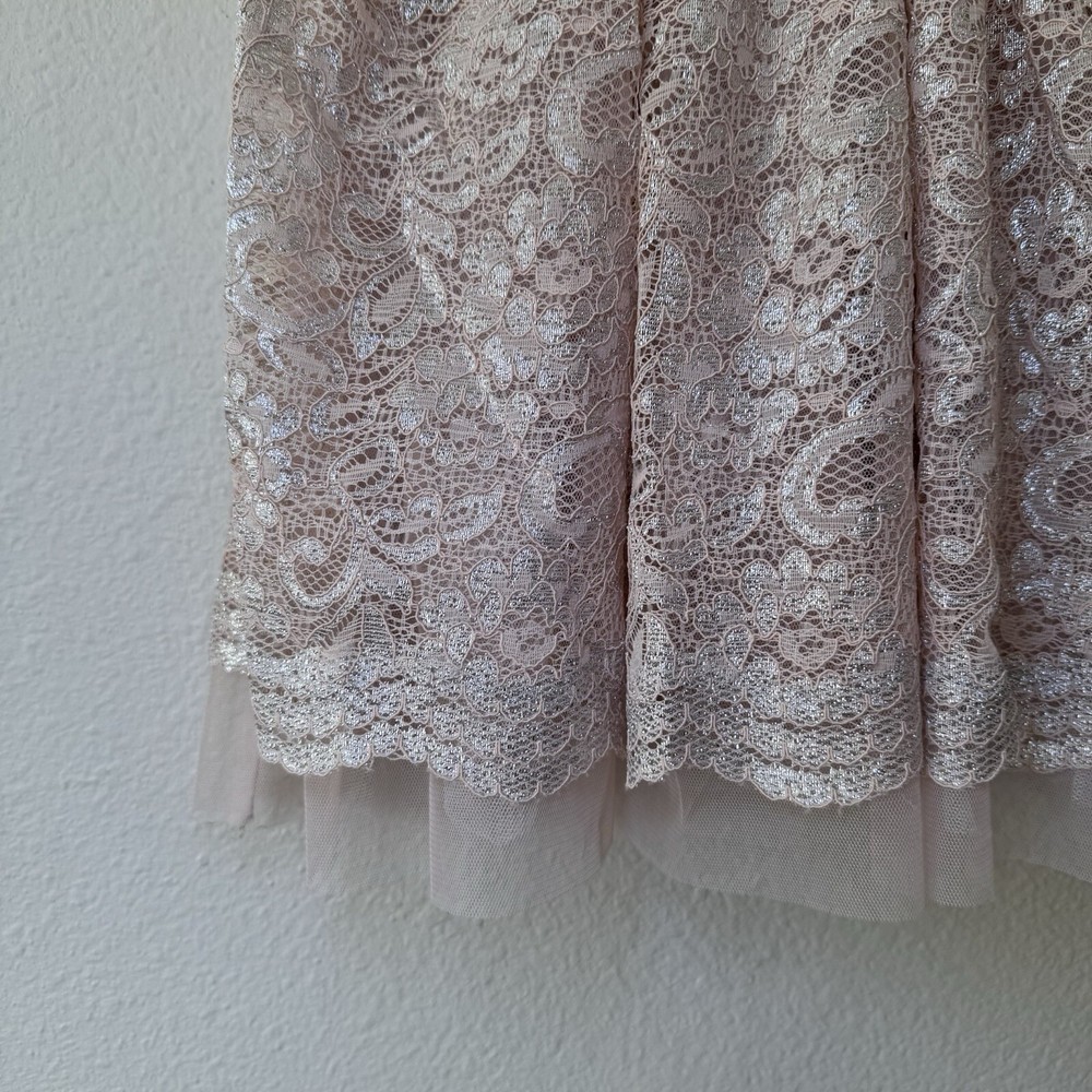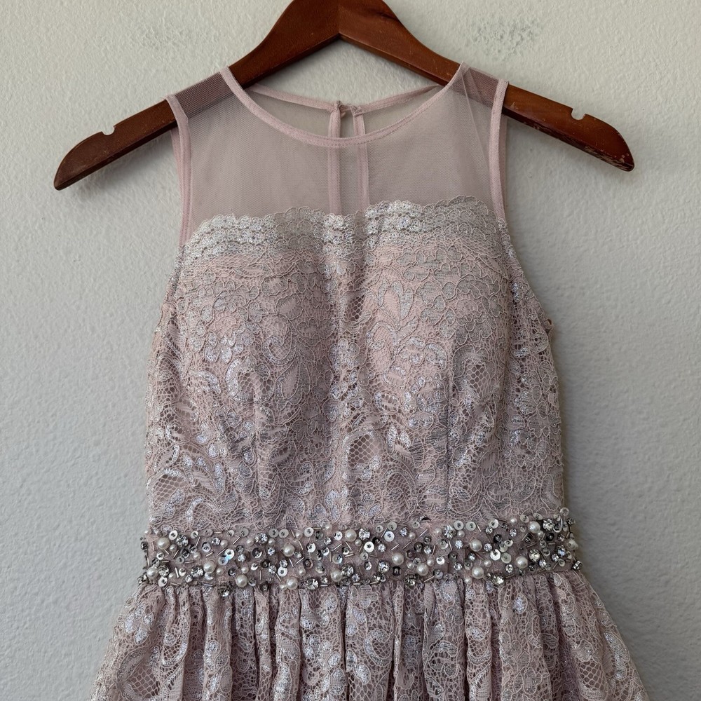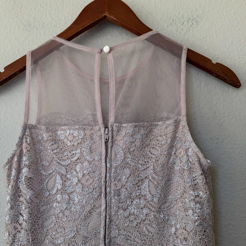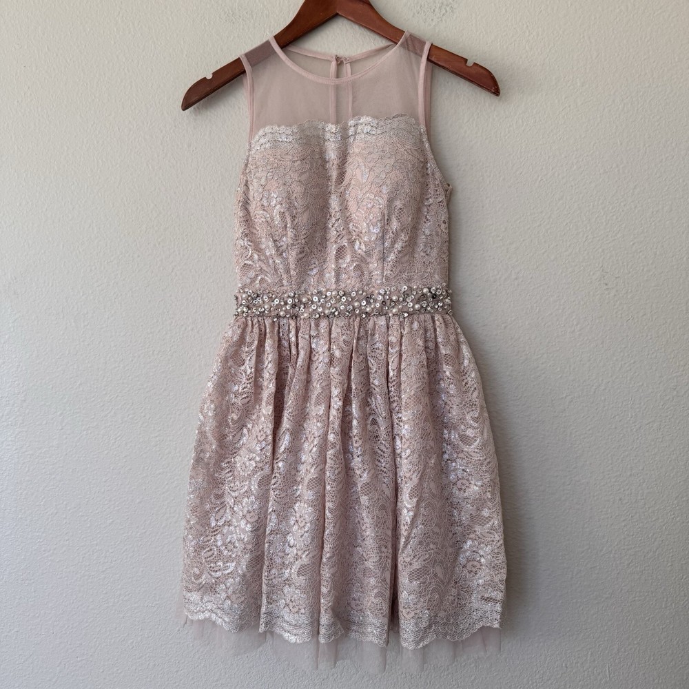 City Studio Nude And Gray Lace Fit And Flare Dress in Size 1 features a overlay lace fabric with a sleeveless design, perfect for formal occasions. The dress is adorned with beads, showcasing a sexy and bohemian style. Made of self cotton/nylon blend with a polyester lining, this short dress is ideal for the summer season.