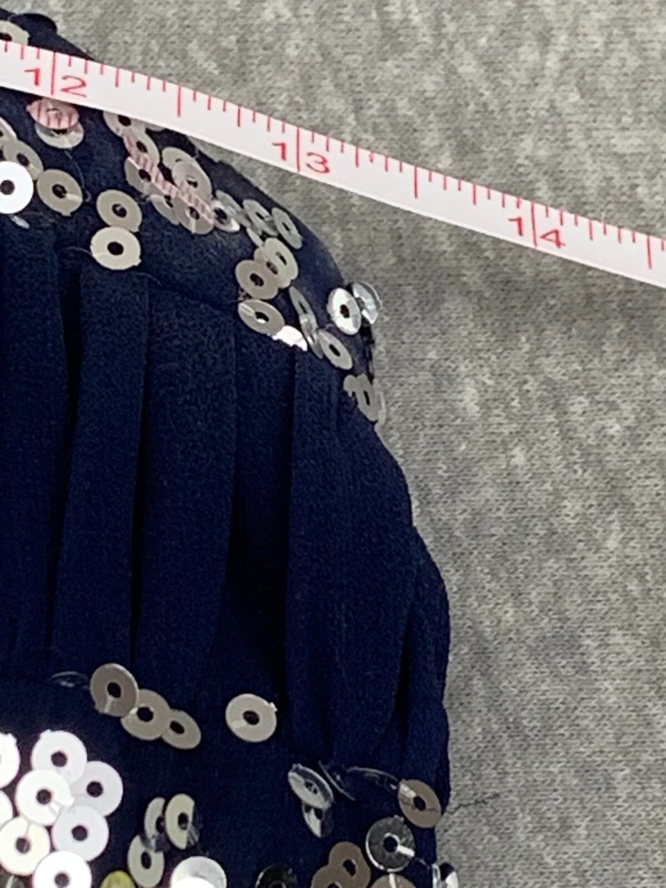 This dress is absolutely stunning! The navy blue chiffon with silver sequins catches the light beautifully, and the pleated design adds such elegant movement. Fits true to size, super flattering, and perfect for a night out or special event. The quality is amazing, and it looks even better in person—definitely a showstopper!