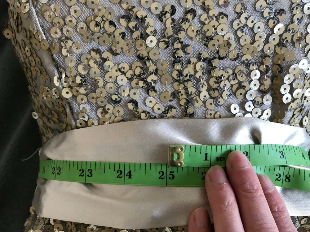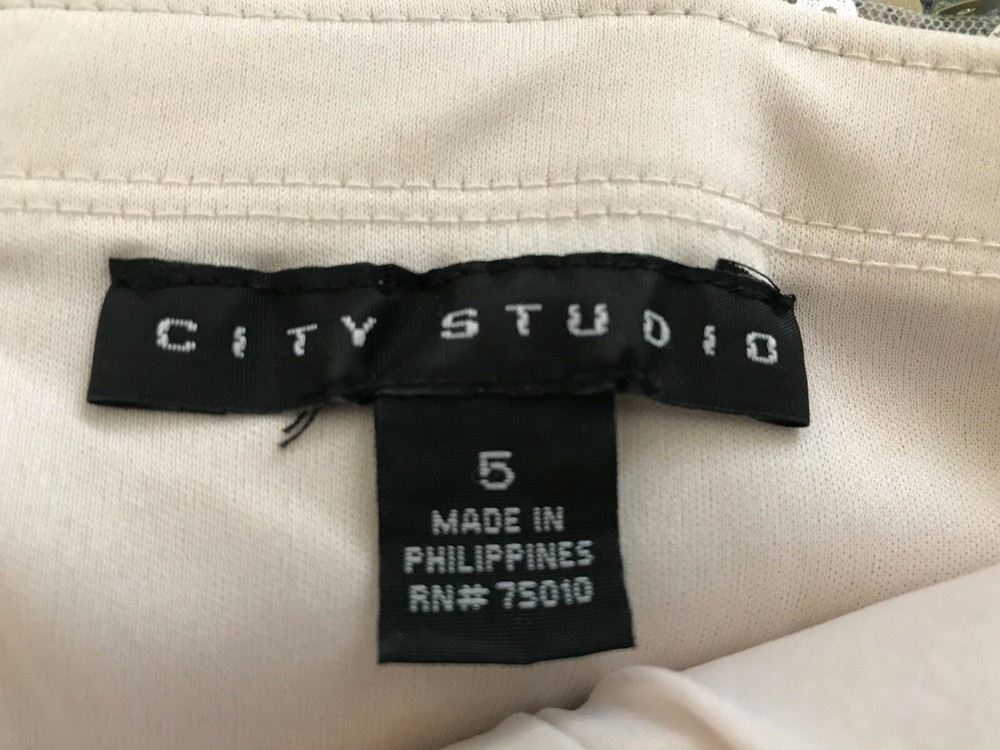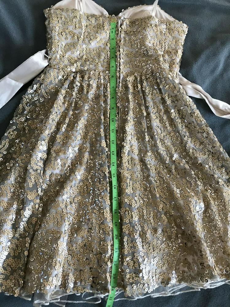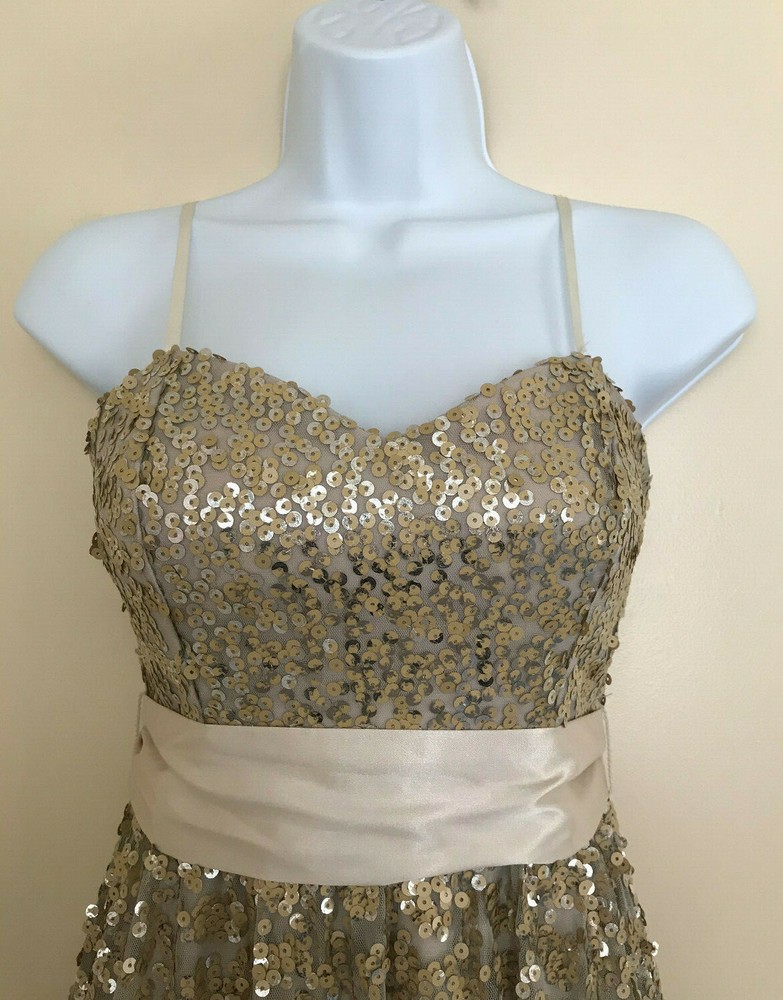 City Studio Juniors sz 5 Formal Dress Gold Sequins Tulle Fully Lined Dance Prom Cruise Juniors size 5, Fully Lined Shell: 100% Polyester, Contrast: 97% Polyester/3% Spandex, Lining: 100% Polyester Style# 9249-X-109, Cut #96584 Hand Wash Separately Excellent condition - no stains, holes or tears (see photos)