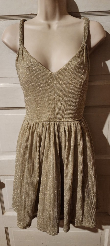 Absolutely love this dress! The sparkly gold fabric catches the light beautifully and the fit is flattering. It’s super comfortable with a smooth lining, and though there are minor imperfections in the liner, they're barely noticeable. The back zipper makes it easy to slip on, and the fit-and-flare silhouette adds elegance. Perfect for parties or a night out—feels like a glamorous steal! Smoke-free home and new with tags—wow!