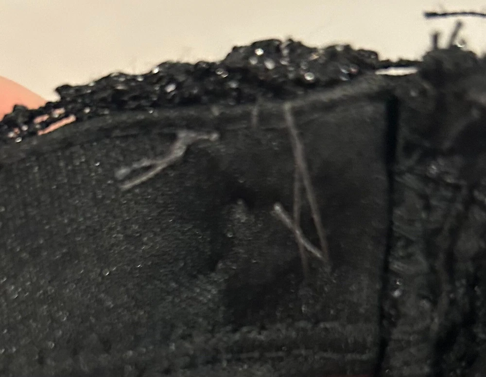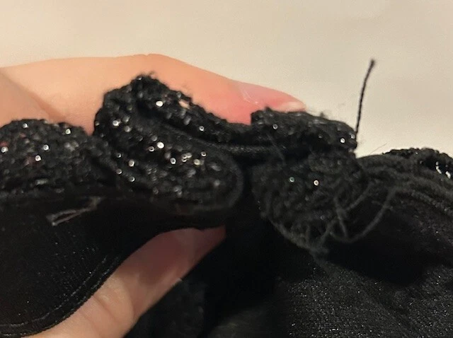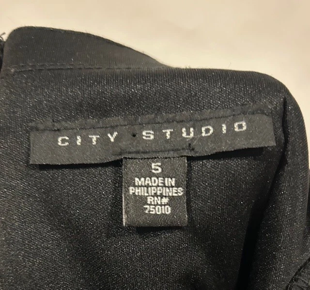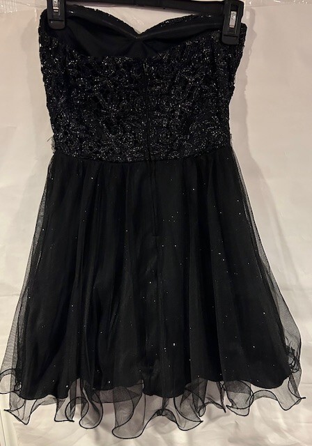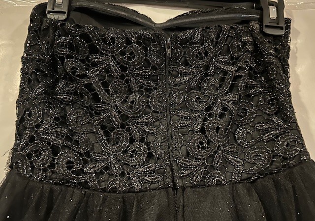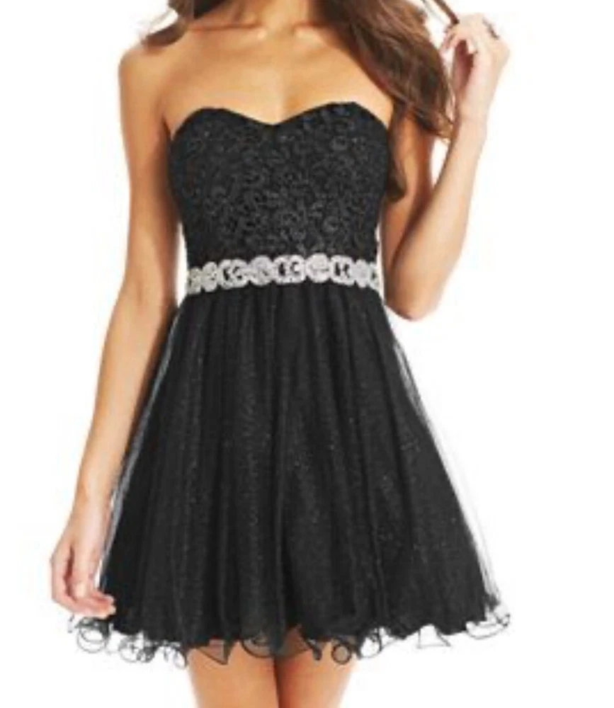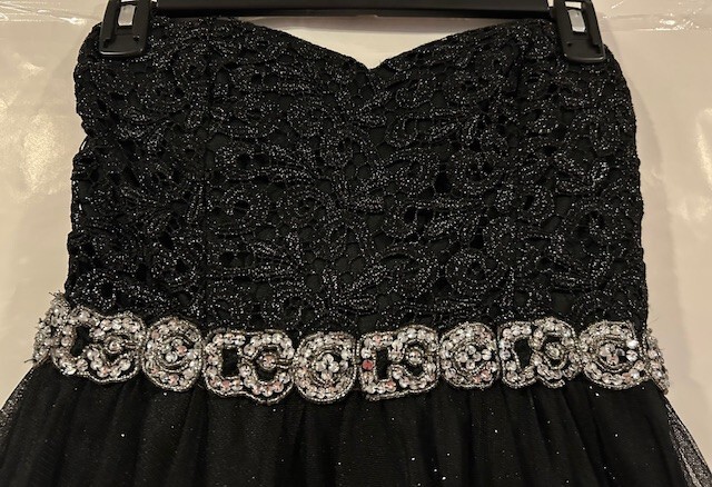 This stunning black mini dress from City Studio is perfect for any formal or party occasion. The dress features a beautiful back floral lace fabric with glitter, ruffles, and layered accents, giving it a unique and elegant look. The dress has a sweetheart neckline and strapless sleeve type, with a zip closure for easy wear. The dress is lined and made of polyester material and is recommended to be hand washed only. It is a size 5 but has previously been taken in around the underarms to make it smaller. This alteration can be removed prior to shipping if desired. The dress is perfect for juniors, making it a great addition to any wardrobe for school dances or other formal events. Note: Please tell us if you would like underarm alterations removed before shipping. This is pictured in pictures #7/8. Dress was worn only once and is in excellent condition. All rhinestones and lace are fully intact. Dress will be shipped in USPS medium priority mail flat rate box.