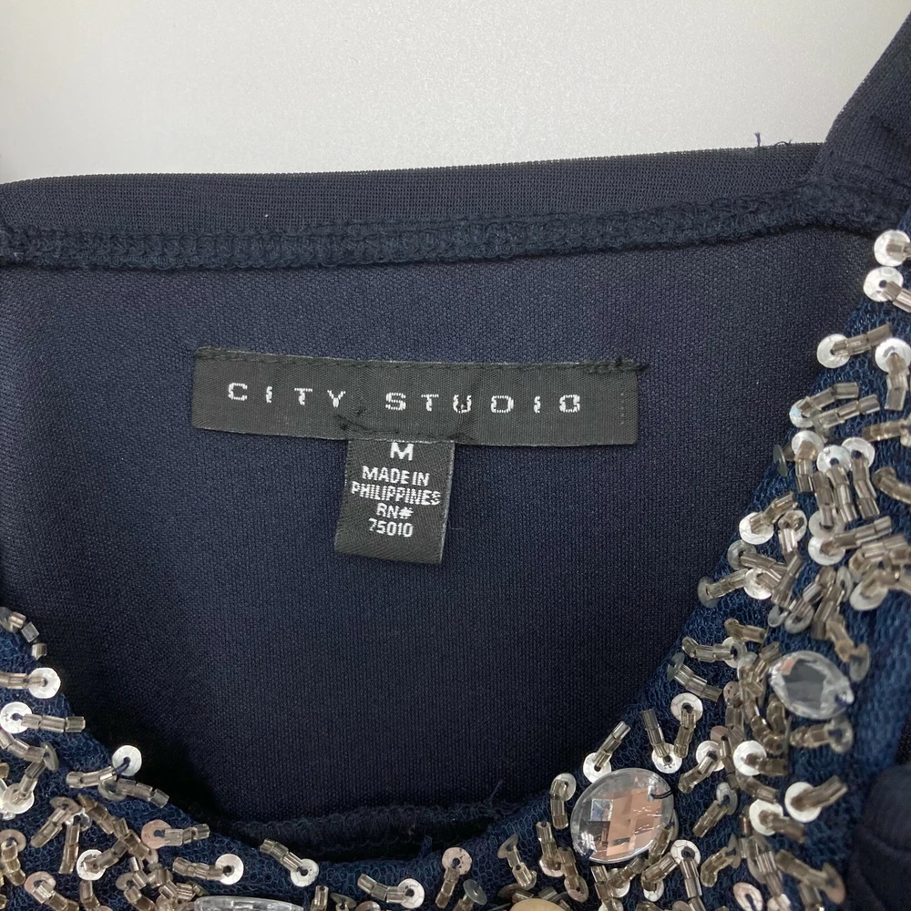 City Studio Women's Dark Blue Beaded Sweetheart Neck Fit & Flare Dress Size M Description City Studio Women's Dark Blue Beaded Sweetheart Neck Fit & Flare Dress Size M . Product Details • Brand : City Studio • Type : Dress • Color: Dark Blue • Style : Fit & Flare • Pattern: Pleated • Chest: 14" • Length : 28/37 " Please message me if you have any questions.