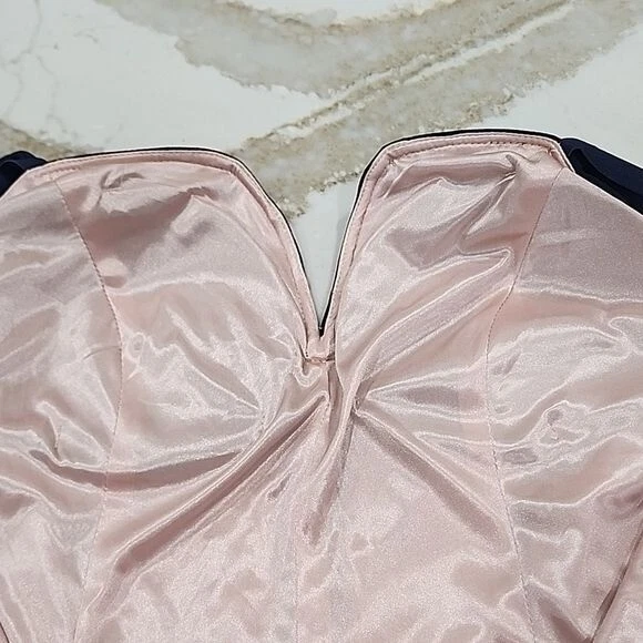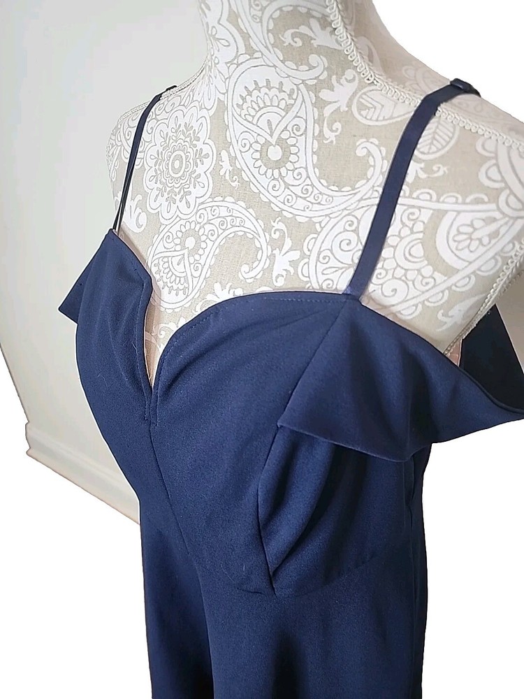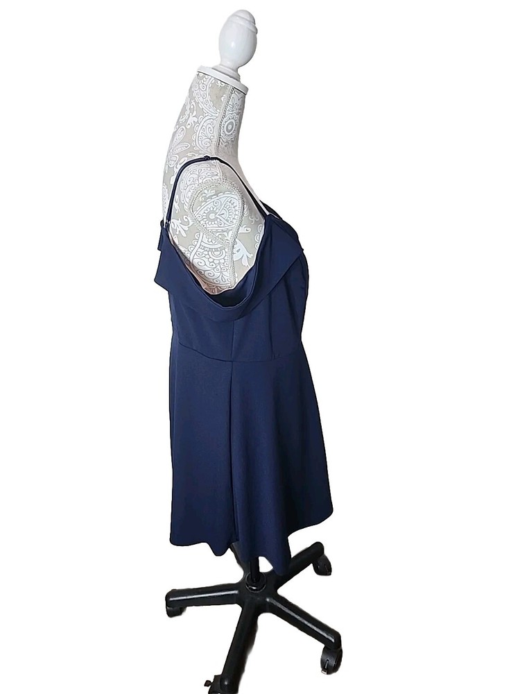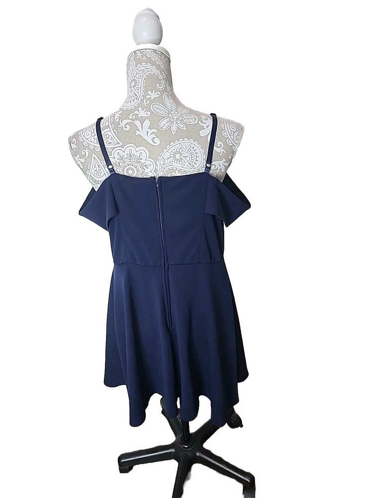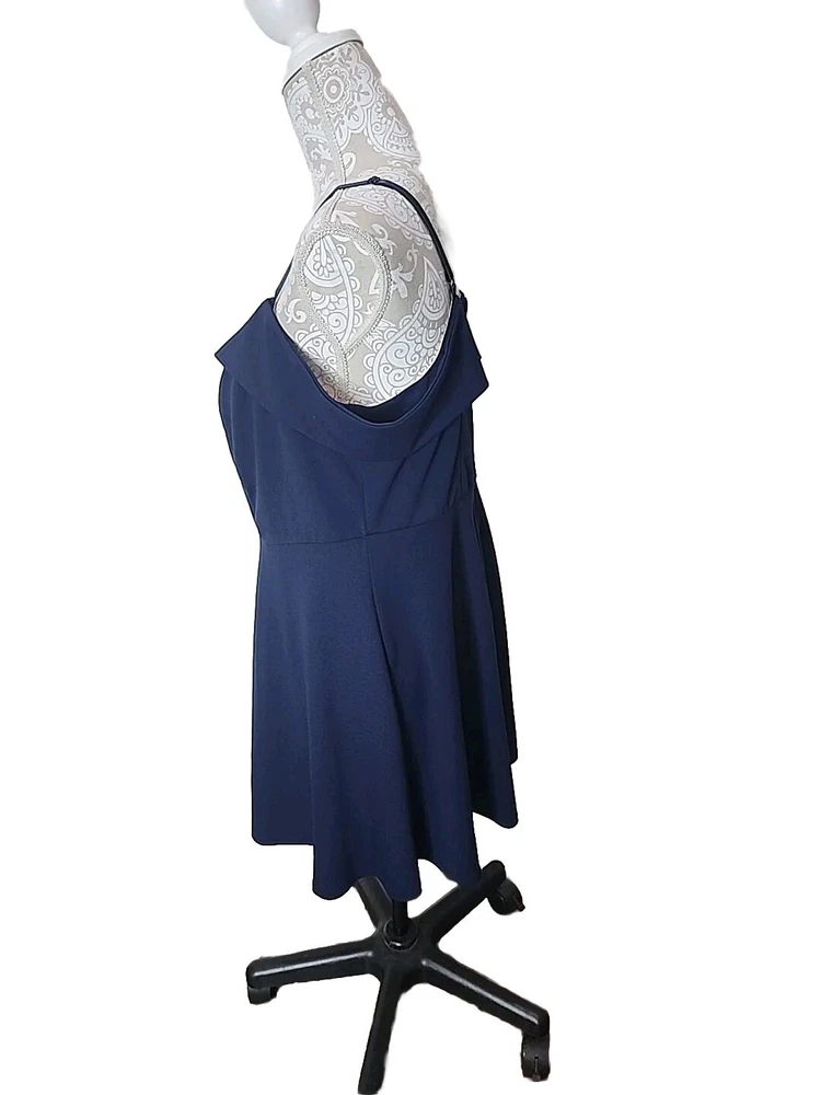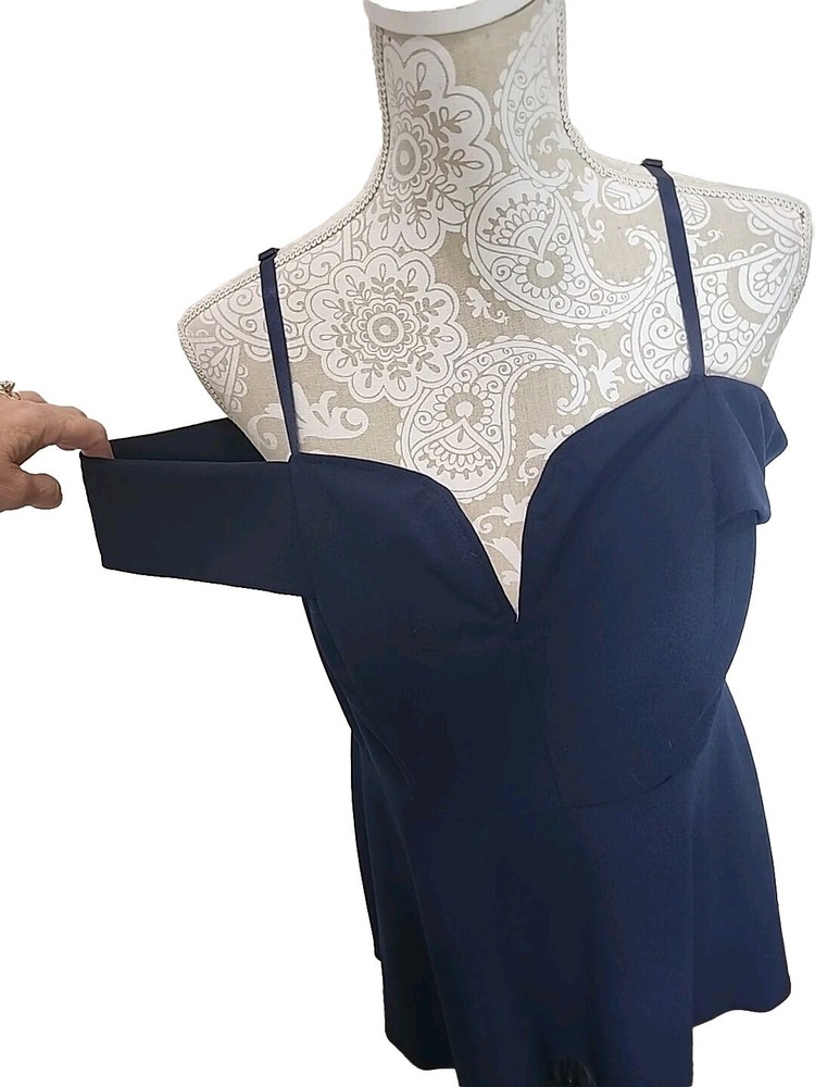 Elevate your party wardrobe with this stunning navy blue mini dress from City Studio. Designed with a sweetheart neckline and flattering cold shoulder sleeves, this dress is perfect for any cocktail event. The zip closure at the back allows for easy wear, while the lined interior ensures a comfortable fit. Featuring a size 14W regular fit, this dress is ideal for women who are looking for a comfortable and stylish option. The sleeveless design and short dress length make it the perfect party dress. So, whether you're looking to attend a wedding or a night out with friends, this dress is sure to turn heads. Perfect for cocktails, nightout, or party. Padded and has boning in the middle of chest to keep in place. Fabric tag is missing. Excellent preowned condition with no flaws. Chest 39" Waist 35" Length from shoulder 33" Adjustable Straps Cold shoulder is a drapey look on your arms.