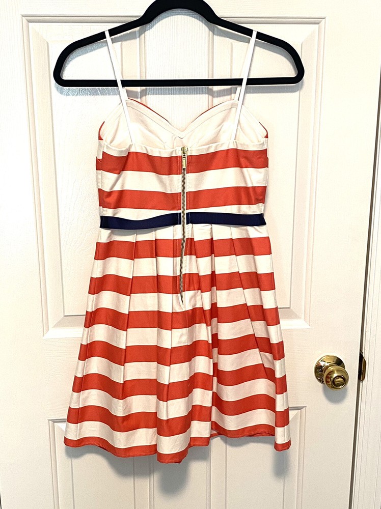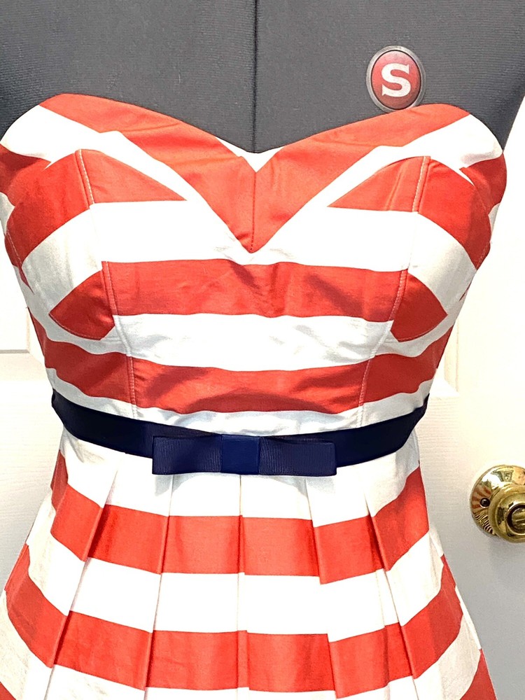 City Studio juniors strapless A-line dress 1 This is a coral pink & white striped dress. Navy blue ribbon bow accent at waist Laying flat armpit to armpit 14” Laying flat waist 12.5” Length from the b...
