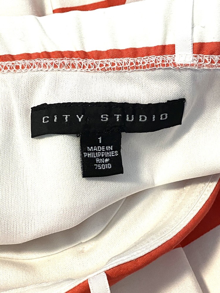 City Studio juniors strapless A-line dress 1 This is a coral pink & white striped dress. Navy blue ribbon bow accent at waist Laying flat armpit to armpit 14” Laying flat waist 12.5” Length from the bust 23.5” Retails $59