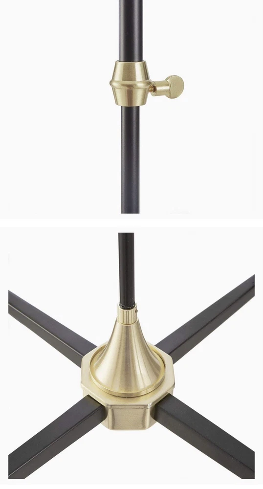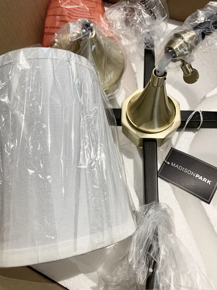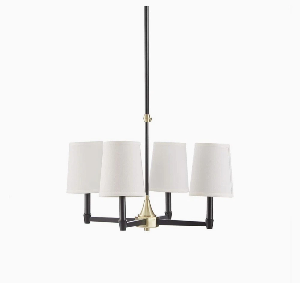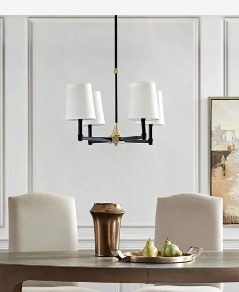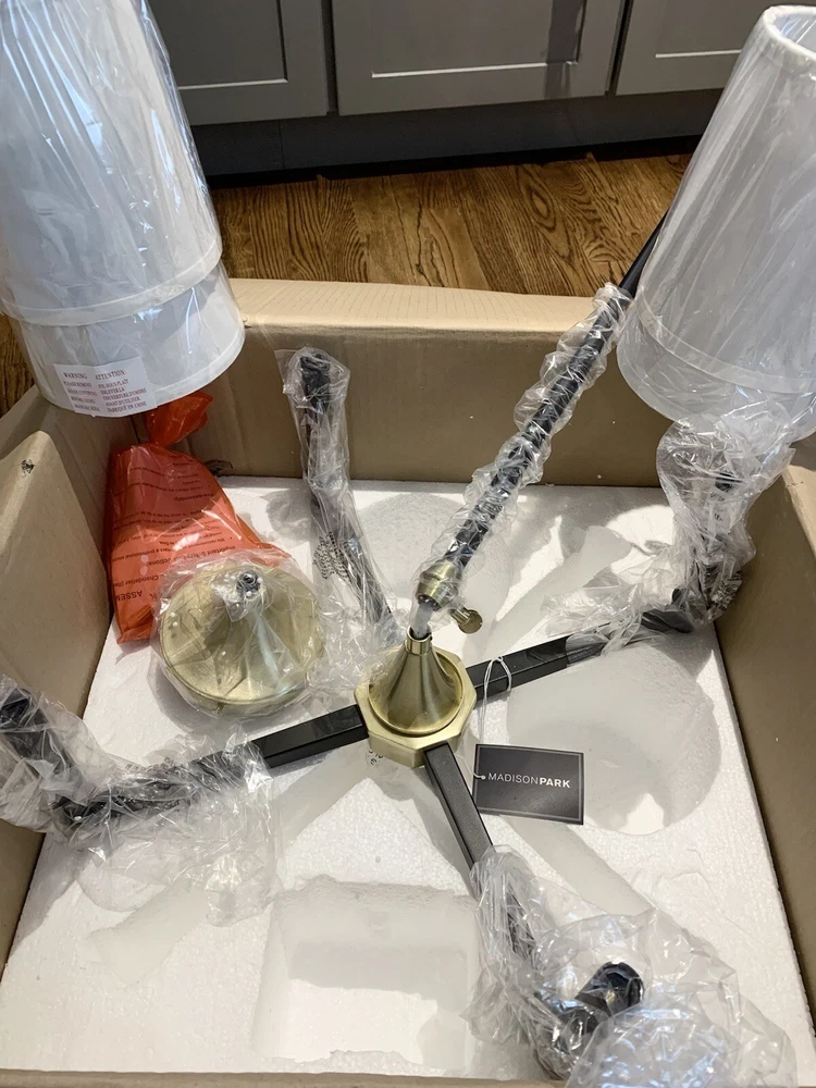 NEW in opened box. Clark Chandelier from Madison Park. Tapered fabric shades in a white hue contrasts with black and gold finishes on metal frame. Measures 26”x26”x36” Shades measure 5.5”x7” (polyester/cotton blend)