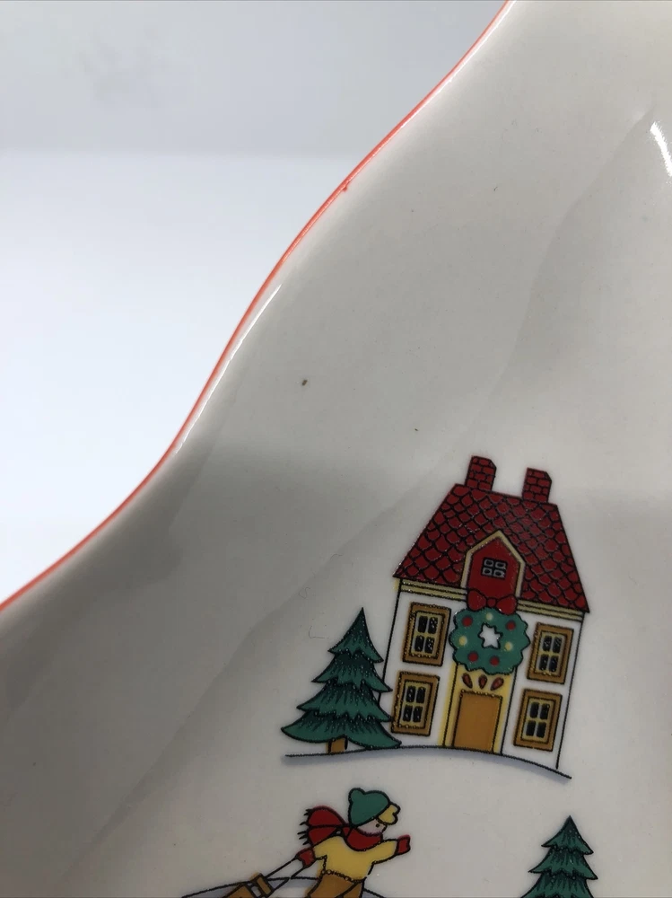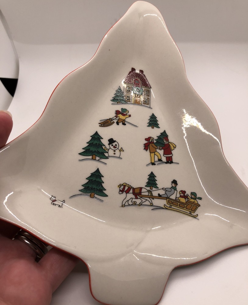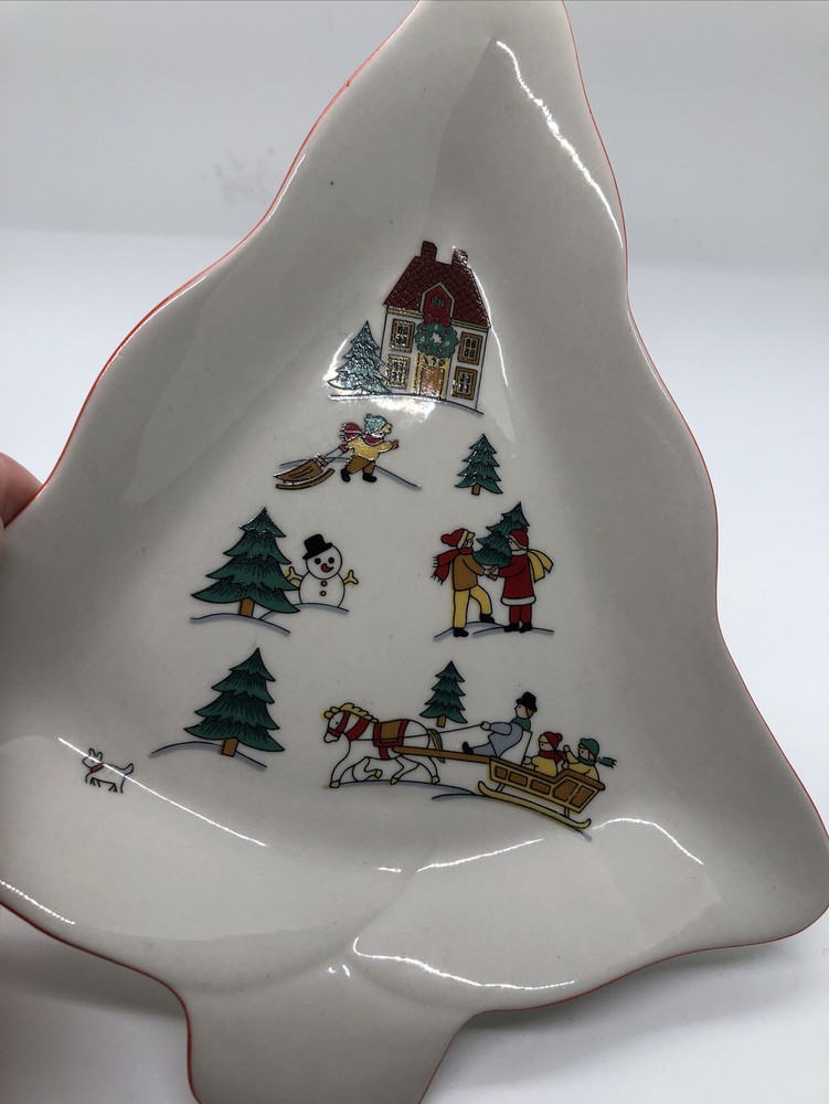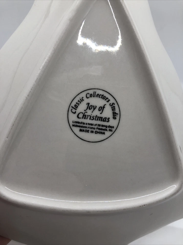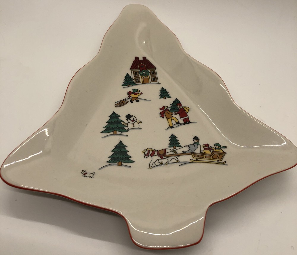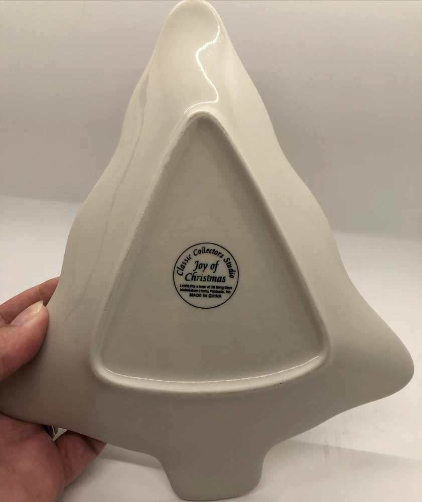 Classic Collectors Studio JOY OF CHRISTMAS Tree Shaped Serving Dish 8-3/4" Tree shaped dish with Christmas/winter scene graphics. 8.75" in height and 7.5"in width and its widest point. Diameter measures about 7.75". Good condition. One dark speck in the upper left side of the dish, please see photo #6. Also, some uneven red trim coloring on the right side of the tree, see photos 7 & 8. SOLD AS IS. Buy With Confidence- eBay member since 2001 with excellent feedback I have a lot of great items listed, so be sure to check out my other items ! Visit My eBay Store: cuneoml's Fashion Finds . U.S. Domestic Returns are gladly accepted if the item is returned in the exact condition in which it was delivered within 30 days of purchase. If you have any questions or need more pictures, please feel free to ask. I am happy to help. Be sure to add me to your favorites list! I add lots of new items on a frequent basis and all come from a smoke free home.