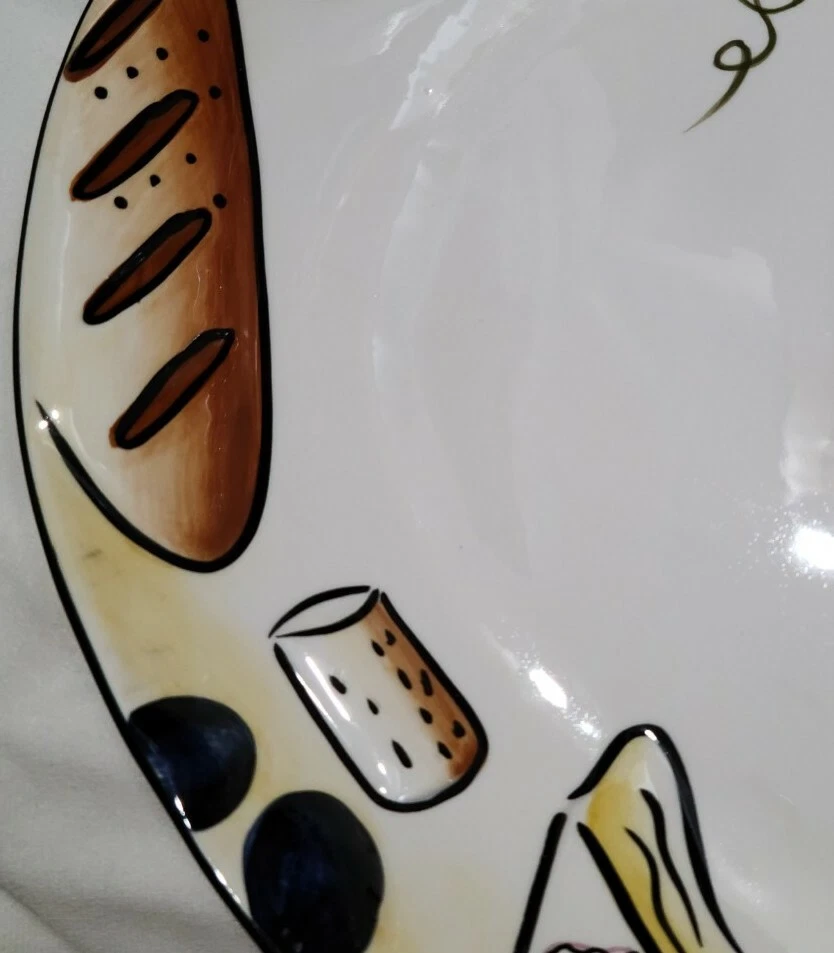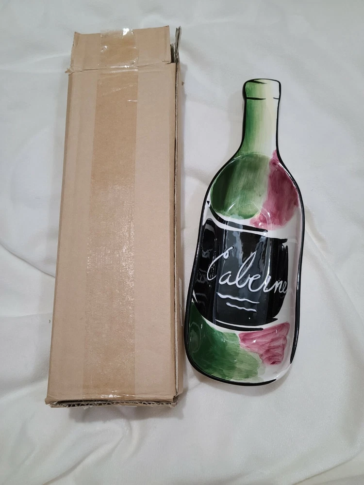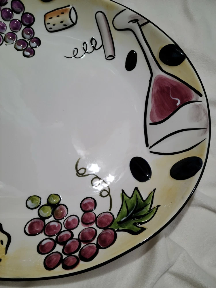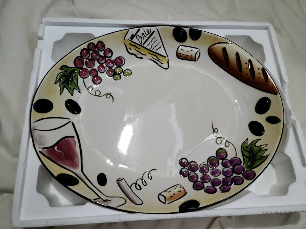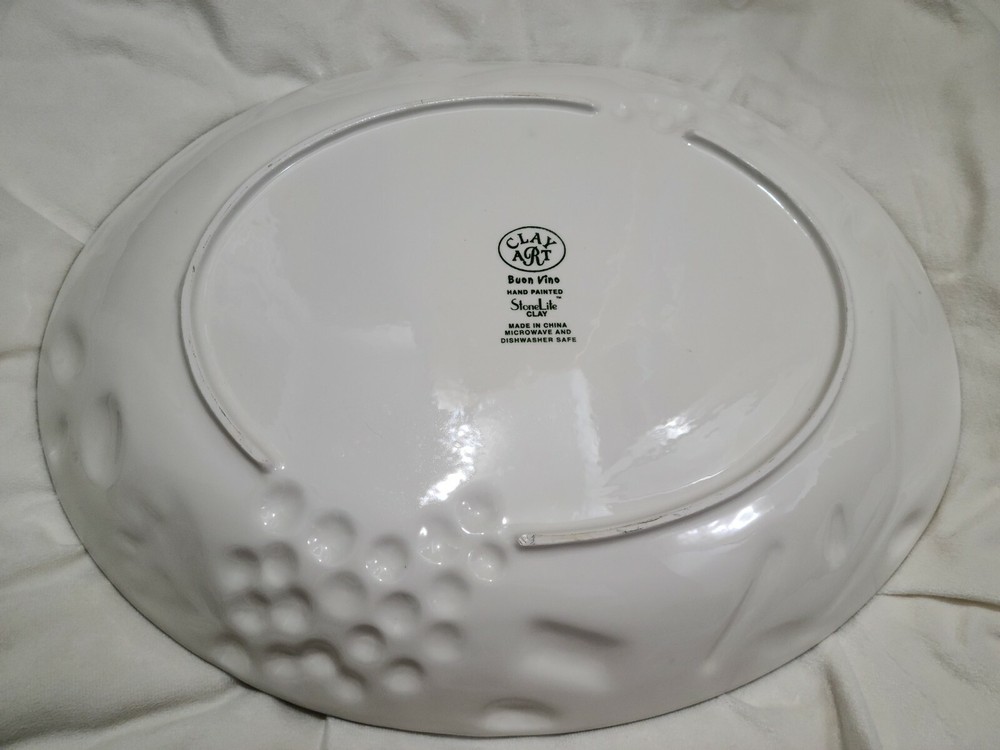 Clay Art 2 Piece Ceramic Chip And Dip Set Platter Serving Dish Buon Vino EUC. This set comes in the original box and has only been taken out for use. Has some minor wear to the bottom including a very small chip on the bottom rim (does not affect dish use--pic 5). Dip dish has some minor wear on the bottom (pic 9) but overall the set is in excellent condition! According to the box, the platter is 17 1/4 x 13 1/2 inches.