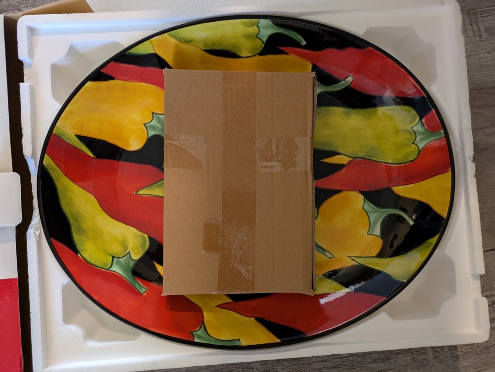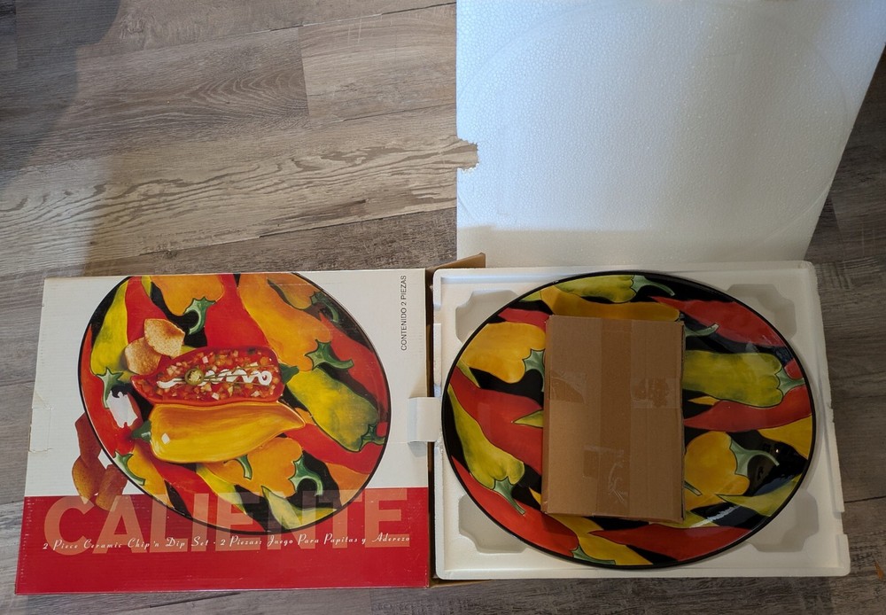 Vintage 2000 Clay Art Caliente 2 Piece Ceramic Chip 'n Dip Set. A spectacular oval ceramic server, peppered with red, yellow, and green chilies, adds spice to your favorite chips and dip. The dip bowl is a red and a yellow chili pepper shape. Platter measures 17.5" x 14". This is new in box! We ship out as soon as possible after payment has been received! Thank you for checking out our eBay store. God bless you. BRCT-AAPP