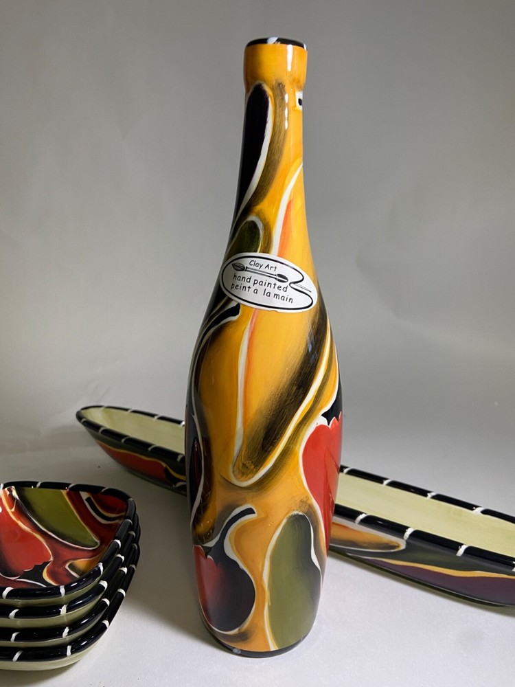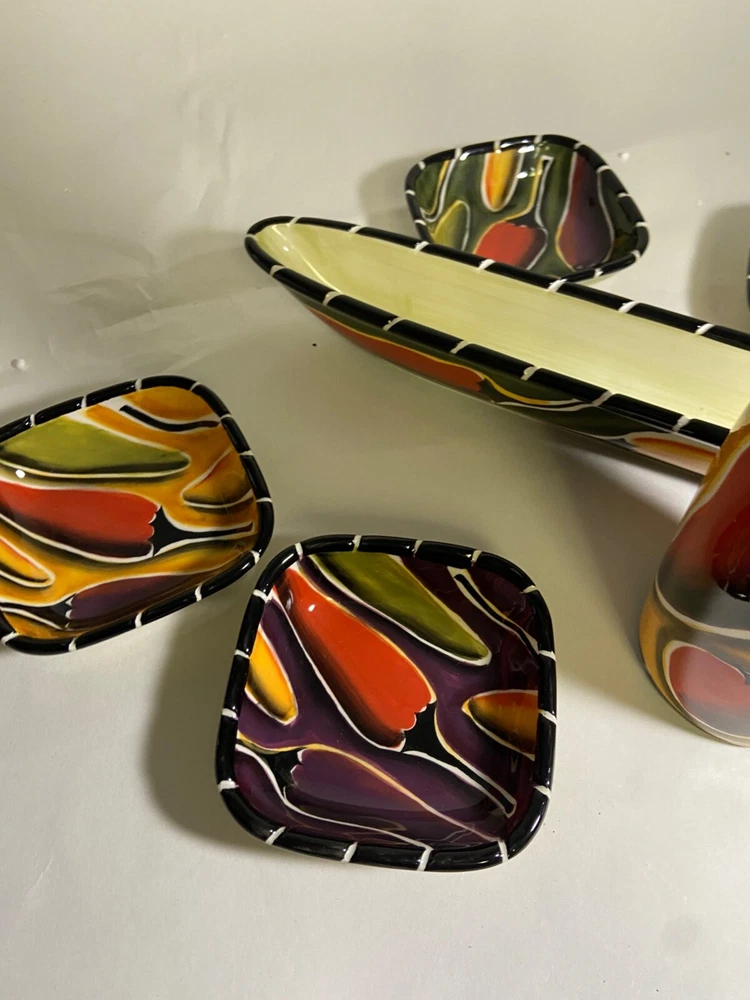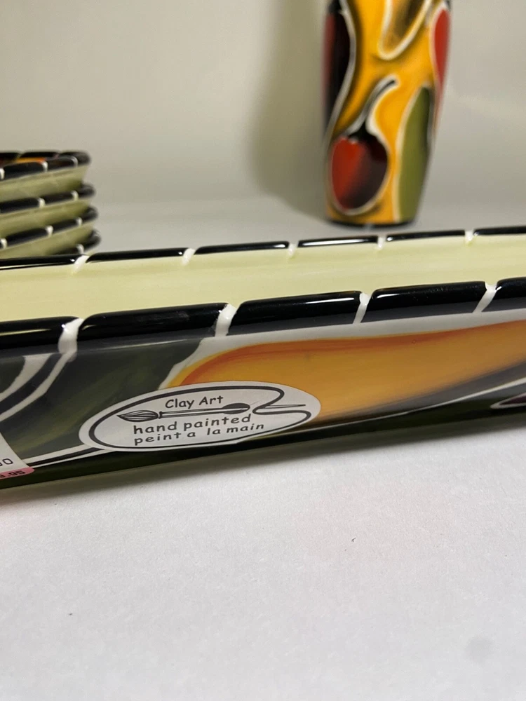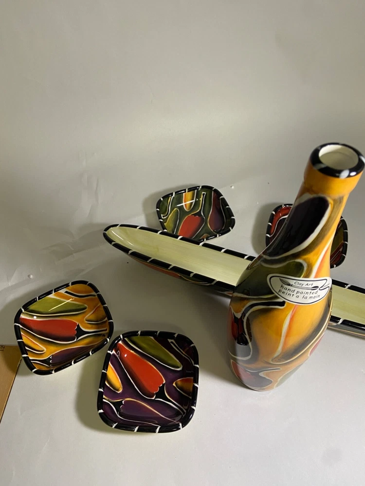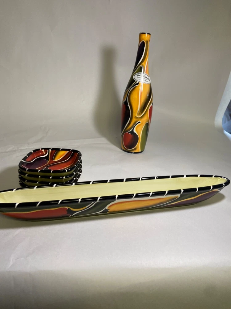 Beautiful, never used Clay Art brand Caliente pepper theme. 4 dipping trays. One tall bottle/jar. and one long tray....