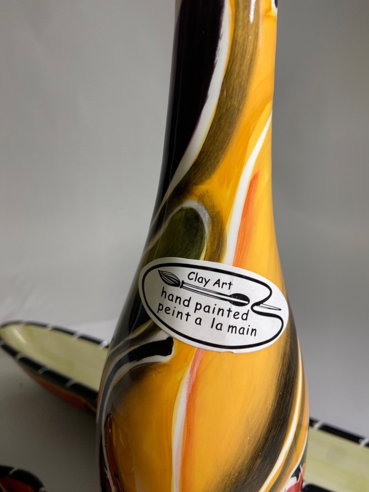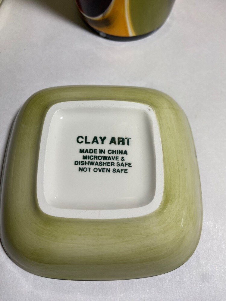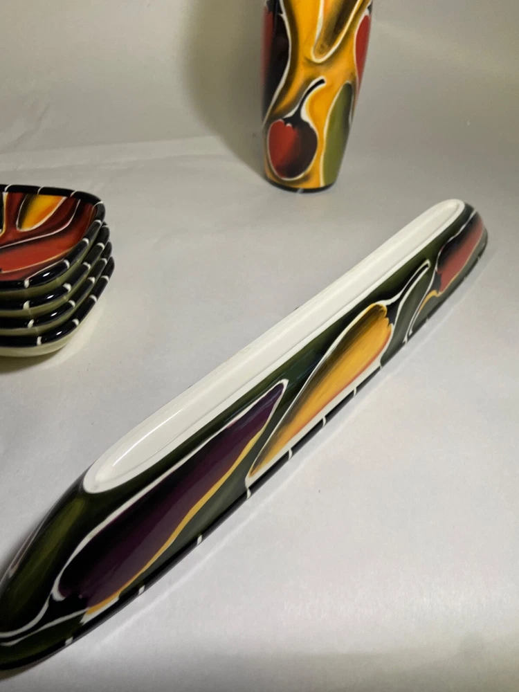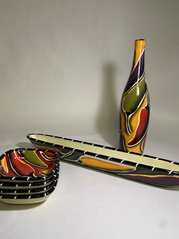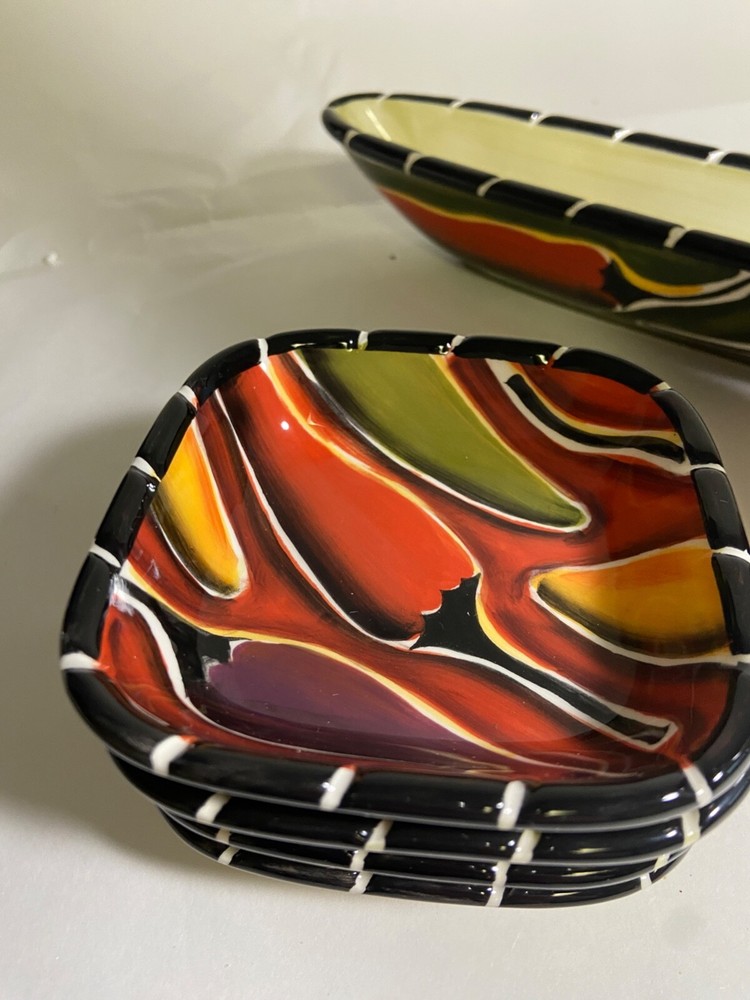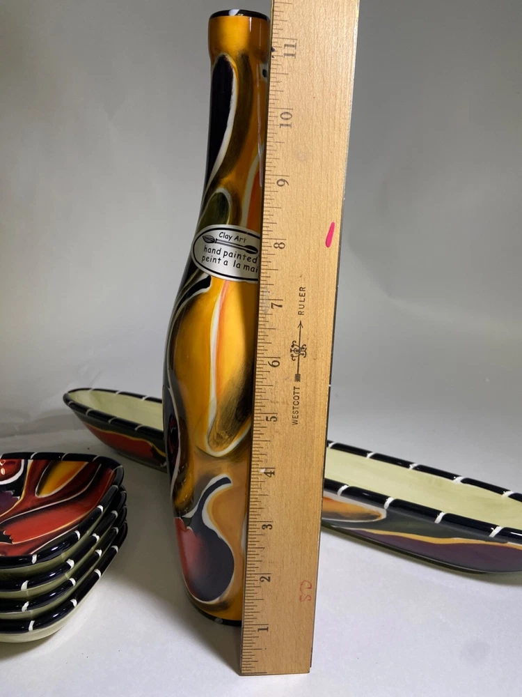 Beautiful, never used Clay Art brand Caliente pepper theme. 4 dipping trays. One tall bottle/jar. and one long tray....