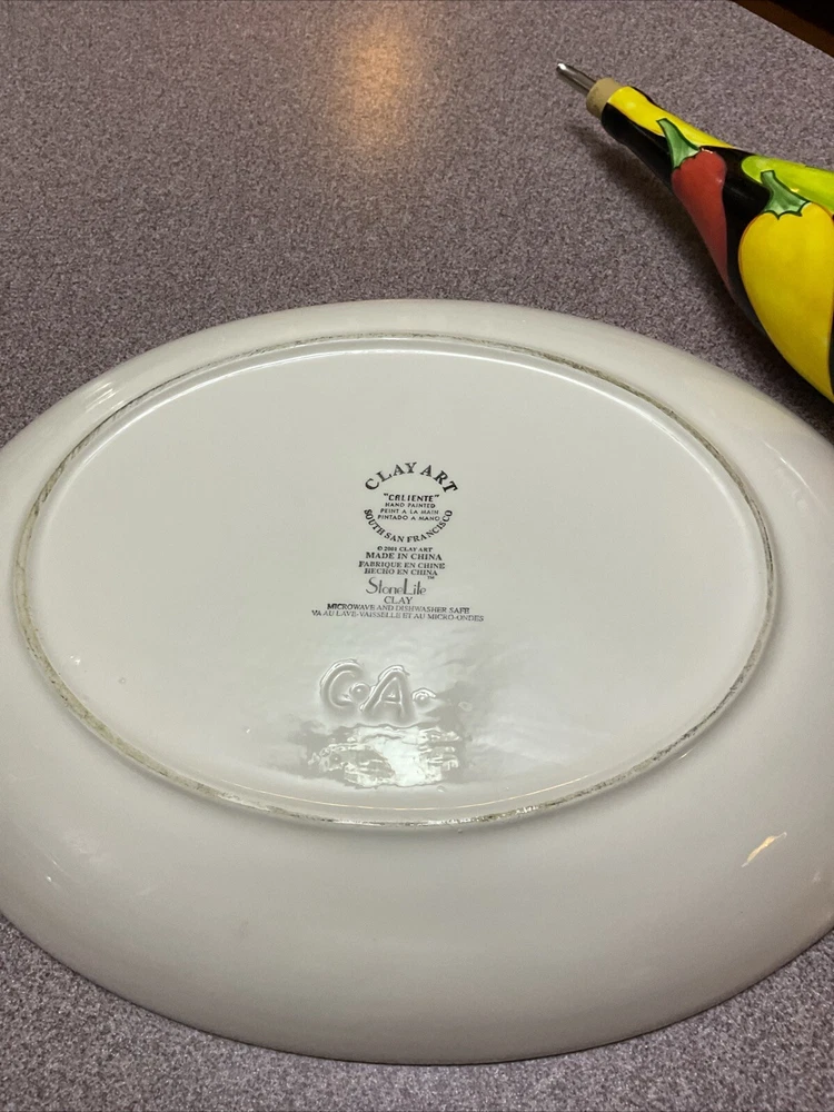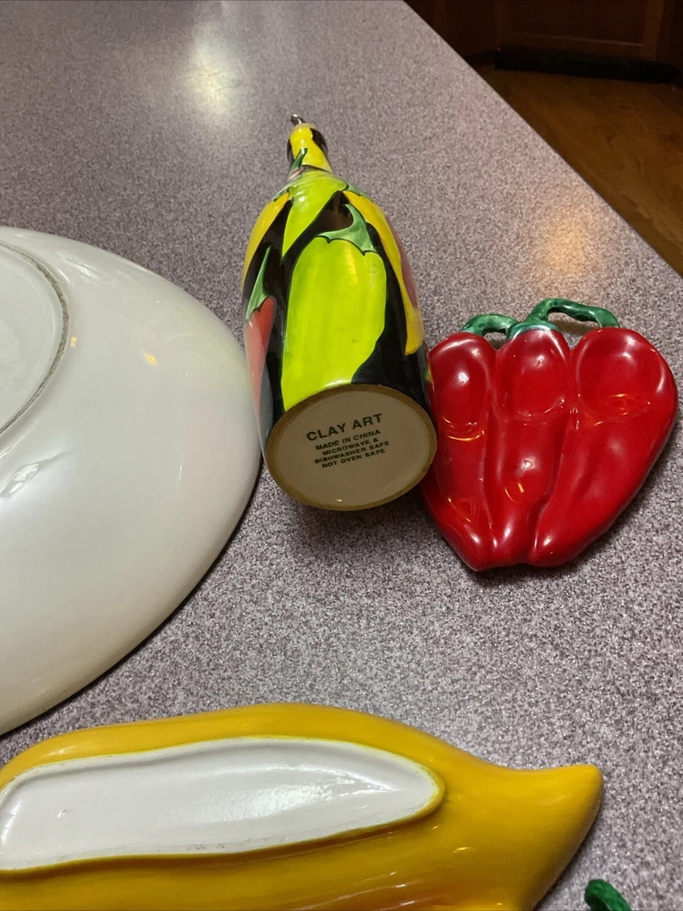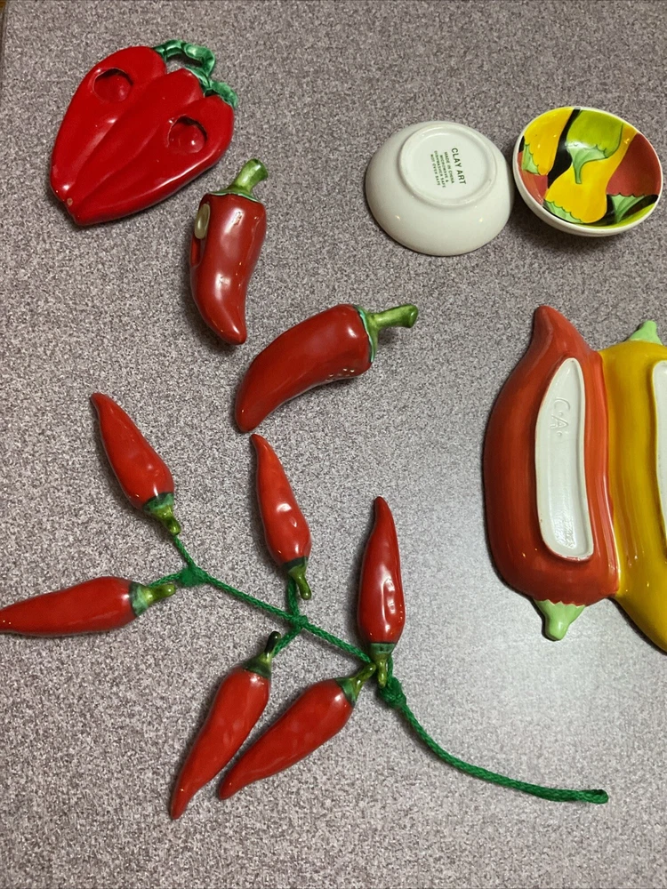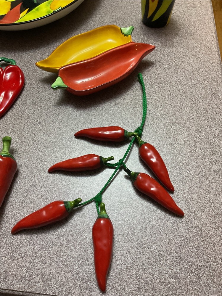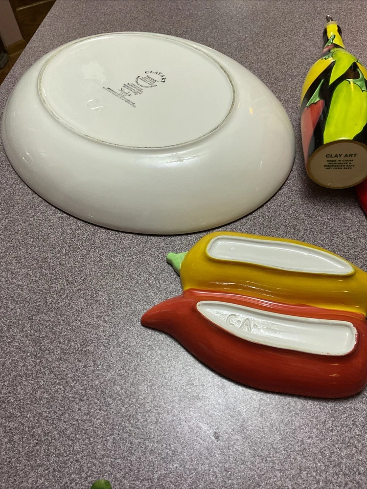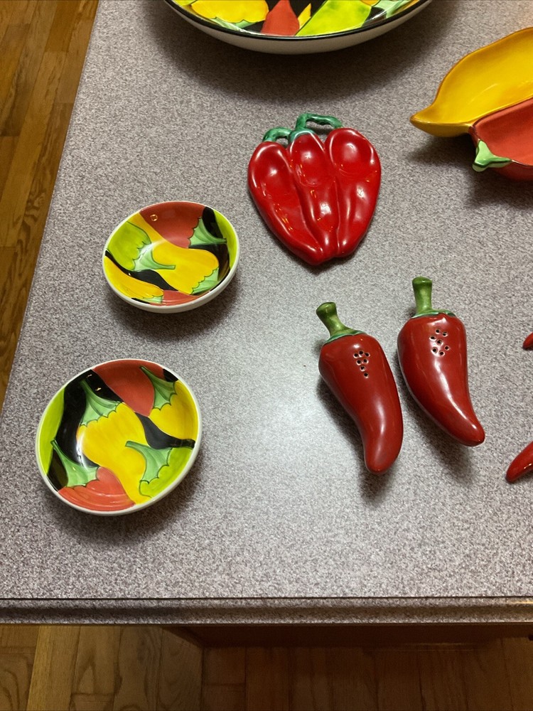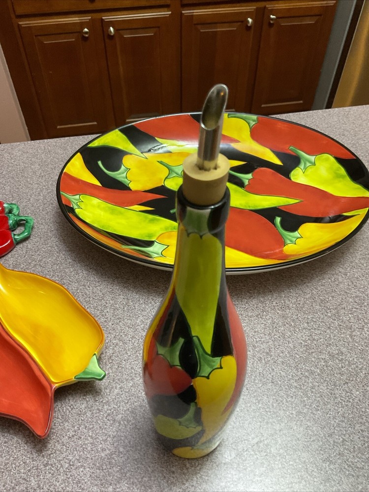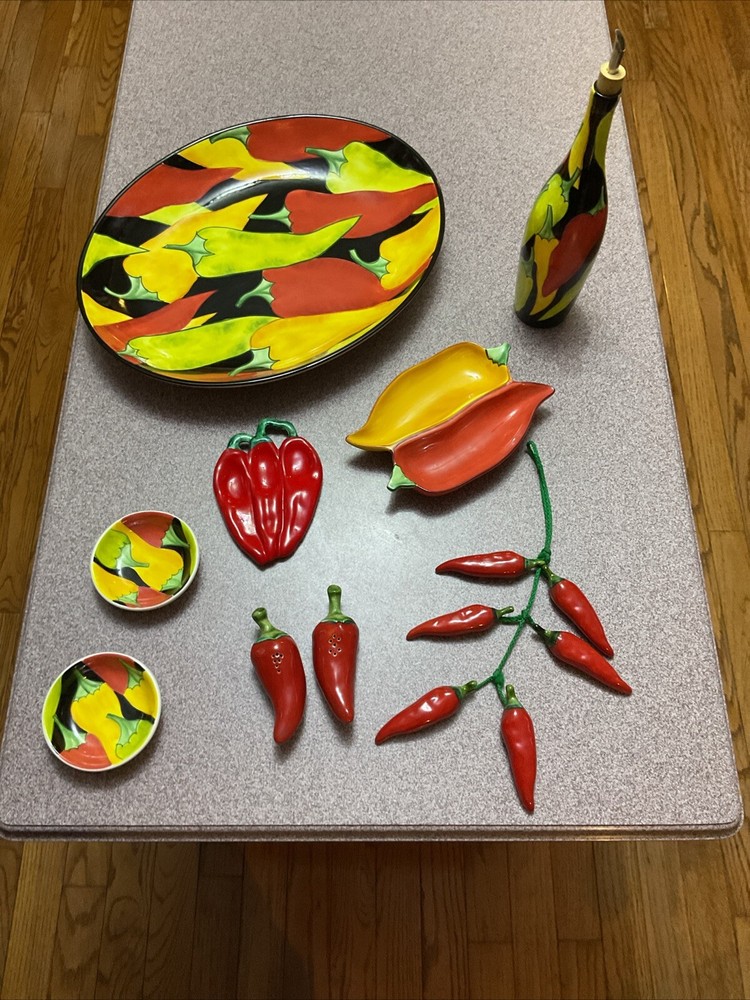 Enhance your serving collection with the Clay Art Caliente Large Oval Serving Platter Tray, featuring a vibrant set of nine chili peppers. With a shiny finish, this ceramic platter boasts a playful yet elegant Southwestern style that's perfect for any occasion. The multi-color peppers pattern adds a festive touch to your table, making it a great conversation starter at your next gathering. Crafted for both convenience and durability, this eight-piece set is dishwasher and microwave safe, ensuring easy maintenance and versatility. Whether you're hosting a dinner party or enjoying a casual meal with family, this platter set is an original, eye-catching addition to your serveware repertoire. THIS IS TGE WHOLE SET Comes with the platter, olive oil bottle, corn, cob holder, salt and pepper shakers hanging peppers and two small dipping dishes Family owned never used was always displayed. Thank you for looking.