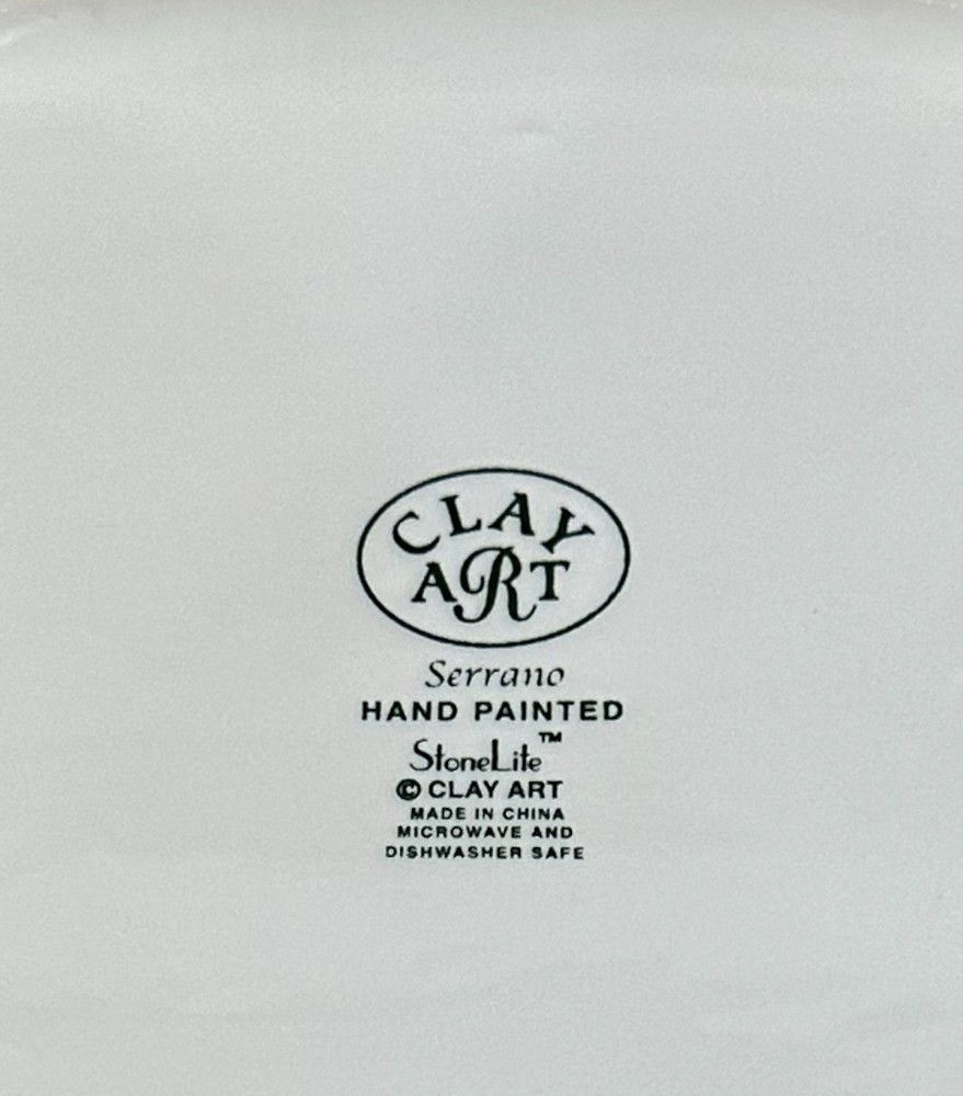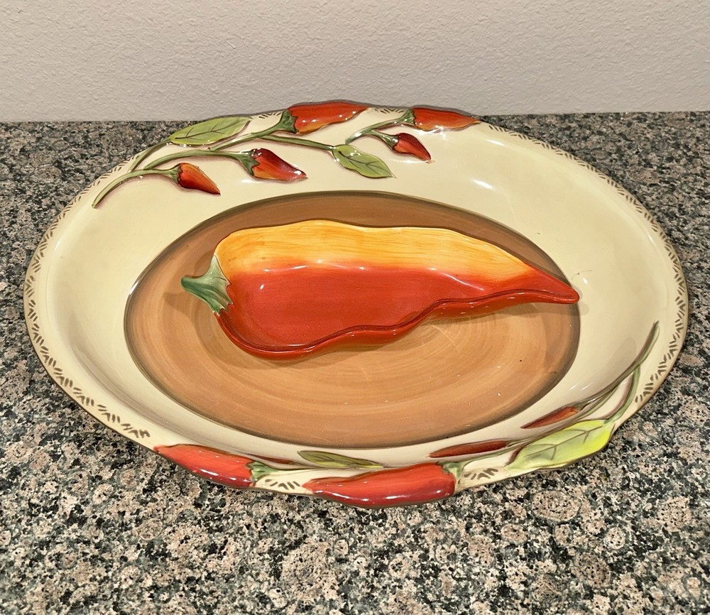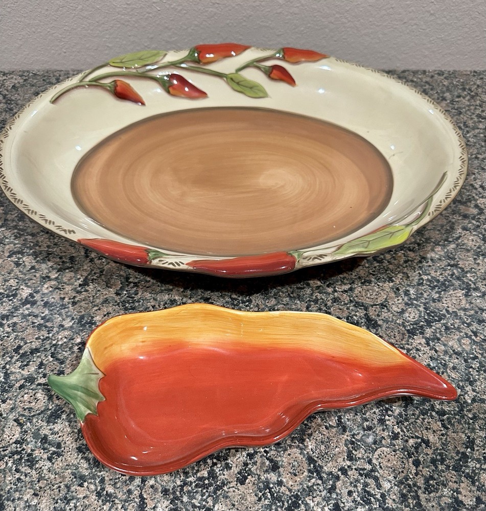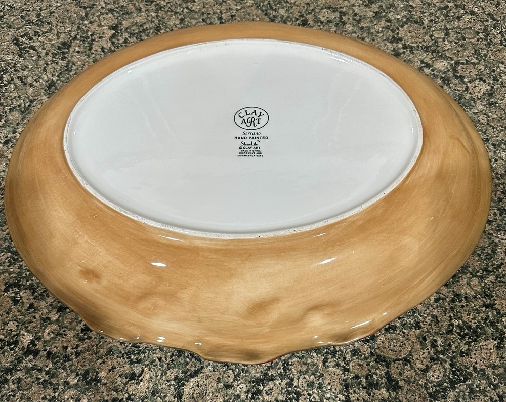 Enhance your entertaining collection with the Large Clay Art Serving Bowl, accompanied by a matching Pepper Shaped Dip Tray. This set, featuring a vibrant multicolor Red Pepper pattern, adds a splash of color and sophistication to any table setting. The stoneware's glossy finish highlights the hand-painted decorations, ensuring that each piece is a unique work of art. Designed for both functionality and aesthetics, the oval-shaped platter measures 17.6 inches in length and weighs a sturdy 4.75 lbs. The Serrano product line boasts a charming peppers theme, and though unbranded, these pieces evoke a distinctive style that is sure to impress guests and add a festive touch to your culinary presentations.