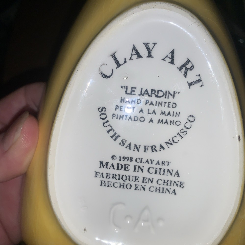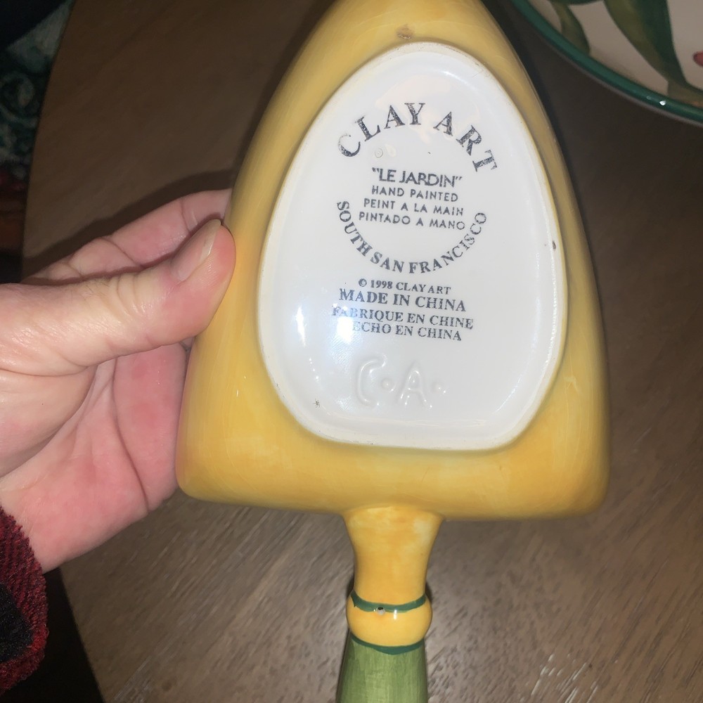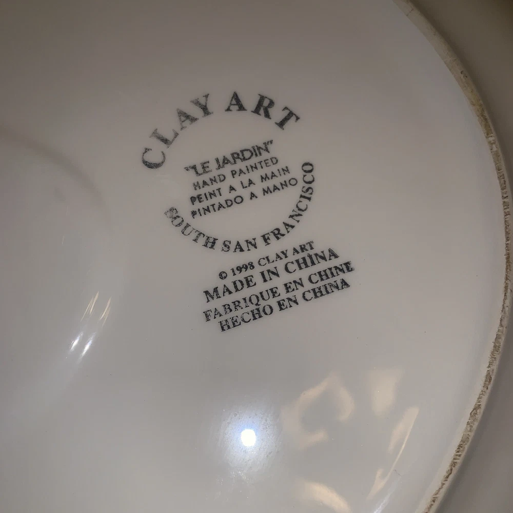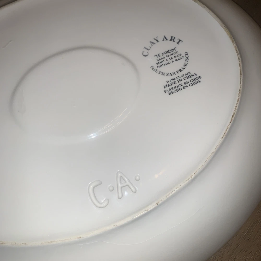 Enhance your dining experience with this exquisite Clay Art Le Jardin Large Oval Serving Platter. The platter measures 17" x 13” with a matching dip bowl, making it perfect for hosting gatherings and events. Crafted from high-quality porcelain, this multicolor platter features an art-themed design that adds a touch of elegance to any table setting. The oval shape and 12-inch diameter make it easy to serve large dishes, while the 2-inch depth ensures that sauces and dips stay in place. Made in China, this serving platter is sure to impress your guests and elevate your dining experience. There is 2 small chips in the scope.
