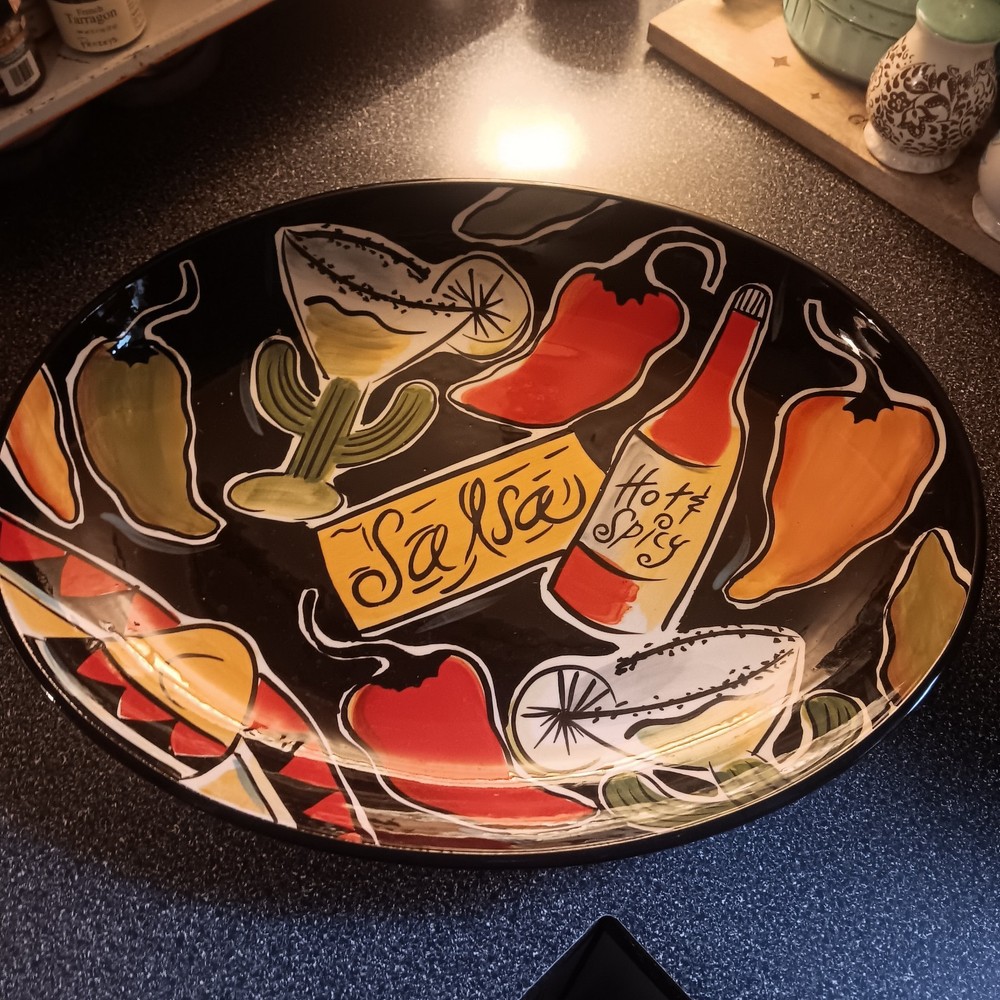 Clay Art Salsa Hand Painted Large 17”x13.5” Oval Serving Platter w/ Dip Dish. Condition is Used. Shipped with USPS Priority Mail.