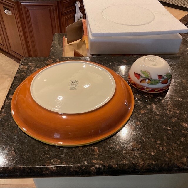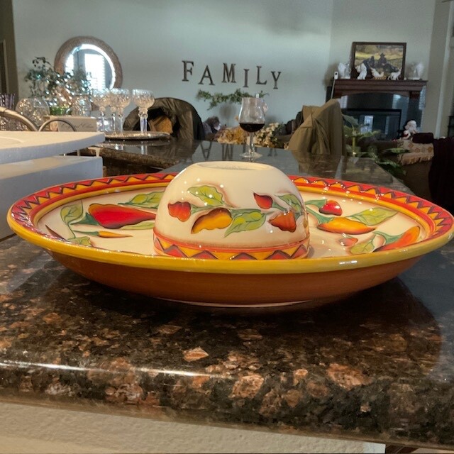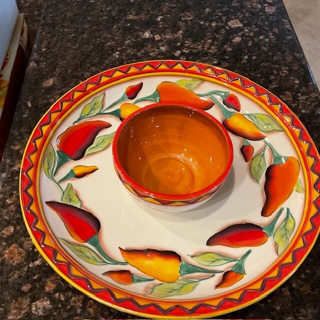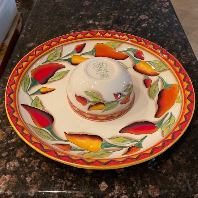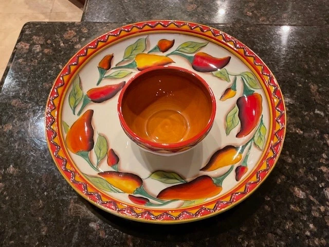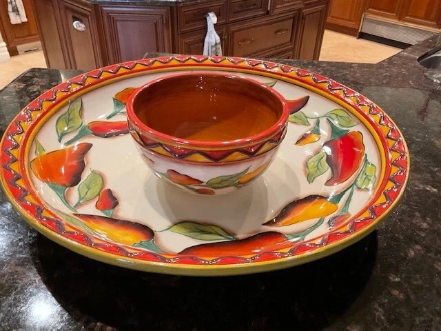 Clay Art Santiago Chili Stonelite Pepper 2 Piece Chip N' Dip Set - Hand Painted / Glazed Finish. 16" Platter/Bowl; 6" Dip Bowl. Packaging indicates dishwasher and microwave safe and not oven safe. Personally I would handwash. SEE PICTURES.
