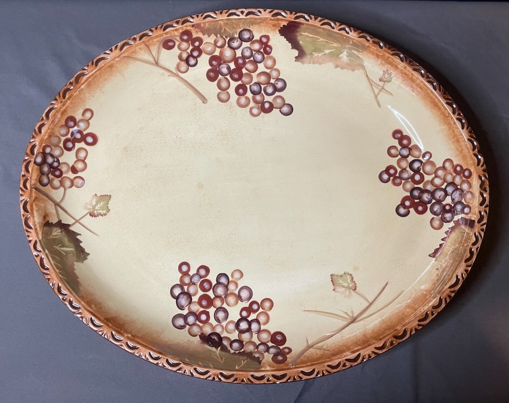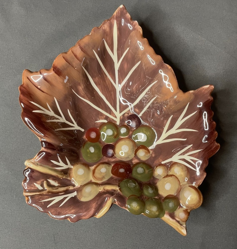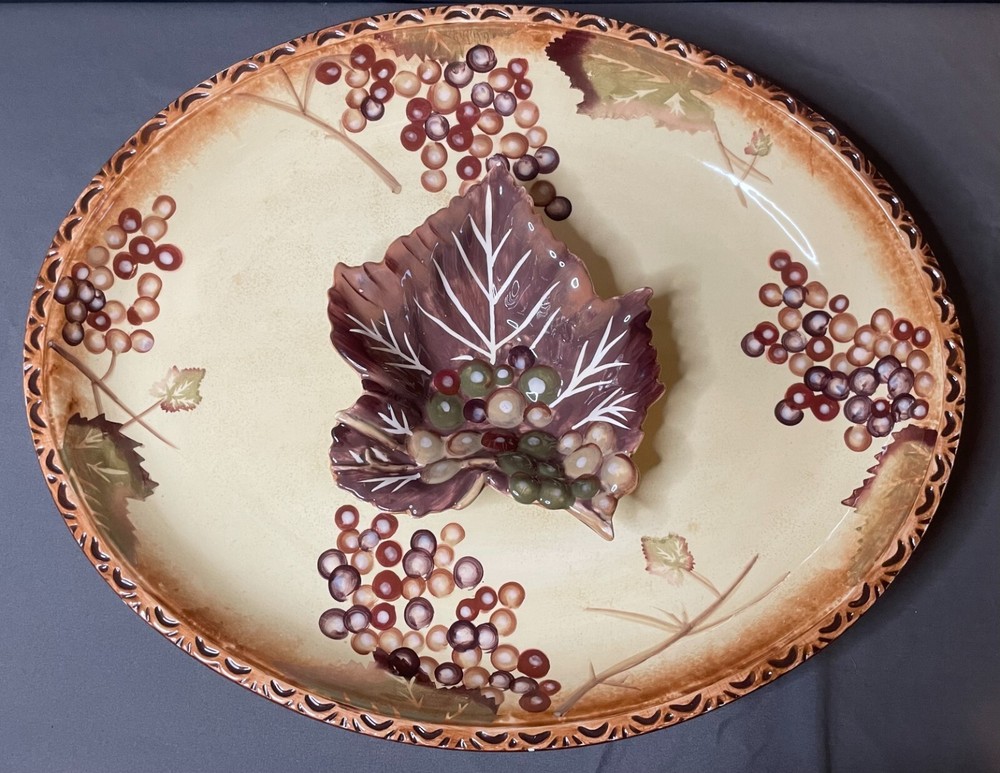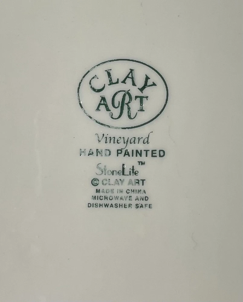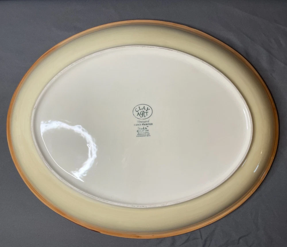 Clay Art StoneLite Vineyard Hand Painted Serving Platter/Tray & Grape Leaf Dip Bowl Large Oval Serving Platter- Pattern: Light brown with grapes and grape leaf design Length: 17.5" Width: 14.25" Depth: 2.5" Material: Ceramic, Stoneware Dishwasher/Microwave Safe Pre owned condition. There is some minor crazing in the middle of the platter and a couple small chips on one side- see photos. Grape Leaf Dip or Olive Bowl: Pattern: Purple textured grape leaf shaped with painted grapes Length: 7.25” Width: 6.5” Depth: 1.5” Material: Ceramic, Stoneware Dishwasher/Microwave Safe There is some minor crazing in the middle of the bowl, and two small chips on the tips of the leaf - see photos.