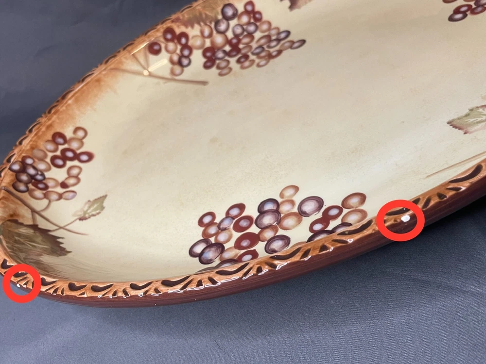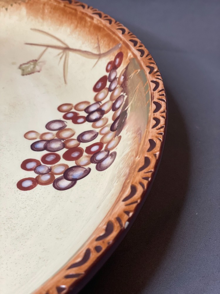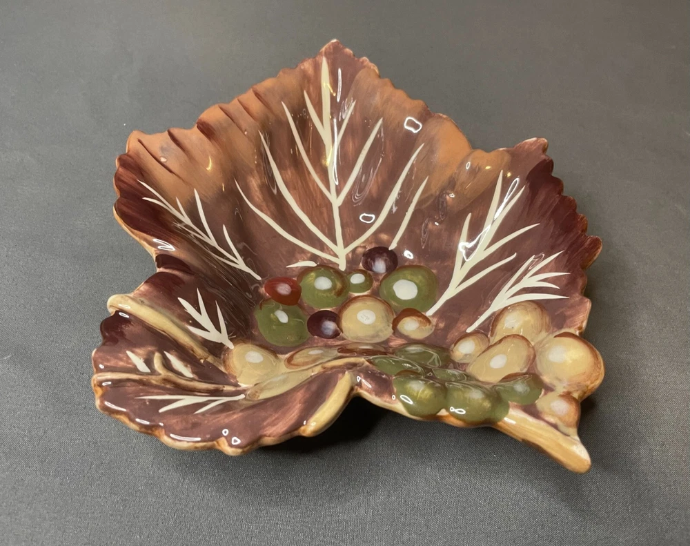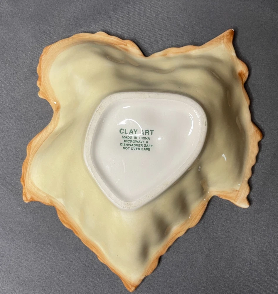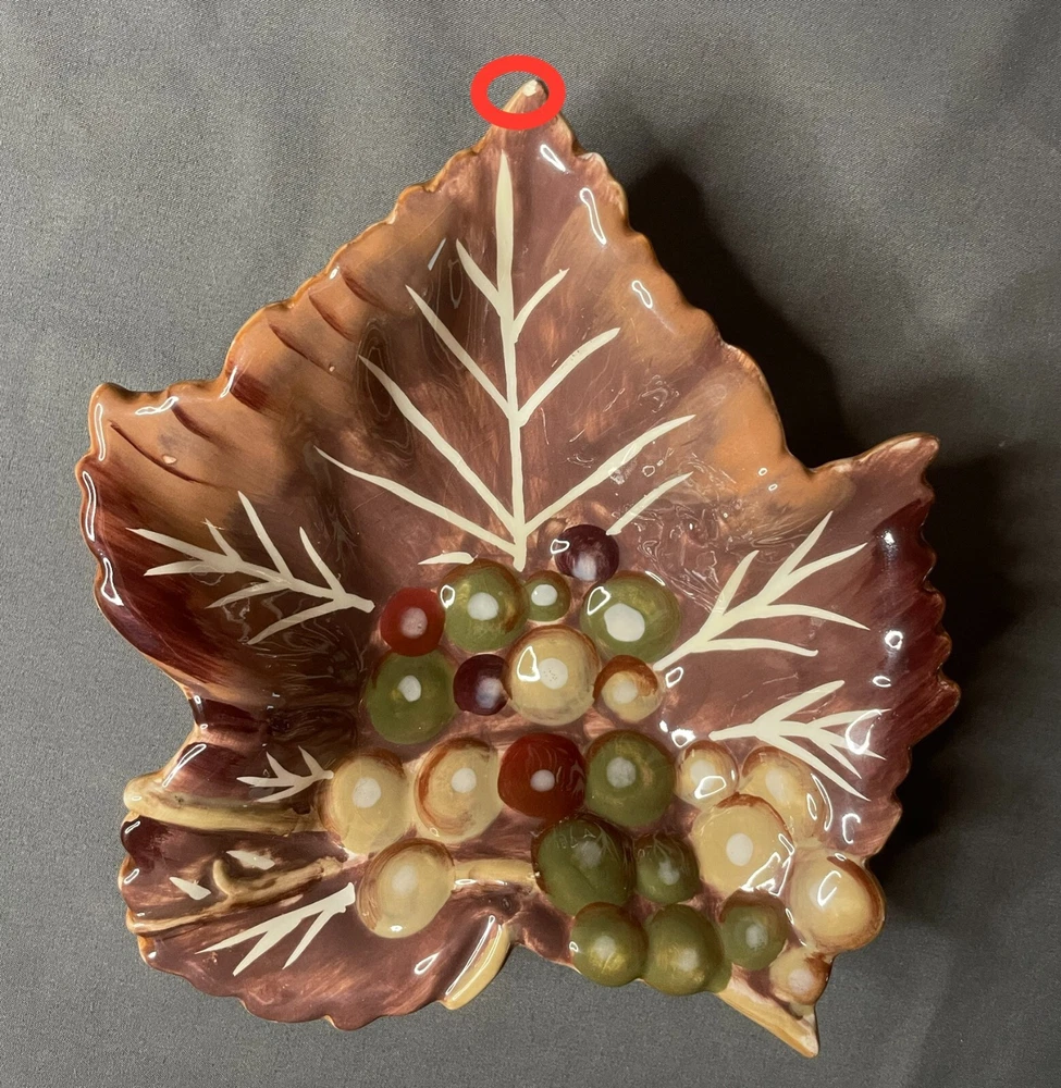 Clay Art StoneLite Vineyard Hand Painted Serving Platter/Tray & Grape Leaf Dip Bowl Large Oval Serving Platter- Pattern: Light brown with grapes and grape leaf design Length: 17.5" Width: 14.25" Depth: 2.5" Material: Ceramic, Stoneware Dishwasher/Microwave Safe Pre owned condition. There is some minor crazing in the middle of the platter and a couple small chips on one side- see photos. Grape Leaf Dip or Olive Bowl: Pattern: Purple textured grape leaf shaped with painted grapes Length: 7.25” Width: 6.5” Depth: 1.5” Material: Ceramic, Stoneware Dishwasher/Microwave Safe There is some minor crazing in the middle of the bowl, and two small chips on the tips of the leaf - see photos.