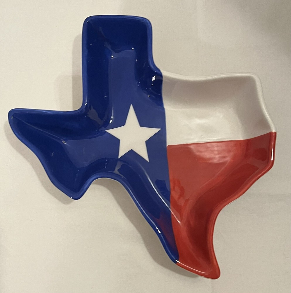 This beautifully crafted chip tray with matching dip bowl by Clay Art is the perfect addition to any kitchen or dining area. The square shape and glossy finish make it a versatile piece for all occasions. The tray features a hand-painted Texas state flag pattern, adding a touch of patriotism to any table setting. Measuring 14 inches in length and width, with a depth of 2 inches, this large chip holder is perfect for serving chips or other small snacks. The tray is made of high-quality ceramic and is recommended to be hand washed. This unique and stylish chip tray is a must-have for any home.