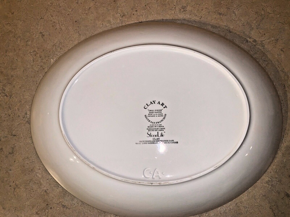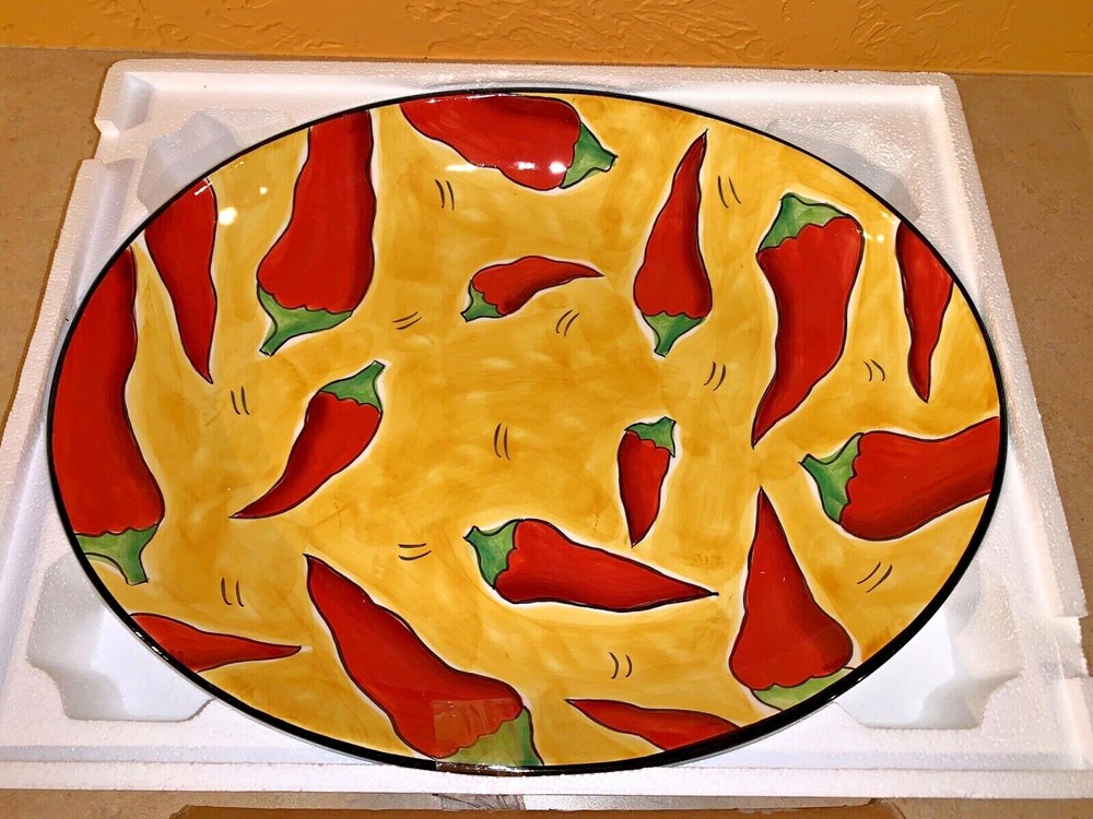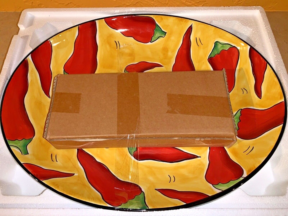 Clay Art Chili Fiesta 2 Pieces Chip & Dip Platter Hand-painted NIB Microwave & Dishwasher Safe Measures 17 1/4" x 13 1/2" New Old Stock - dip bowl still sealed in box You are purchasing this item from Golden Closet LLC. Our items generally come from estates, and we resell them on eBay. We attempt to determine that an item functions properly, and we take photographs to show the item’s condition. We do not refurbish or recondition items. We do a light cleaning of most items. We assume no liability and make no warranty whatsoever for the items we sell. All items are sold “AS IS”. Please review the item description and photos which are an important part of the description. Ask questions to help determine if the item is in the condition you expect. We are not responsible for consequential damages. Your sole recourse against us is to return the item for a refund of your purchase price. We have a 30 day return policy, and require the item be returned in the condition it was in when we sent it to you. Your positive feedback is important to us! Please ask questions, and allow us to address your concerns if you are not completely satisfied.