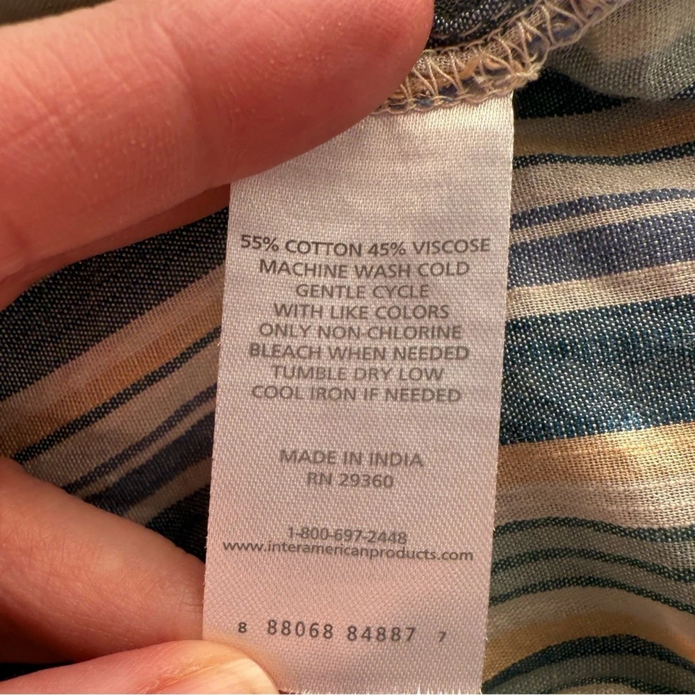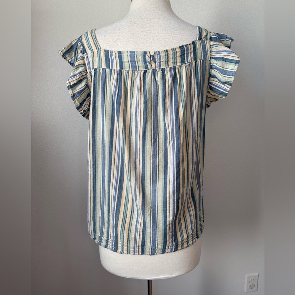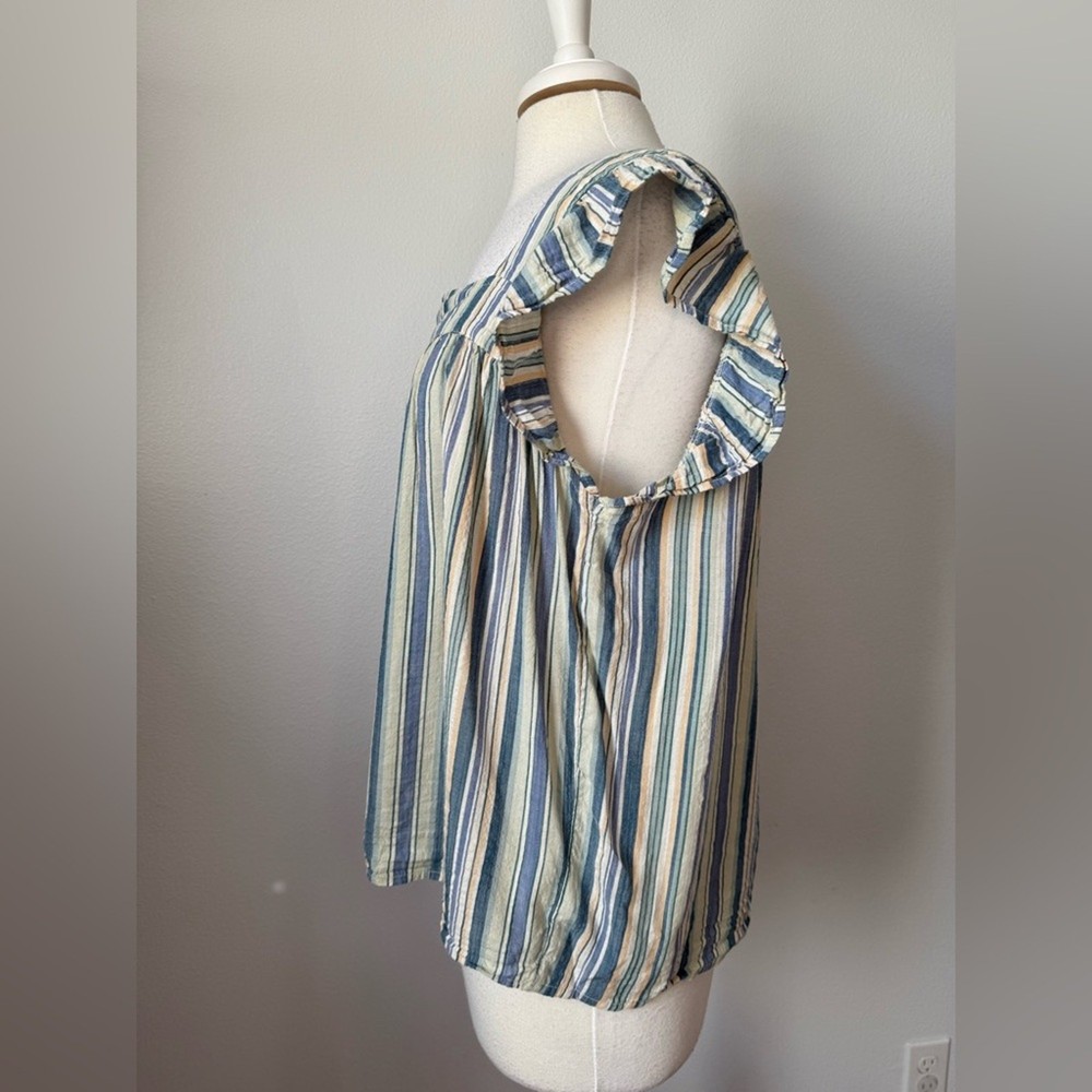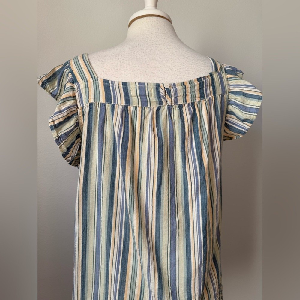 <![CDATA[<div>Excellent Pre-Owned 55% Cotton, 45% Viscose Square Neck Flutter Sleeve Oversized Flowy Small keyhole button closure blue, yellow, white, light green pit to pit- 21.5' length- 24" sleeves- 3" Boho, Bohemian, Coastal, Nautical, Stripes, Beach, Travel, Vacation, Packable, Oversized, Whimsical, Colorful, Rainbow, Fairy, Romantic, Boat, Sea, Cruise, Tropical, Island, Babydoll
