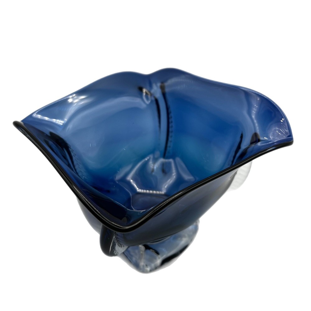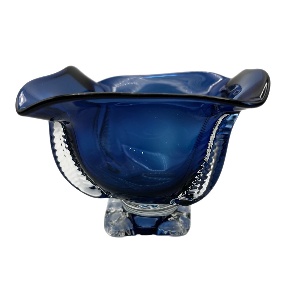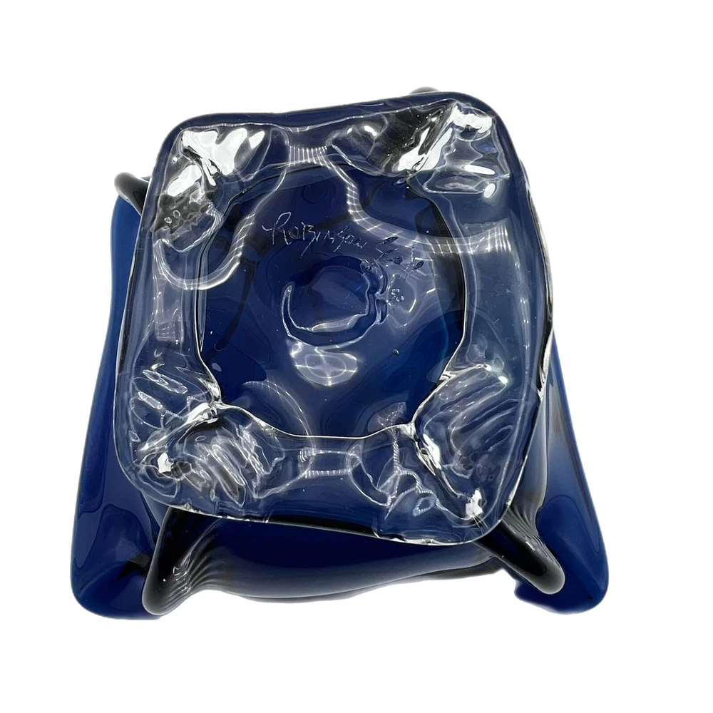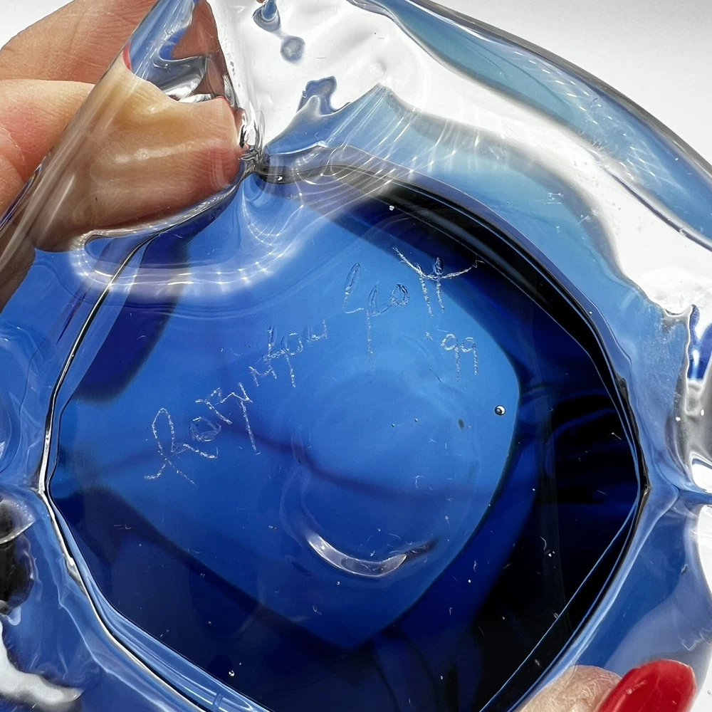 Listed is Cobalt Blue Studio Art Glass Ruffled Pedestal Bowl Signed Robinson Scott 1999. This bowl is in good pre-owned condition with no chips or cracks. There is a scratch measuring about 1/4" on one side as seen in the photos. Please see photos.